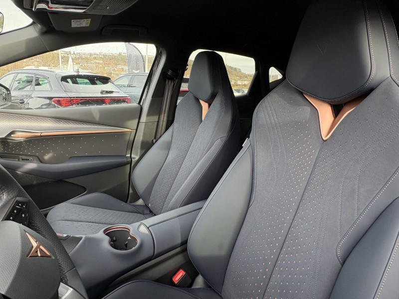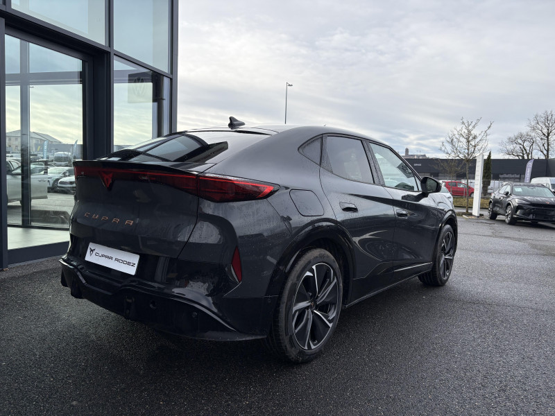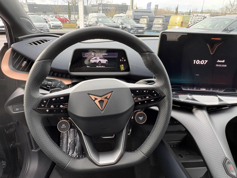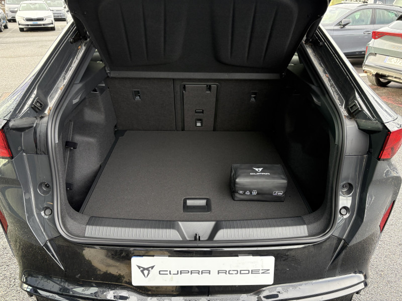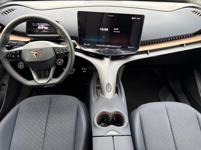 Activation automatique des feux et essuie-glaces / Boîte de vitesse automatique à variation continue / Feux AR LED 3D avec signature lumineuse CUPRA Tri-LED et cligontants défilants / Front Assist - freinage automatique avec détection de piétons et cyclistes / Intelligent Park Assist - système d'aide active au stationnement / Jantes 19" Vulcano usinées / Light Assist - feux de route automatiques / Logo CUPRA avec contour LED blanc à l'AV / Pack Ambient Light M / Projecteurs AV EcoLED avec signature lumineuse CUPRA Tri-LED / Pré-installation pour attelage / Pédalier sport aluminium / Remote Park Assist - système de stationnement à distance / Système de navigation connecté sur écran tactile HD 15" / Alarme antivol / Bandeau Infinite Light à l'AR intégrant le logo CUPRA illuminé en rouge / Connectivité "Car2X" + ChatGPT / Connectivité 4x USB-C et Bluetooth / Console centrale à architecture flottante intégrant la Connectivity Box / Contrôle de la traction (TCS) / CUPRA Box / CUPRA Connect Plus 3 ans / CUPRA Drive Profile / Câble de recharge Mode 3 Type 2 32A 5,65 m jaune / Cérémonie de bienvenue au déverrouillage du véhicule / Direction dynamique / Détection de fatigue et somnolence / Ecrous de roues antivol / Emergency Assist - arrêt d'urgence / ESC / Exit Assist - freinage anticollision AR / Exit Warning - alerte d'ouverture de portière / Full Link sans fil ( Android Auto + Apple CarPlay) / Grille de calandre, arches de roues, bas de caisses, bas de pare-choc AR et coques de rétroviseurs en couleur contrastante / Générateur de son intérieur CUPRA (actif lorsque le mode Performance ou CUPRA est sélectionné) / Hayon électrique mains-libres ''Virtual Pedal'' / Indicateur de pression des pneumatiques / Keyless Advance - accès et démarrage sans clef avec poignées illuminées / Kit d'outillage de secours / Kit de sécurité CUPRA / Lettrage CUPRA cuivréà l'AV et l'AR / Mesures de protection des piétons étendues avec capot actif / Pare-brise athermique et vitres AR surteintées / Pneumatiques auto-colmatants / Pre-Crash Assist - système de préparation en cas de collision / Rétroviseur intérieur électrochrome / Rétroviseurs extérieurs électriques, chauffants et rabattables électriquement (asphérique conducteur) / Side Assist - surveillance d'angles morts / Système de fixation i-Size + 3x Top-Tether / Tapis de sol premium coordonnés à la sellerie / Travel Assist - système de conduite semi-autonome / Volant Supersports CUPRA soft touch multifonction tactile chauffant avec palettes de gestion de la récupération d'énergie / Welcome Light - projection du logo CUPRA au sol