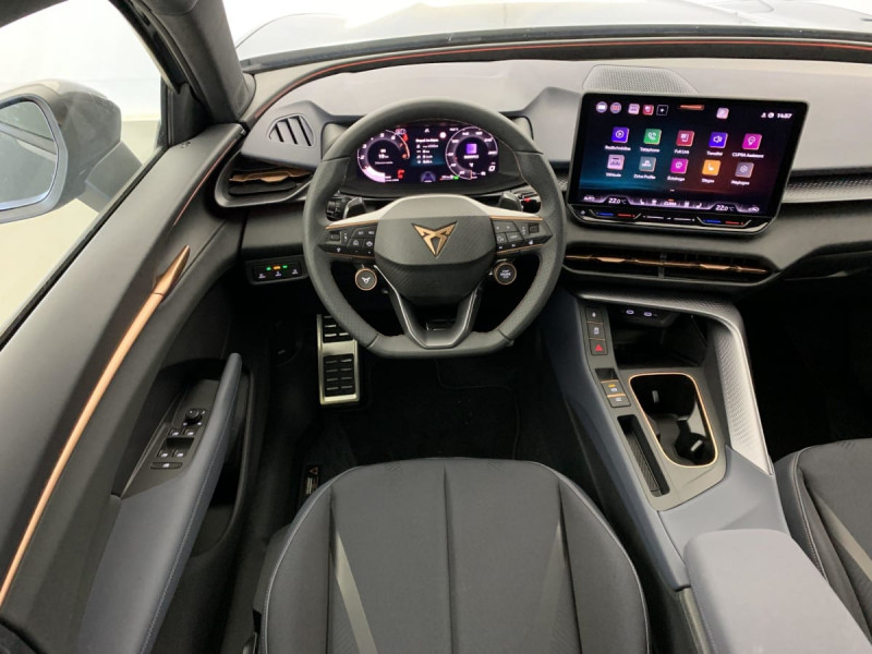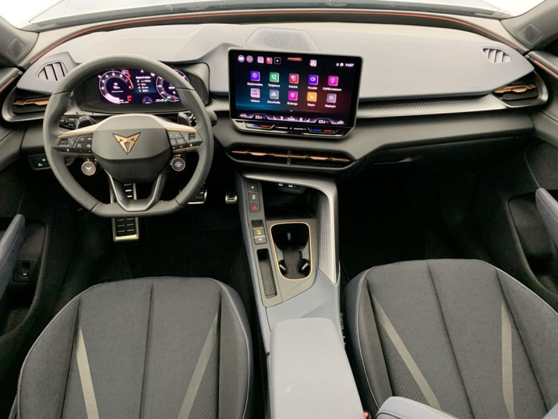 Rétroviseurs extérieurs réglables, rabatable électriquement, dégivant , avec abaissement passager avant / Hayon électrique mains-libres ''Virtual Pedal'' / Seuils de porte CUPRA rétro-éclairés / Connectivity Box avec chargeur à induction / Ciel de pavillon Noir / Eclairage de bienvenue avec projection du logo CUPRA au sol / Fixations ISOFIX avec Top-Tether à l'AR / Direction dynamique / Rétroviseur intérieur électrochrome / Airbags latéreaux, rideaux et central / Smart Ambient Light (éclairage d'ambiance intérieur intelligent) / Kit de sécurité CUPRA / Peinture vernie / Full Link sans fil ( Android Auto + Apple CarPlay) / Connectivité 4x USB-C et Bluetooth / Projecteurs full LED avec signature lumineuseTri-LED / Détection de fatigue et somnolence / Bandeau AR ''Infinite Light'' intégrant le logo CUPRA lumineux avec signature lumineuse Tri-LED et cérémonie de bienvenue / Volant Supersports CUPRA en cuir avec boutons satellites, chauffant avec palettes de changement de rapport / Système d'info-divertissement avec écran tactile HD 12,9'' et touches de commandes tactiles rétro-éclairées / Front Assist avec détection des piétons et cyclistes / Design Intérieur Deep Ocean (sièges baquets TEP + textile Bleu Acier) - Logos CUPRA estampés sur les appuie-têtes - Planche de bord bleu acier texturée avec aérateurs cuivrés - Contre-portes en TEP noir texturé - Ciel de pavillon noir - Sièges conducteur et passager avec réglage manuel en hauteur et lombaire / Projecteurs anti-brouillard avec éclairage d'intersection et éclairage d'accompagnement / Alarme antivol avec fonction SAFE / Rails de toit Noir / Système audio à 9 HP avec contrôle vocal / Aide au maintien dans la voie (Lane Assist) / Accès et démarrage mains-libres / Digital Cockpit 10,25" simple avec 2 affichages personnalisables /