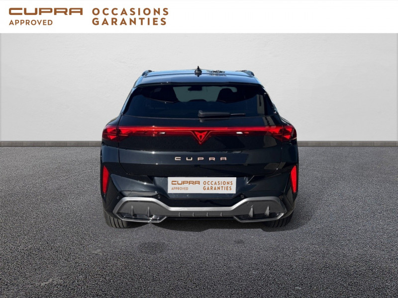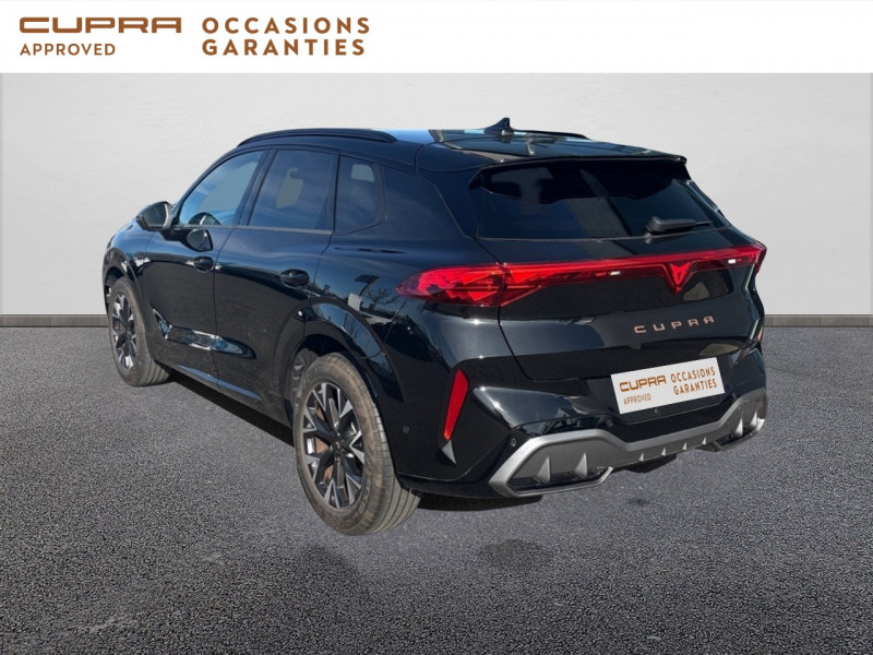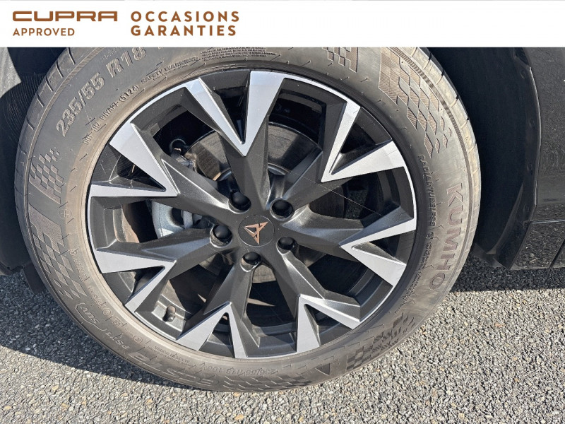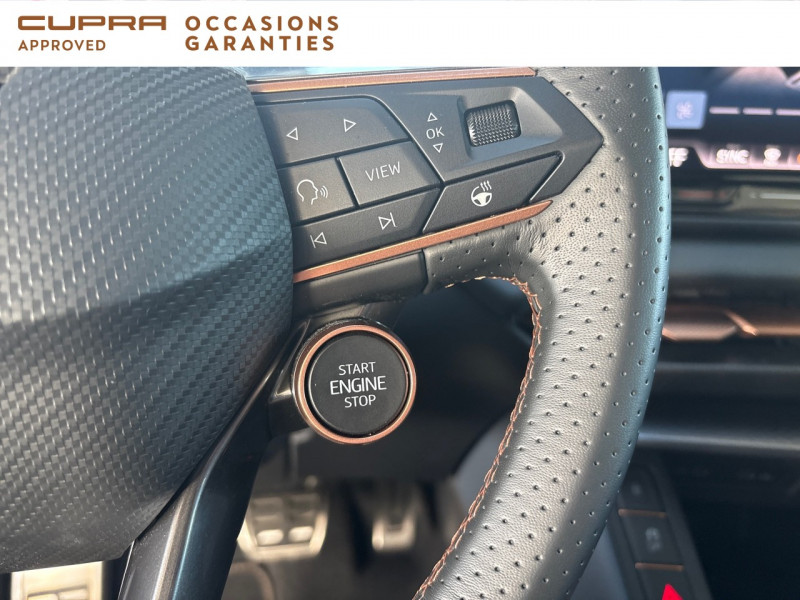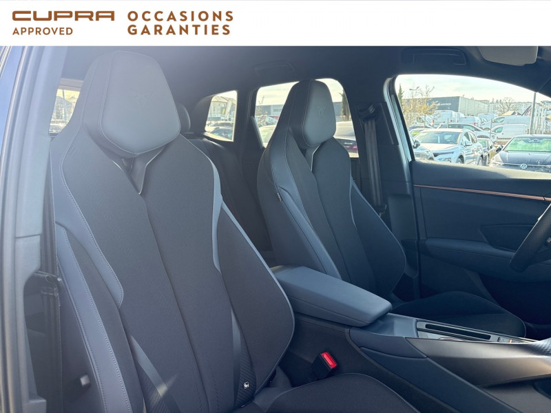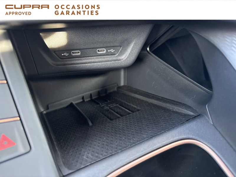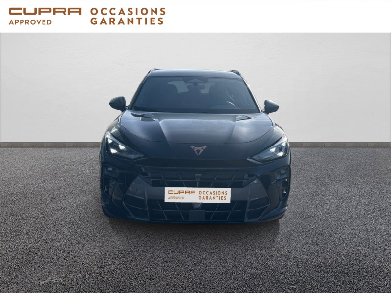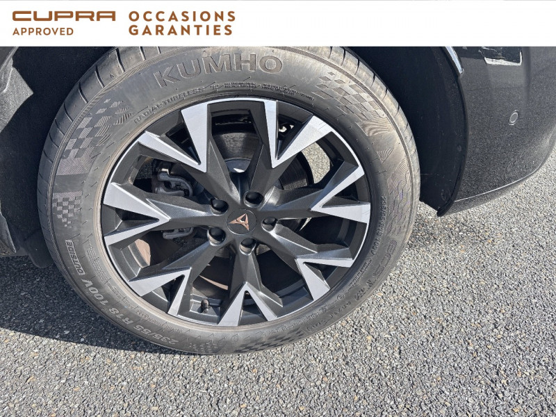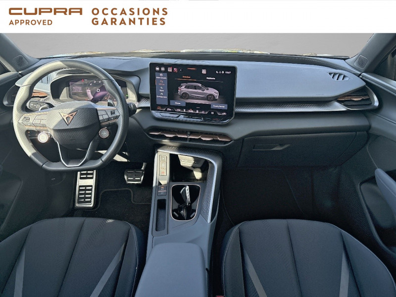 Aide au maintien dans la voie (Lane Assist) / Bandeau AR ''Infinite Light'' intégrant le logo CUPRA lumineux, avec signature lumineuse Tri-LED et cérémonie de bienvenue / Jantes 18'' Atomic anthracites / Lampes de lecture LED à l'AV et à l'AR / Projecteurs full LED avec signature lumineuseTri-LED / Volant Supersports CUPRA en cuir avec boutons satellites, chauffant, avec palettes de changement de rapport / Accès et démarrage mains-libres / Alarme antivol avec fonction SAFE / Boîte de vitesse automate sequentiel à 7 vitesses / Ciel de pavillon Noir / Connectivity Box avec chargeur à induction / Connectivité 4x USB-C et Bluetooth / Contrôle de la traction (TCS) / CUPRA Box / CUPRA Connect / Digital Cockpit 10,25" simple avec 2 affichages personnalisables / Direction dynamique / Détection de fatigue et somnolence / Eclairage de bienvenue avec projection du logo CUPRA au sol / ESC / Fixations ISOFIX avec Top-Tether à l'AR / Front Assist avec détection des piétons et cyclistes / Full Link sans fil ( Android Auto + Apple CarPlay) / Hayon électrique mains-libres ''Virtual Pedal'' / Kit de sécurité CUPRA / Pare-choc ton caisse avec extracteur de couleur contrastante / Pare-soleils avec miroirs de courtoisie éclairés / Projecteurs anti-brouillard triangulaires avec éclairage d'intersection et éclairage d'accompagnement / Rails de toit Noir / Rétroviseur intérieur électrochrome / Seuils de porte CUPRA rétro-éclairés / Smart Ambient Light (éclairage d'ambiance intérieur intelligent) / Système audio à 9 HP avec contrôle vocal / Système d'info-divertissement avec écran tactile HD 12,9" et touches de commandes tactiles rétro- éclairées / Tapis de sol en matière recyclée