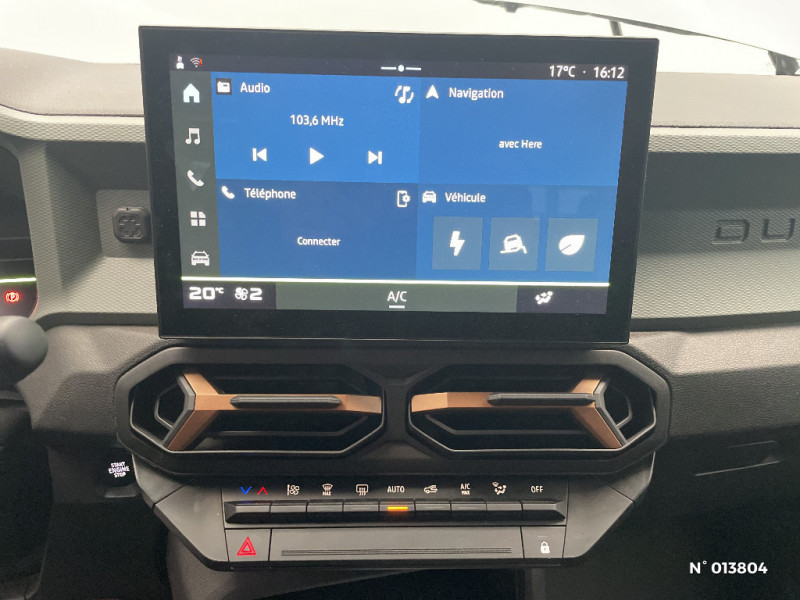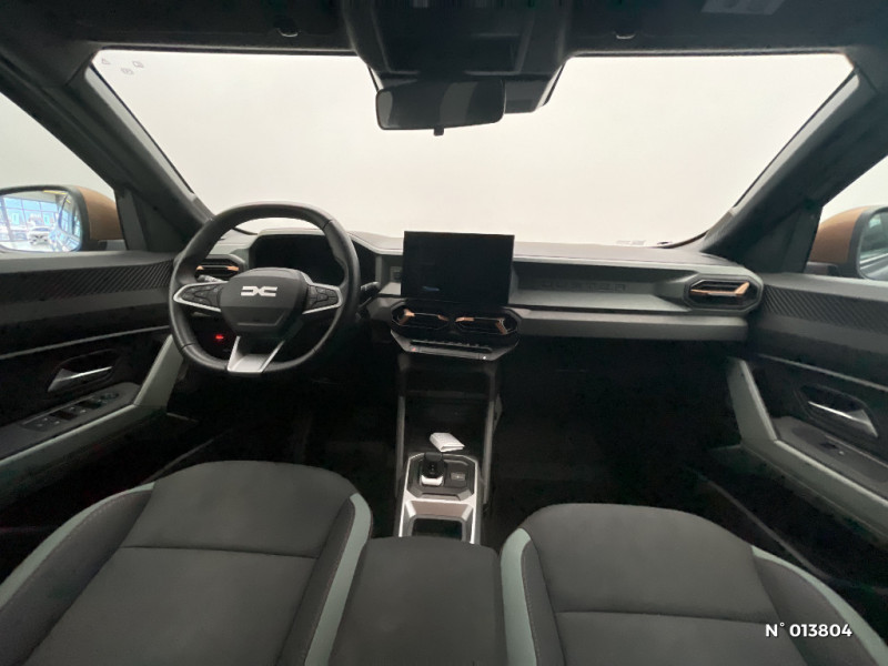 Boucliers ton carosserie / Système de freinage d'urgence avancé (piéton, deux-roues et intersection) / Système de contrôle de traction (TCS) / Boîte de vitesse automatique 6 / Rétroviseurs extérieurs électriques, dégivrants et rabattable automatiquement / Peinture opaque / Ouverture du hayon manuelle / My Safety Switch (bouton de déconnexion des aides à la conduite) / Sellerie TEP "Microcloud"avec logo Dacia / Media Display (écran 10,1'',4 HP, réplication smartphone sans fil, services connectés) / Coques de rétroviseurs Brun Cuivré / Tableau de bord numérique 7" / Antenne radio 30cm / Jantes alliage semi-diamantées 17'' TERGAN / Contrôle de trajectoire en descente avancé / Sans rangement coffre / Répétiteurs latéraux à LED / Alerte franchissement de ligne et assistant maintien dans la voie / Kit de gonflage / Allumage des feux automatique et essuie-glace automatiques / Commutation automatique feux de croisement/route / Feux de croisement à LED / Siège passager réglable en hauteur + lombaire conducteur / Appel SOS (E-call) / Avertissement distance de sécurité / Signature lumineuse en "Y" à LED / Console centrale semi haute avec accoudoir