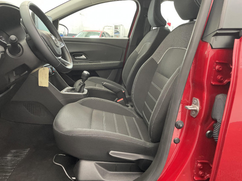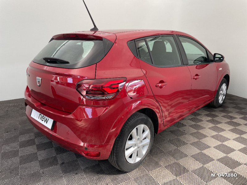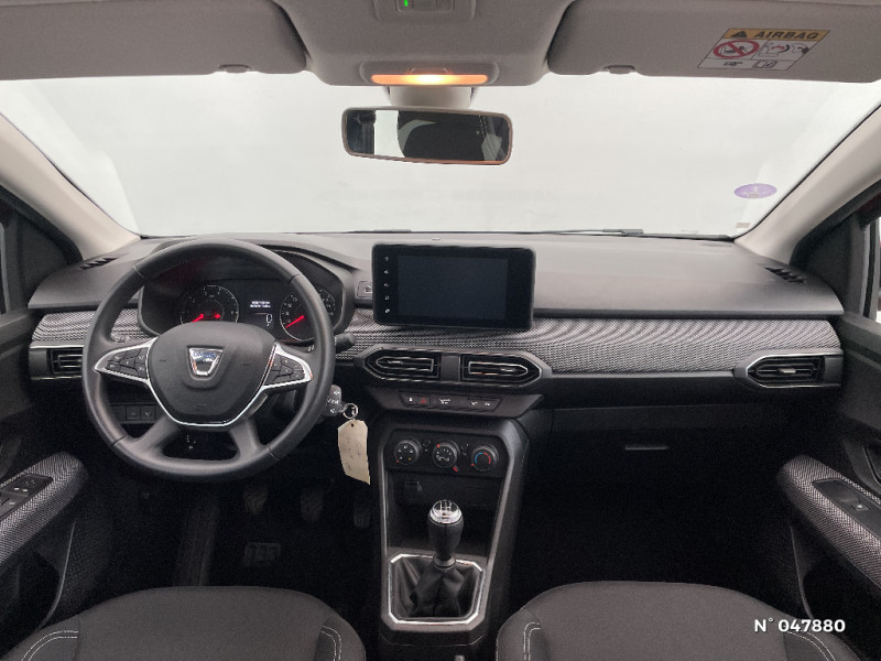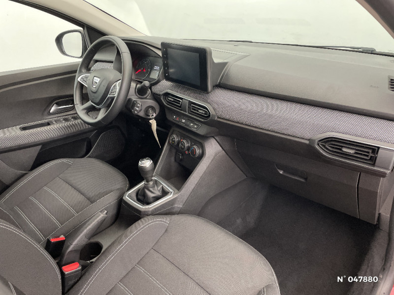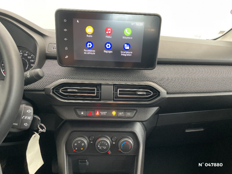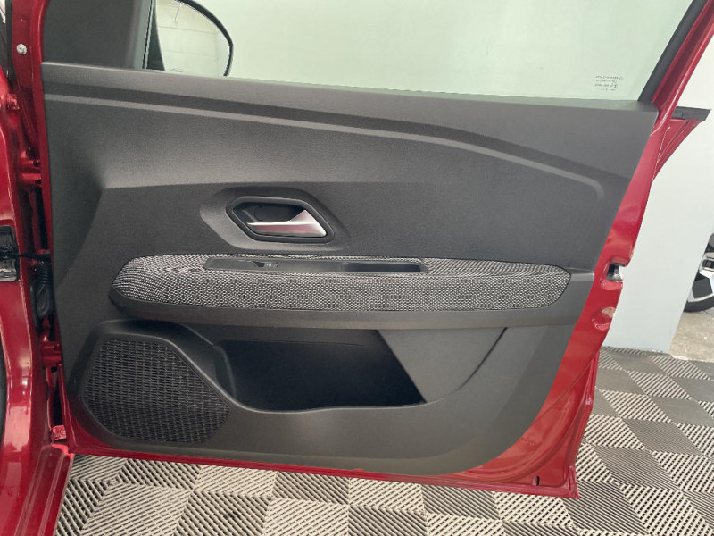 Signature lumineuse DACIA en Y à LED / Rappel de bouclage de ceintures / Media display (écran 8'', réplication smartphone, 4 haut-parleurs, 1 port USB) / Clé 3 boutons / Console basse + rangement ouvert / Cluster TFT / Fonction éco-mode / Kit de gonflage / Rétroviseurs extérieurs ton carrosserie / Système de freinage d'urgence autonome à des vitesses interurbaines 7-170km/h / Alternateur renforcé / Classes énergetiques B / Enjoliveur 15'' Sorane / Harmonie intérieur / Sellerie confort avec surpiqures / Volant Soft Feel TEP / Airbag latéral avant : thorax + rideau / Feux arrières avec signature lumineuse Y / Roues tôle 15"
