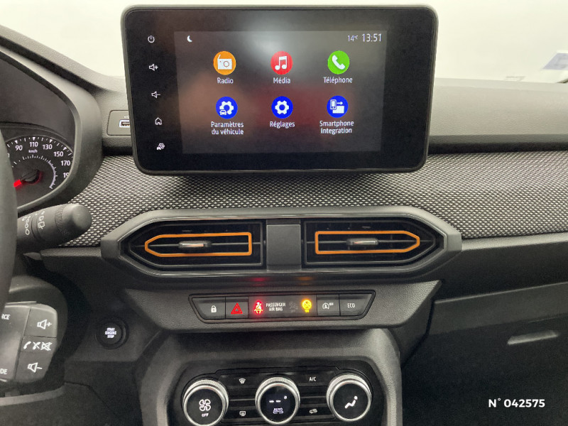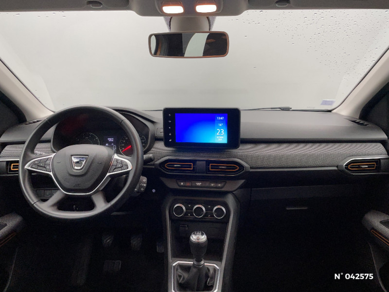 Kit de gonflage / Peinture opaque / Alerte d'oubli de bouclage des ceintures de sécurité / Clé 3 boutons / Console basse + rangement ouvert / Cluster TFT / Enjoliveur 16'' Saria - Stepway / Harmonie intérieur / Phares de jour LED avec signature lumineuse Y / Projecteurs Full LED avec signature lumineuse Y / Sellerie Stepway avec surpiqures / Volant Soft Feel TEP / Airbag latéral avant : thorax + rideau / Feux arrières avec signature lumineuse Y / Système de freinage d'urgence autonome à des vitesses interurbaines 30-140km/h / Media display (écran 8'', réplication smartphone, 4 haut-parleurs, 1 port USB, 1 support téléphone) / Signature lumineuse DACIA en Y à LED / Rappel de bouclage de ceintures / Fonction éco-mode / Rétroviseurs extérieurs ton carrosserie