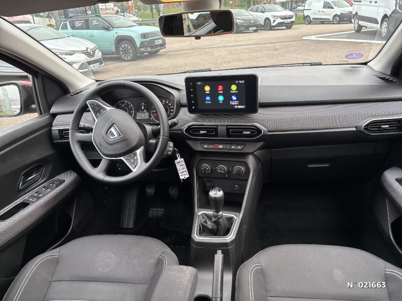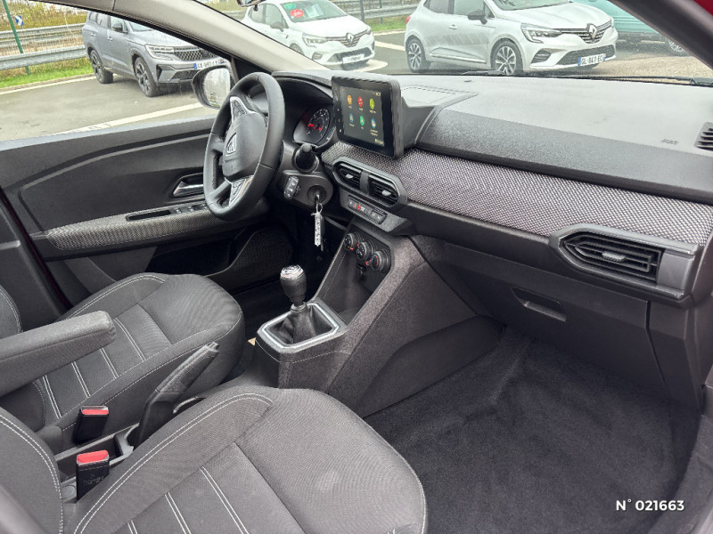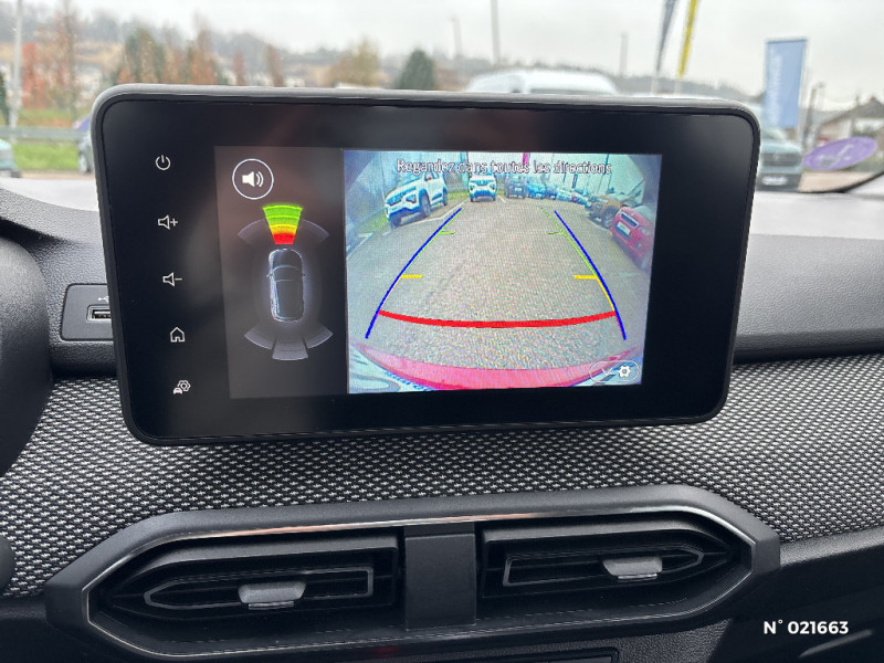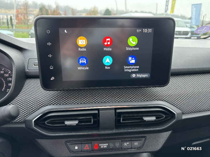Fonction éco-mode / Kit de gonflage / Rétroviseurs extérieurs ton carrosserie / Peinture opaque / Roues tôle 15" / Clé 3 boutons / Console basse + rangement ouvert / Cluster TFT / Enjoliveur 15'' Sorane / Harmonie intérieur / Sellerie confort avec surpiqures / Volant Soft Feel TEP / Airbag latéral avant : thorax + rideau / Feux arrières avec signature lumineuse Y / Signature lumineuse DACIA en Y à LED / Rappel de bouclage de ceintures / Media display (écran 8'', réplication smartphone, 4 haut-parleurs, 1 port USB) / Système de freinage d'urgence autonome à des vitesses interurbaines 7-170km/h / Alternateur renforcé / Classes énergetiques B