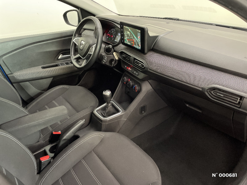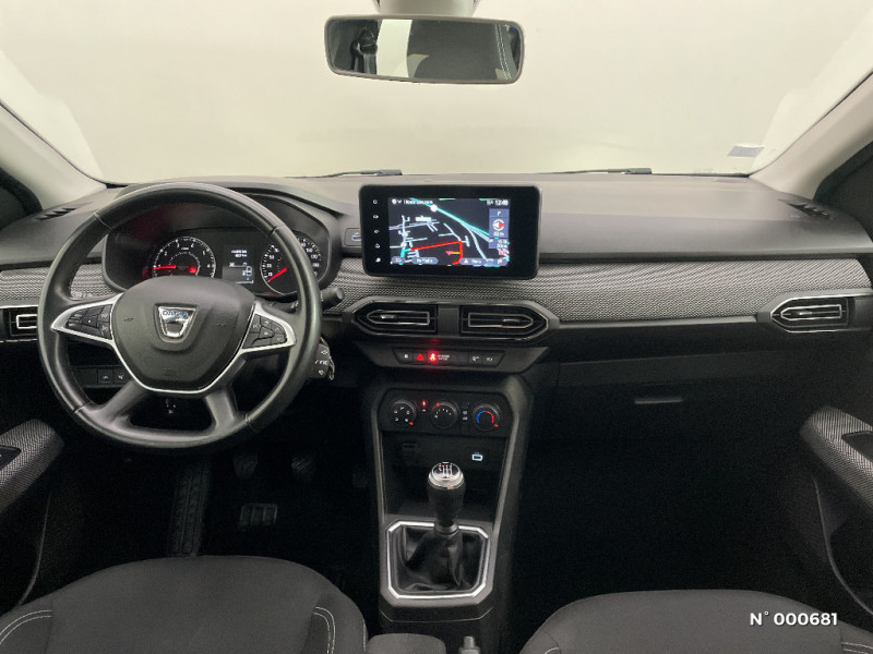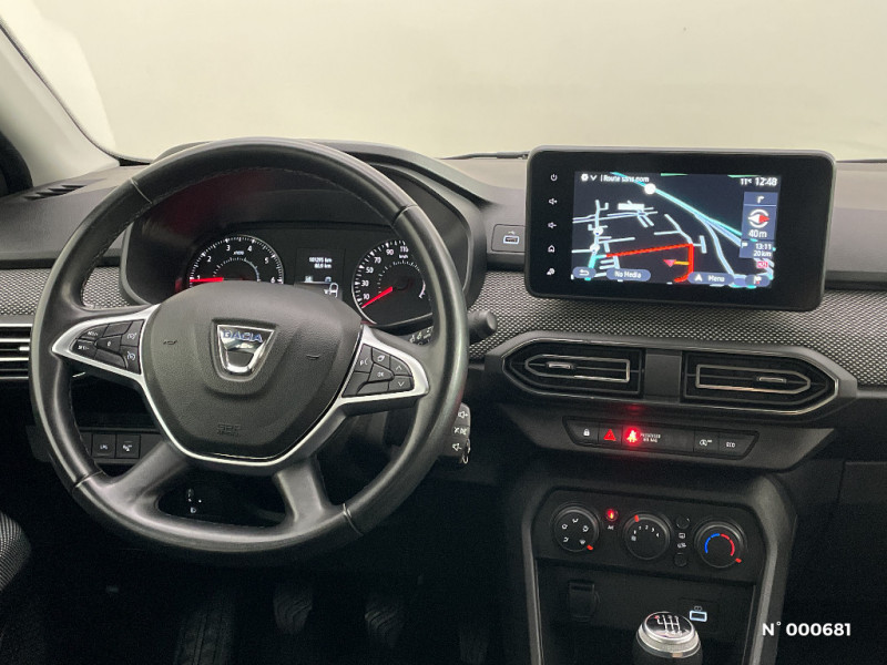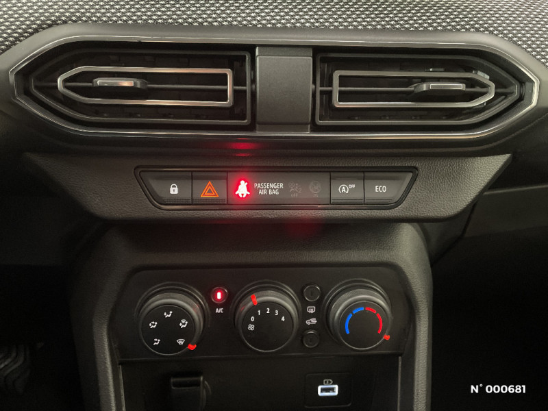 Rappel de bouclage de ceintures / Fonction éco-mode / Kit de gonflage / Rétroviseurs extérieurs ton carrosserie / Alerte d'oubli de bouclage des ceintures de sécurité / Clé 3 boutons / Console basse + rangement ouvert / Cluster TFT / Enjoliveur 16'' Saria / Harmonie intérieur / Sellerie confort avec surpiqures / Volant Soft Feel TEP / Airbag latéral avant : thorax + rideau / Feux arrières avec signature lumineuse Y / Système de freinage d'urgence autonome à des vitesses interurbaines 30-140km/h / Media display (écran 8'', réplication smartphone, 4 haut-parleurs, 1 port USB, 1 support téléphone) / Signature lumineuse DACIA en Y à LED