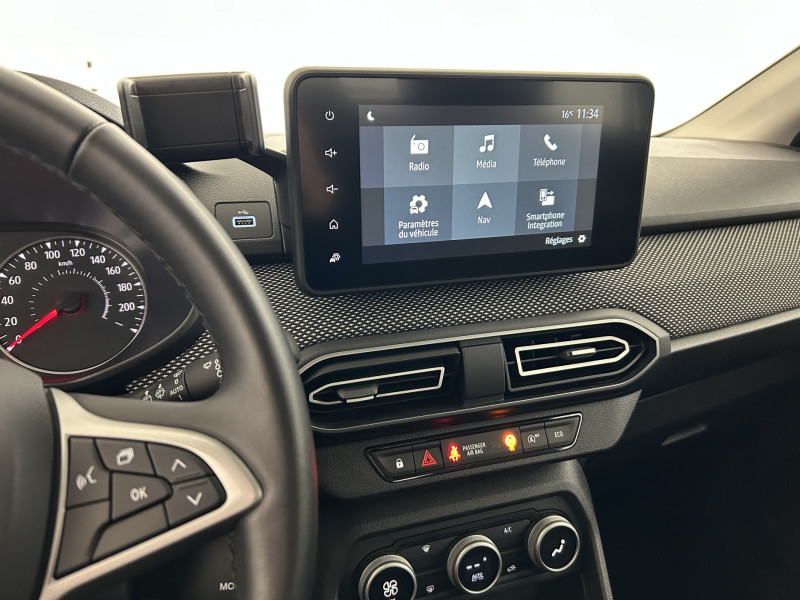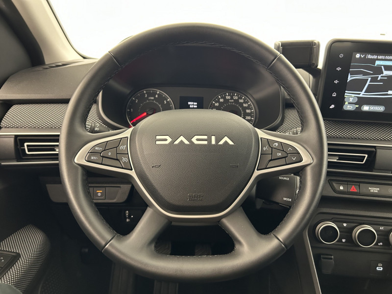 Airbag latéral AV : thorax + rideau / Alerte franchissement de ligne et assistant maintien dans la voie / Antenne requin / Boîte de vitesse manuelle 5 / Console basse + rangement ouvert / Eclairage du coffre / ESP+ASR / Feux AR avec signature lumineuse Y / Fonction éco-mode / Jantes 16'' RANDIA / Kit de gonflage / Media Display (écran tactile 8'' sans navigation, radio, réplication smartphone USB, 4 haut-parleurs audiostreaming Bluetooth, satellite de commandes au volant, 1 prise USB-A et 1 prise USB-C) / Plancher de coffre double niveau / Prédisposition Ethylotest / Rappel de bouclage de ceintures / Sellerie avec surpiqures grises / Signature lumineuse DACIA en Y à LED / Système de freinage d'urgence avancé (pieton, deux-rorues et intersection) / Tableau de bord avec écran numérique 3,5'' et compteurs analogiques / Volant Soft Feel TEP /