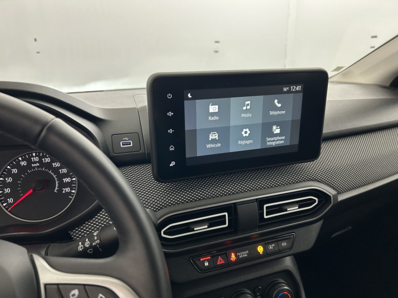 Airbag latéral AV : thorax + rideau / Clé 3 boutons / Console basse + rangement ouvert / Eclairage du coffre / Enjoliveur 15'' Sorane / Feux AR avec signature lumineuse Y / Fonction éco-mode / Kit de gonflage / Media display (écran 8'', réplication smartphone, 4 haut-parleurs, 1 port USB) / Nouvelle identité visuelle / Rappel de bouclage de ceintures / Rétroviseurs extérieurs ton carrosserie / Sellerie avec surpiqures grises / Signature lumineuse DACIA en Y à LED / Système de freinage d'urgence autonome à des vitesses interurbaines 7-170km/h / Tableau de bord avec écran numérique 3,5'' et compteurs analogiques / Volant Soft Feel TEP /