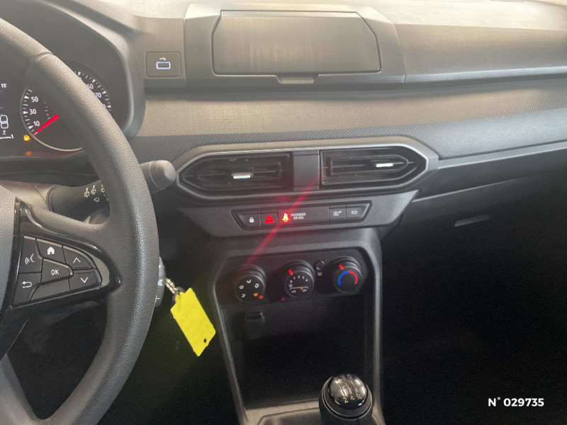 Volant mousse / Fonction éco-mode / Kit de gonflage / Lève-vitres AR manuels / Peinture opaque / Chauffage avec recyclage d'air / Clé 3 boutons / Console basse + rangement ouvert / Cluster TFT / Sellerie essentiel / Media control (Streaming audio bluetooth avec support téléphone, 2 haut-parleurs, 1 USB) / Airbag latéral avant : thorax + rideau / Feux arrières avec signature lumineuse Y / Signature lumineuse DACIA en Y à LED / Rappel de bouclage de ceintures / Système de freinage d'urgence autonome à des vitesses interurbaines 7-170km/h / Nouvelle identité visuelle / Enjoliveur 15'' Elma / Roues tôle 15"