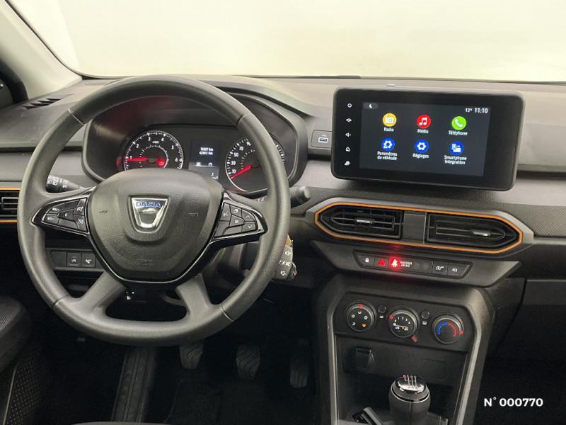 Clé 3 boutons / Console basse + rangement ouvert / Cluster TFT / Enjoliveur 16'' Saria - Stepway / Harmonie intérieure / Sellerie Stepway avec surpiqures / Media control (Streaming audio bluetooth avec support téléphone, 2 haut-parleurs, 1 USB) / Airbag latéral avant : thorax + rideau / Feux arrières avec signature lumineuse Y / Signature lumineuse DACIA en Y à LED / Rappel de bouclage de ceintures / Système de freinage d'urgence autonome à des vitesses interurbaines 7-170km/h / Alternateur renforcé / Volant mousse / Fonction éco-mode / Kit de gonflage / Lève-vitres AR manuels / Peinture opaque / Classes énergetiques B