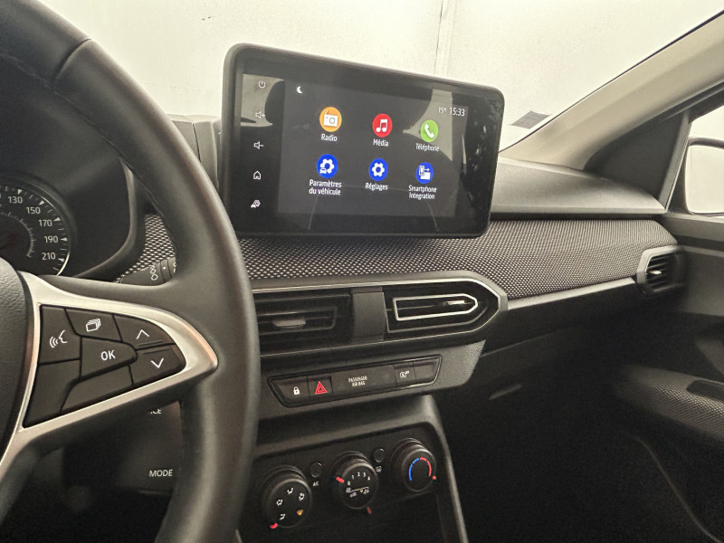 Airbag latéral AV : thorax + rideau / Alternateur renforcé / Classes énergetiques B / Clé 3 boutons / Cluster TFT / Console basse + rangement ouvert / Enjoliveur 15'' Sorane / Feux AR avec signature lumineuse Y / Harmonie intérieure / Kit de gonflage / Media display (écran 8'', réplication smartphone, 4 haut-parleurs, 1 port USB) / Rappel de bouclage de ceintures / Rétroviseurs extérieurs ton carrosserie / Roues tôle 15" / Sellerie Confort avec surpiqures / Signature lumineuse DACIA en Y à LED / Système de freinage d'urgence autonome à des vitesses interurbaines 7-170km/h / Volant Soft Feel TEP /