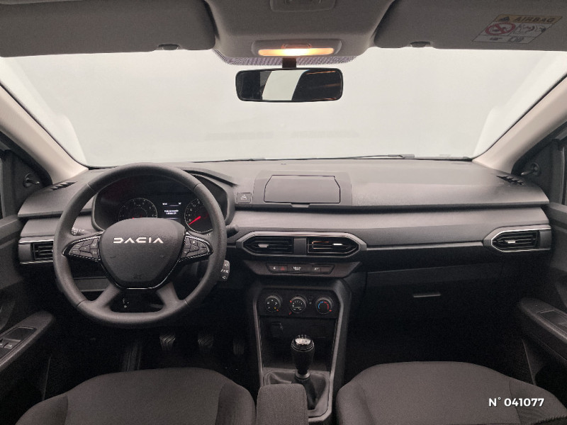 Kit de gonflage / Lève-vitres AR manuels / Chauffage avec recyclage d'air / Clé 3 boutons / Console basse + rangement ouvert / Cluster TFT / Sellerie essentiel / Media control (Streaming audio bluetooth avec support téléphone, 2 haut-parleurs, 1 USB) / Airbag latéral avant : thorax + rideau / Feux arrières avec signature lumineuse Y / Signature lumineuse DACIA en Y à LED / Rappel de bouclage de ceintures / Volant mousse / Système de freinage d'urgence autonome à des vitesses interurbaines 7-170km/h / Nouvelle identité visuelle / Enjoliveur 15'' Elma / Roues tôle 15"
