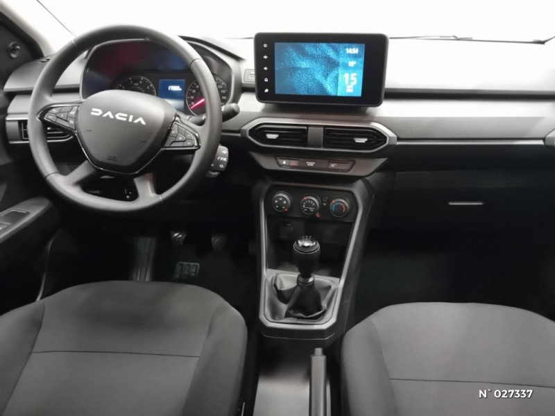 Kit de gonflage / Lève-vitres AR manuels / Chauffage avec recyclage d'air / Clé 3 boutons / Console basse + rangement ouvert / Cluster TFT / Sellerie essentiel / Media control (Streaming audio bluetooth avec support téléphone, 2 haut-parleurs, 1 USB) / Airbag latéral avant : thorax + rideau / Feux arrières avec signature lumineuse Y / Signature lumineuse DACIA en Y à LED / Rappel de bouclage de ceintures / Système de freinage d'urgence autonome à des vitesses interurbaines 7-170km/h / Nouvelle identité visuelle / Enjoliveur 15'' Elma / Roues tôle 15" / Volant mousse