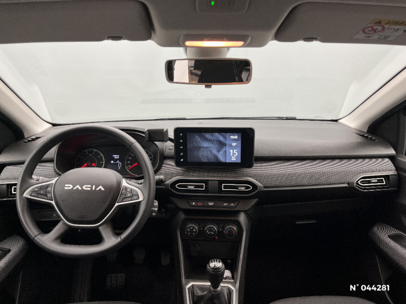 Roues tôle 15" / Enjoliveur 15'' Sorane / Alternateur renforcé / Nouvelle identité visuelle / Fonction éco-mode / Kit de gonflage / Rétroviseurs extérieurs ton carrosserie / Peinture opaque / Clé 3 boutons / Console basse + rangement ouvert / Cluster TFT / Sellerie confort avec surpiqures / Volant Soft Feel TEP / Airbag latéral avant : thorax + rideau / Feux arrières avec signature lumineuse Y / Signature lumineuse DACIA en Y à LED / Rappel de bouclage de ceintures / Media display (écran 8'', réplication smartphone, 4 haut-parleurs, 1 port USB) / Système de freinage d'urgence autonome à des vitesses interurbaines 7-170km/h