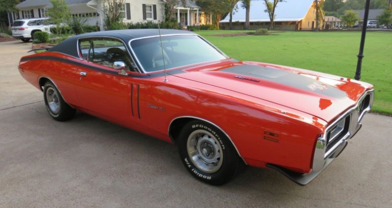 1971 Dodge Charger R/T 440 Magnum, Orange exterior, Black interior, 61, 031 miles, matching numbers car, collector grade condition, runs and drives great, original books/manual, Hemi Orange paint, front and rear spoilers, Torque Flight 3-speed automatic transmission, R/T Performance Package, bucket seats, factory center console w/T-handle shifter, Originated in Arizona, no rust, climate-controlled garage in the South since, featured in Mopar's Collector Guide with magazine article, no dealer fees, no doc fees, no surprises.. Provenance : Arkansas. Disponibilité : environ 7 semaines, clés en main. 62 000 € tout compris (importation, taxes, procédure d'immatriculation). Annonce publiée le 24/11/2025