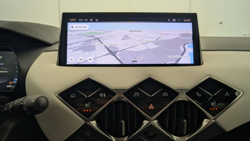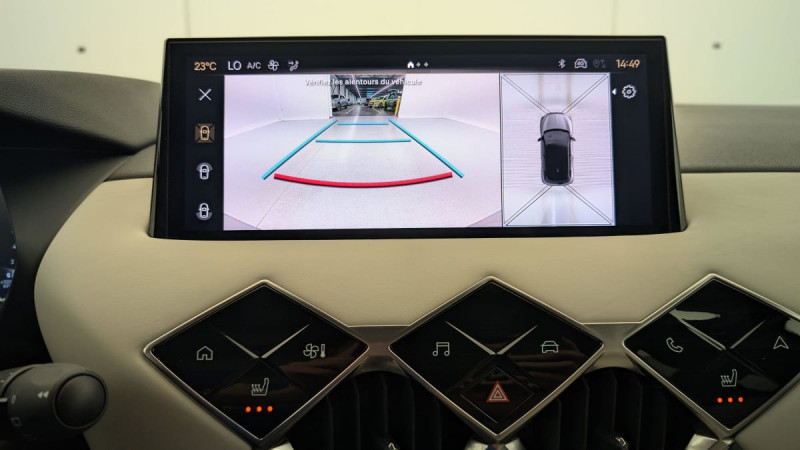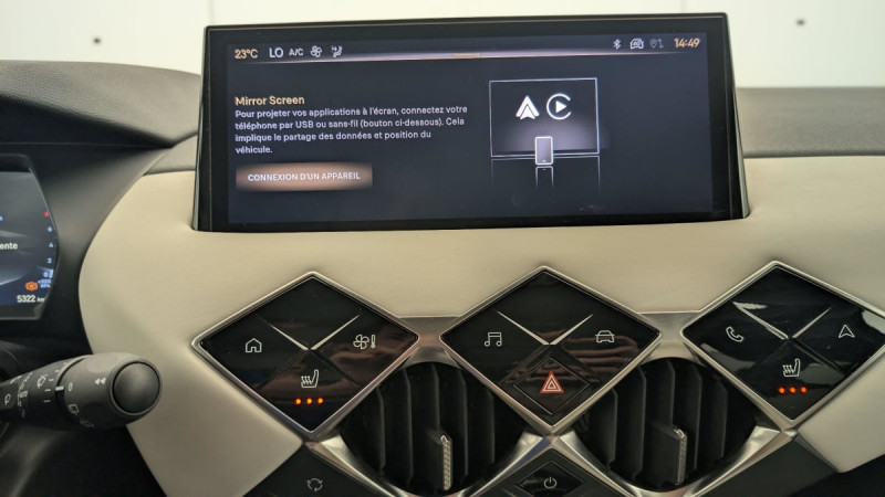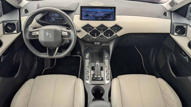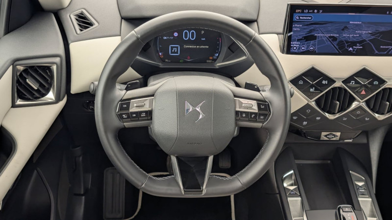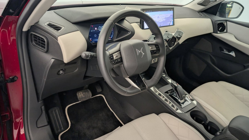 kit anti crevaison / Double canule d'échappement chromée / Prise USB Data à l'AV / Fixations ISOFIX à la place passager AV et aux places latérales AR / Pare-brise teinté et acoustique / Contrôle dynamique de stabilité (ESP) avec antipatinage des roues (ASR) / Combiné numérique / Détection de sous-gonflage / Essuie-vitre AV à déclenchement et cadencement automatiques / Réhausse manuelle de siège conducteur / SOS & Assistance Service inclus pendant 10 ans / Poignées de portes affleurantes / Intérieur Tissu Luxembourg avec cuir Nappa Gris Galet : Ciel de pavillon Gris Galet Volant Cuir fleur Décor Toile DS Gris Galet confection diamant Siège Tissu Luxembourg avec Cuir Nappa Gris Galet Planche de bord en Cuir Nappa Gris Galet / Frein de stationnement électrique automatique / Freinage d'urgence automatique piloté par caméra / Eclairage d'accueil et d'accompagnement / Eclairage de cave à pieds à LED / Mirror Screen sans fil via Wifi Compatible Apple CarPlay et Android Auto / Accès et démarrage mains libres Proximity / Airbags frontaux (passager déconnectable), latéraux AV et AR, rideaux AV et AR / Ecran tactile capacitif 10,3" HD / Lève-vitres AV et AR électriques et séquentiels Antipincement côté conducteur et sécurité enfant / DS IRIS SYSTEM avec Navigation 3D Connectée DS IRIS System intègre la Navigation Connectée / Réhausse manuelle du siège passager / Pare-soleils avec miroirs de courtoisie occultables éclairés à LED / Advanced Traction Control (Système de gestion de l'adhérence sur tout type de route) / ABS avec répartiteur électronique de freinage (REF) et Aide au Freinage d'Urgence (AFU) et ESP + Aide au démarrage en pente /
