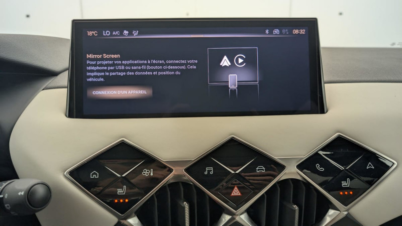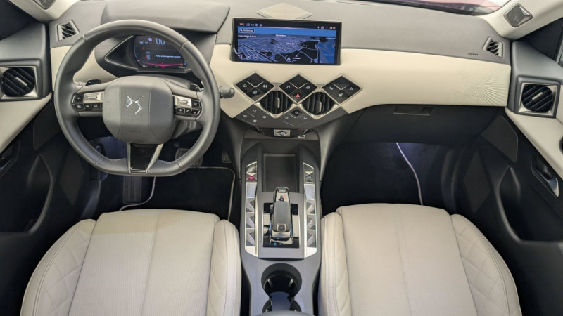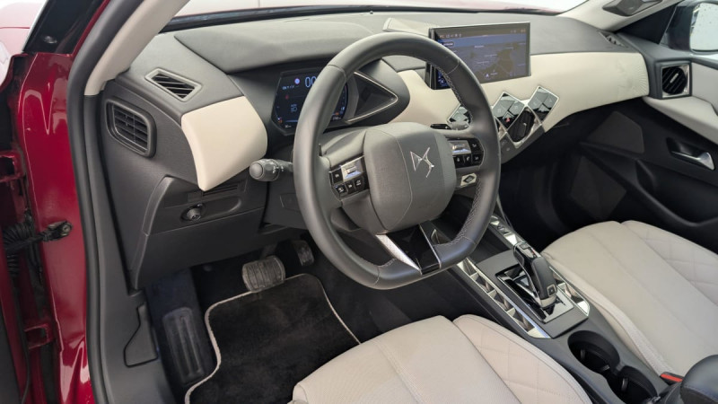kit anti crevaison / Double canule d'échappement chromée / Prise USB Data à l'AV / Fixations ISOFIX à la place passager AV et aux places latérales AR / Pare-brise teinté et acoustique / Contrôle dynamique de stabilité (ESP) avec antipatinage des roues (ASR) / Combiné numérique / Détection de sous-gonflage / Essuie-vitre AV à déclenchement et cadencement automatiques / Réhausse manuelle de siège conducteur / SOS & Assistance Service inclus pendant 10 ans / Poignées de portes affleurantes / Intérieur Tissu Luxembourg avec cuir Nappa Gris Galet : Ciel de pavillon Gris Galet Volant Cuir fleur Décor Toile DS Gris Galet confection diamant Siège Tissu Luxembourg avec Cuir Nappa Gris Galet Planche de bord en Cuir Nappa Gris Galet / Frein de stationnement électrique automatique / Freinage d'urgence automatique piloté par caméra / Eclairage d'accueil et d'accompagnement / Eclairage de cave à pieds à LED / Mirror Screen sans fil via Wifi Compatible Apple CarPlay et Android Auto / Accès et démarrage mains libres Proximity / Airbags frontaux (passager déconnectable), latéraux AV et AR, rideaux AV et AR / Ecran tactile capacitif 10,3" HD / Lève-vitres AV et AR électriques et séquentiels Antipincement côté conducteur et sécurité enfant / DS IRIS SYSTEM avec Navigation 3D Connectée DS IRIS System intègre la Navigation Connectée / Réhausse manuelle du siège passager / Pare-soleils avec miroirs de courtoisie occultables éclairés à LED / Advanced Traction Control (Système de gestion de l'adhérence sur tout type de route) / ABS avec répartiteur électronique de freinage (REF) et Aide au Freinage d'Urgence (AFU) et ESP + Aide au démarrage en pente /