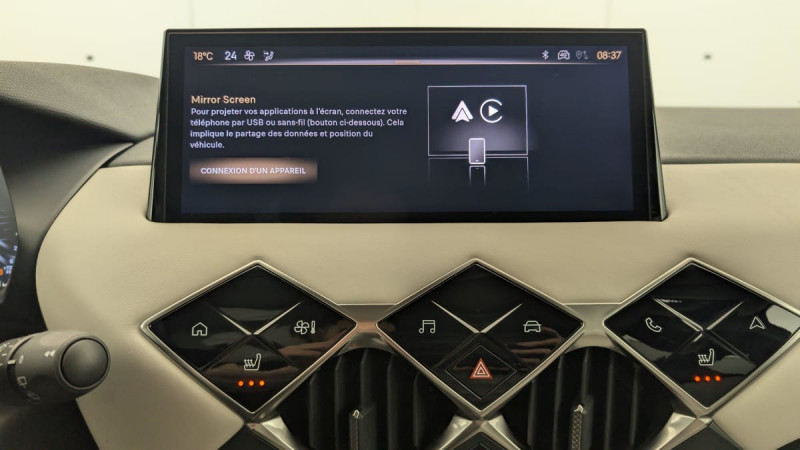 kit anti crevaison / Double canule d'échappement chromée / Prise USB Data à l'AV / Fixations ISOFIX à la place passager AV et aux places latérales AR / Pare-brise teinté et acoustique / Contrôle dynamique de stabilité (ESP) avec antipatinage des roues (ASR) / Combiné numérique / Détection de sous-gonflage / Essuie-vitre AV à déclenchement et cadencement automatiques / Réhausse manuelle de siège conducteur / SOS & Assistance / Poignées de portes affleurantes / Intérieur Tissu Luxembourg avec cuir Nappa Gris Galet : Ciel de pavillon Gris Galet Volant Cuir fleur Décor Toile DS Gris Galet confection diamant Siège Tissu Luxembourg avec Cuir Nappa Gris Galet Planche de bord en Cuir Nappa Gris Galet / Frein de stationnement électrique automatique / Freinage d'urgence automatique piloté par caméra / Eclairage d'accueil et d'accompagnement / Eclairage de cave à pieds à LED / Mirror Screen sans fil via Wifi Compatible Apple CarPlay et Android Auto / Accès et démarrage mains libres Proximity / Airbags frontaux (passager déconnectable), latéraux AV et AR, rideaux AV et AR / Ecran tactile capacitif 10,3" HD / Lève-vitres AV et AR électriques et séquentiels Antipincement côté conducteur et sécurité enfant / DS IRIS SYSTEM avec Navigation 3D Connectée DS IRIS System intègre la Navigation Connectée / Réhausse manuelle du siège passager / Pare-soleils avec miroirs de courtoisie occultables éclairés à LED / Advanced Traction Control (Système de gestion de l'adhérence sur tout type de route) / ABS avec répartiteur électronique de freinage (REF) et Aide au Freinage d'Urgence (AFU) et ESP + Aide au démarrage en pente /