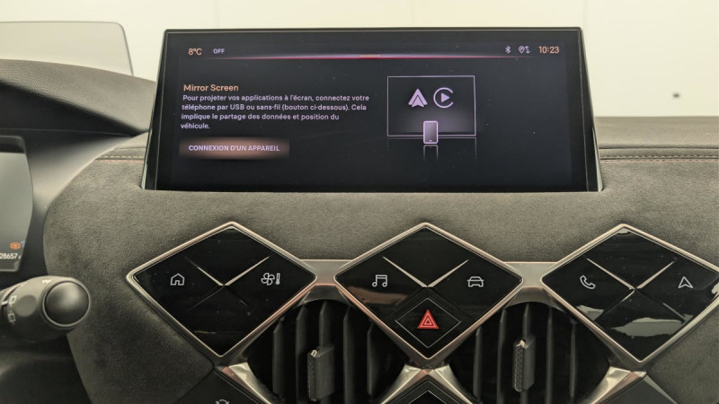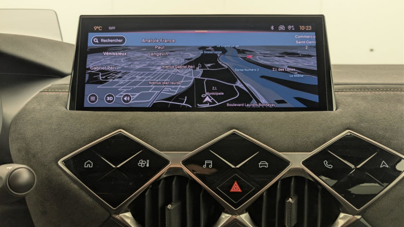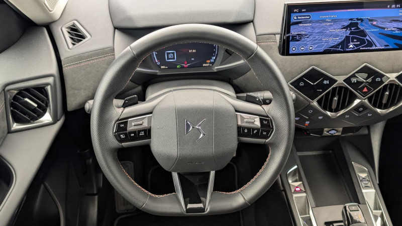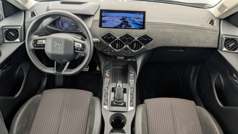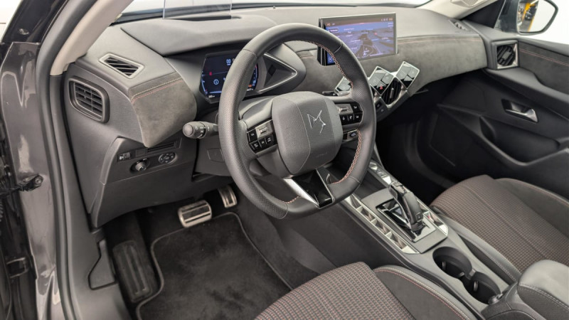 Pédalier en aluminium / Double canule d'échappement chromée / Advanced Traction Control / Fixations ISOFIX à la place passager AV et aux places latérales AR / Pare-brise teinté et acoustique / Contrôle dynamique de stabilité (ESP) avec antipatinage des roues (ASR) / Combiné numérique / Détection de sous-gonflage / Essuie-vitre AV à déclenchement et cadencement automatiques / Réhausse manuelle de siège conducteur / Centre de roue Carmin / SOS / DS Sensorial Drive / Poignées de portes affleurantes / Frein de stationnement électrique automatique / Freinage d'urgence automatique piloté par caméra / ABS avec répartiteur électronique de freinage (REF) et Aide au Freinage d'Urgence (AFU) + Aide au démarrage en pente / Eclairage d'accueil et d'accompagnement / Mirror Screen sans fil via Wifi Compatible Apple CarPlay et Android Auto / Airbags frontaux (passager déconnectable), latéraux AV et AR, rideaux AV et AR / Ecran tactile capacitif 10,3" HD / Enjoliveur de feux AR noir brillant / Grille de calandre noir brillant avec pampilles noir brillant / Intérieur Alcantara Noir : Ciel de pavillon Gris Galet Volant Cuir fleur perforé et coutures Or et Carmin Décor Alcantara Noir Siège Tissu Tressé Basalte avec Alcantara / Lève-vitres AV et AR électriques et séquentiels Antipincement côté conducteur / DS IRIS SYSTEM avec Navigation 3D Connectée DS IRIS System intègre la Navigation Connectée et la reconnaissance vocale naturelle / Pack Confort : Accoudoir central AV Rétroviseur intérieur électrochrome sans cadre Eclairage de cave à pieds à LED Accès et démarrage mains libres Proximity Pare-soleils avec miroirs de courtoisie occultables éclairés à LED / Pack Style : Vitres AR et lunette AR surteintées Feux AR à LED / Réhausse manuelle du siège passager / Rétroviseurs extérieurs avec embase et coque noir brillant / Sièges AV confort Avec poche aumonière /