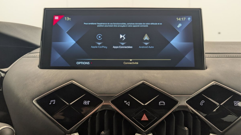 Kit de gonflage / Double canule d'échappement chromée / Mirror Screen / Allumage automatique des feux de détresse en cas de forte décélération / Reconnaissance vocale / Indicateur de rapports engagés / Rétroviseur intérieur électrochrome sans cadre / Fixations ISOFIX à la place passager AV et aux places latérales AR / Pare-brise teinté et acoustique / Verrouillage automatique des portes en roulant / Airbags frontaux aux places AV avec désactivation par clé de l'airbag passager / Airbags latéraux de type "thorax" aux places AV et AR / Contrôle dynamique de stabilité (ESP) avec antipatinage des roues (ASR) / ADML PROXIMITY Accès et démarrage Mains-Libres ave déverrouillage et déploiement automatique des poignées de portes affleurantes à l'approche du véhicule / Aide au stationnement AV et AR avec Caméra de recul / Rehausse manuelle du siège passager / Combiné numérique / Détection de sous-gonflage / Poignées de portes affleurantes / Antenne radio invisible / Essuie-vitre AV à déclenchement et cadencement automatiques / Filtre à charbon actif / Poignées de portes affleurantes ouverture à l'approche / Alerte de survitesse / Essuie-vitre AR avec intermittence indexée à la marche AR / Feux STOP à LED (3e feu) / Verrou sur porte conducteur / Démarrage Mains-Libres avec bouton de démarrage à pulsation / Eclairage d'accompagnement / Sièges AV réglables en longueur / Poignées d'ouverture de portes intérieures Chromées / Réhausse manuelle de siège conducteur / Facade centrale a commandes sensitives / Banquette AR 2/3 - 1/3 avec 3 appuie-tête / Navigation avec Mirror Screen et radio numérique / SOS / ABS avec répartiteur électronique de freinage (REF) et Aide au Freinage d'Urgence (AFU) / Frein de stationnement électrique automatique / Lève-vitres AV et AR électriques et séquentiels, avec antipincement sur la vitre conducteur / DS MATRIX LED VISION /