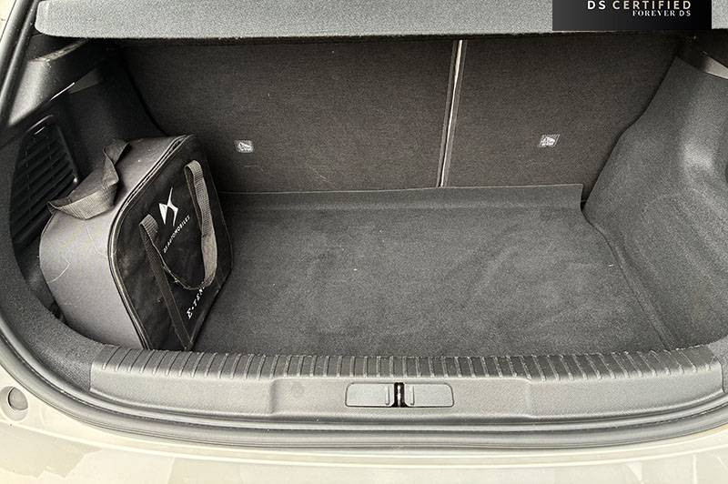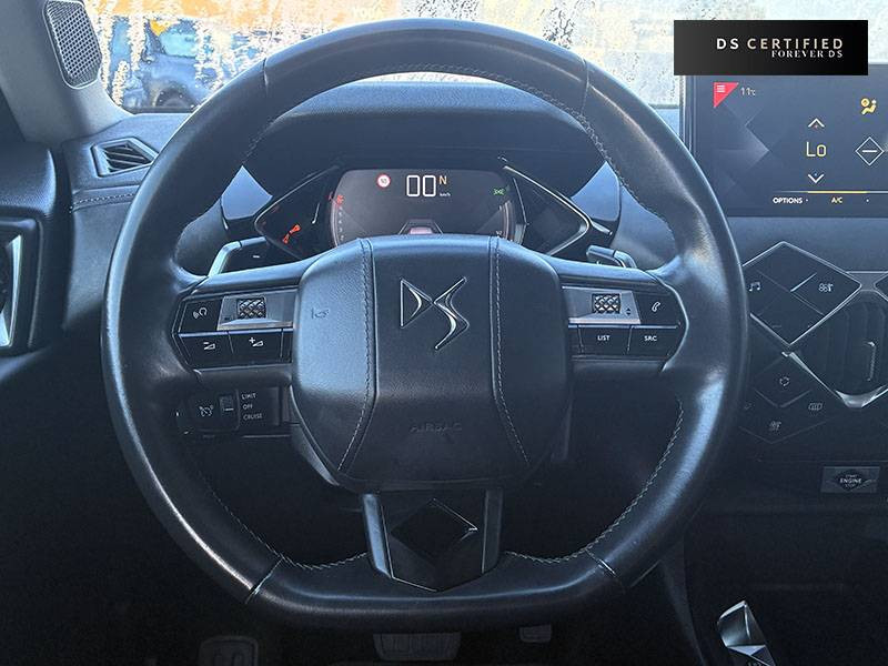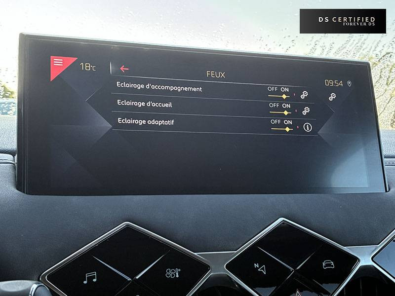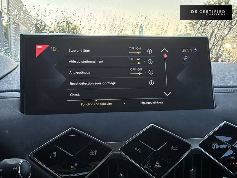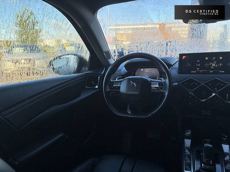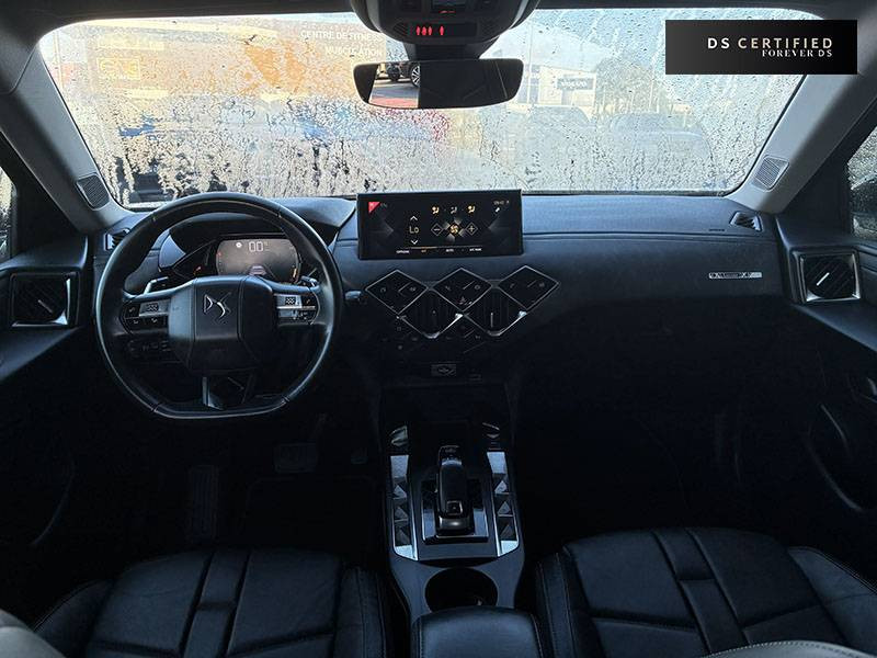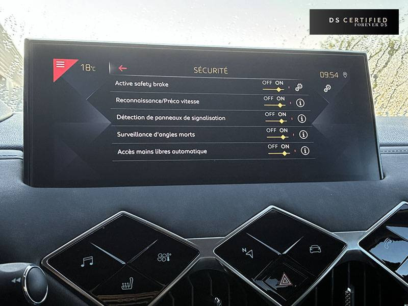 ABS, AFU, ESP, REF / ADML PROXIMITY Accès et démarrage Mains-Libres ave déverrouillage et déploiement automatique des poignées de portes affleurantes à l'approche du véhicule / ADML PROXIMITY avec DS CONNECT BOX / Aide au stationnement AV et AR avec Caméra de recul / Airbags frontaux aux places AV avec désactivation par clé de l'airbag passager / Airbags latéraux de type "thorax" aux places AV et AR / Alerte de survitesse / Allumage automatique des feux de détresse en cas de forte décélération / Antenne radio invisible / Aumônières de dos sur les sièges AV / Calandre surmontée de l'emblème E-TENSE / Centre de roue Blanc / Clignotants impulsionnels 3 coups / Combiné numérique / Contrôle de traction intelligent / Contrôle dynamique de stabilité (ESP) avec antipatinage des roues (ASR) / Crochet d'arrimage dans le coffre au dessus du plancher de coffre x4 / Démarrage Mains-Libres avec bouton de démarrage à pulsation / Détection de sous-gonflage / DS Connect Box / DS CONNECT NAV avec Mirror Screen et radio numérique / DS MATRIX LED VISION / DS Wings chromées / DS Wings Chrome Satin / Eclairage d'accompagnement / Eclairage d'accueil automatique / Eclairage de boîte à gants, d'accoudoir central AV et de coffre à LED / Eclaireur de coffre / Essuie-vitre AR avec intermittence indexée à la marche AR / Essuie-vitre AV à déclenchement et cadencement automatiques / Facade centrale a commandes sensitives / Feux STOP à LED (3e feu) / Filtre à charbon actif / Fixations ISOFIX à la place passager AV et aux places latérales AR / Freinage d'urgence automatique avec Alerte Active de Franchissement Involontaire de Ligne et Surveillance d'Angle Mort / Freinage d'urgence automatique avec Pack Sécurité / Freinage d'urgence automatique jusqu'à 140 km/h / Freinage d'urgence automatique jusqu'à 85 km/h / Frein de stationnement électrique / Grille de calandre Gris Anthra / Grille de calandre noir brillant / Grille de calandre Noir Mat avec pointes Chromées / Guide utilisateur numérique / Indicateur de rapports engagés / Inspiration DS BASTILLE avec sièges Cuir et pavillon clair / Inspiration DS RIVOLI / Lève-vitres AV/AR électriques, séquentiels et antipincement / Mirror Screen / Pack Sécurité / Pare-brise teinté et acoustique / Pare-soleil avec miroir de courtoisie et éclairage à LED / Pieds de rétroviseurs extérieurs couleur carrosserie / Plafonnier tactile à LED, liseuses AR à LED, éclairage de cave à pieds à LED / Poignées de maintien aux places AR / Poignées de maintien aux places AV / Poignées de portes affleurantes / Poignées de portes affleurantes ouverture à l'approche / Poignées d'ouverture de portes intérieures Chromées / Porte-gobelets à l' AV / Portières avec lécheurs de vitres invisibles / Prise USB Data à l'AV / Radio analogique / Reconnaissance vocale / Réhausse manuelle de siège conducteur / Rehausse manuelle du siège passager / Rétroviseur intérieur électrochrome sans cadre / Seuils de portes AV en métal chromé / Sièges AV à haute densité / Sièges AV réglables en longueur / Signature E-TENSE sur le hayon / Surtapis épais AV et AR / Surveillance d'angles morts / Système audio sur tablette tactile 10,3" HD à 8 HP avec prise USB et Bluetooth / Système sonore polyphonique / Témoin et alerte sonore de non-bouclage des ceintures de sécurité AV/AR / Trappe de recharge côté gauche / Verrouillage automatique des portes en roulant / Verrou sur porte conducteur / Volant gainé en Cuir pleine fleur / Zone De Danger