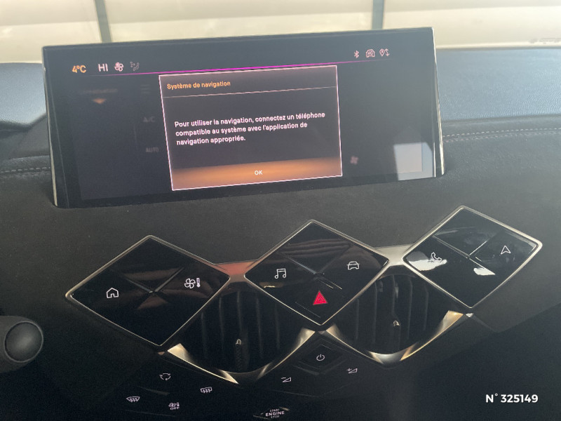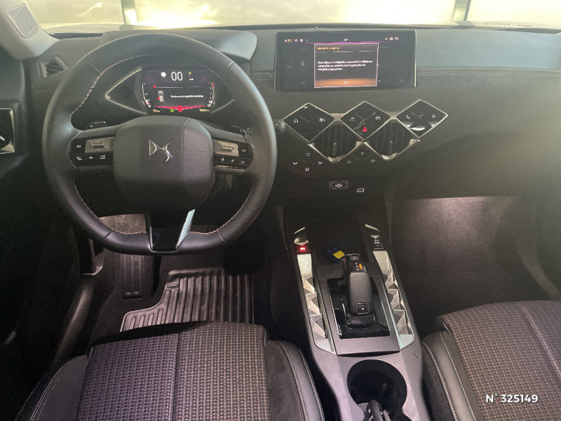 Services Pack Navigation Plus 3 ANS INCLUS à l'achat du véhicule: info trafic en temps réel, Reconnaissance vocale en langage naturel, Localisation des stations-services et prix des carburants, Localisation et disponibilité en temps réel des bornes de recharge pour véhicules électrifiés, Mises à jour des cartographies en ligne, Recherche en ligne des adresses et des Points d'Intérêt, Tarifs et disponibilité en temps réel des parkings, Prévisions météorologiques, Zones de Danger / Sièges AV confort Avec poche aumonière / SOS & Assistance Service inclus pendant 10 ans / Teinte Caisse opaque Blanc Banquise / Pare-soleils avec miroirs de courtoisie occultables éclairés à LED / Pack d'équipements pour la Sécurité / Pare-brise teinté et acoustique / Double canule d'échappement chromée / DS Sensorial Drive / DS Wings Noir Brillant / Eclairage d'accueil et d'accompagnement / Eclairage de cave à pieds à LED / Ecran tactile capacitif 10,3" HD / Enjoliveur de feux AR noir brillant / Essuie-vitre AV à déclenchement et cadencement automatiques / Feux AR halogène / Fixations ISOFIX à la place passager AV et aux places latérales AR / Frein de stationnement électrique automatique / Freinage d'urgence automatique piloté par caméra / Grille de calandre noir brillant avec pampilles noir brillant / Intérieur Alcantara Noir / Intérieur Tissu tressé Basalte avec Alcantara / Jonc supérieur de volet Noir brillant avec lettrage 'DS AUTOMOBILES' en acier inoxydable / Lécheurs de vitres invisibles / Lève-vitres AV et AR électriques et séquentiels Antipincement côté conducteur et sécurité enfant / Logo DS de calandre noir mat texturé / Mirror Screen sans fil via Wifi Compatible Apple CarPlay et Android Auto / Monogrammes AR noir brillant / Pack connect plus services supplémentaires pour une expérience de conduite connectée optimale / Détection de sous-gonflage / Poignées de portes affleurantes / Application MyDS / ABS, AFU, ESP, REF / Badge DS sur le capot et et Logo DS sur la calandre Logo DS Noir mat texturé / Centre de roue Carmin / Combiné numérique / Contrôle dynamique de stabilité (ESP) avec antipatinage des roues (ASR) / ABS avec répartiteur électronique de freinage (REF) et Aide au Freinage d'Urgence (AFU) + Aide au démarrage en pente / ABS avec répartiteur électronique de freinage (REF) et Aide au Freinage d'Urgence (AFU) et ESP + Aide au démarrage en pente / Advanced Traction Control (Système de gestion de l'adhérence sur tout type de route) / Airbags frontaux (passager déconnectable), latéraux AV et AR, rideaux AV et AR / Pompe à chaleur / Prise USB Data à l'AV / Réhausse manuelle de siège conducteur / Réhausse manuelle du siège passager / Rétroviseur intérieur électrochrome sans cadre / Rétroviseurs extérieurs avec embase et coque noir brillant