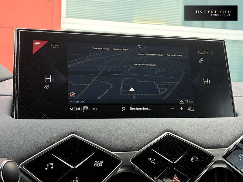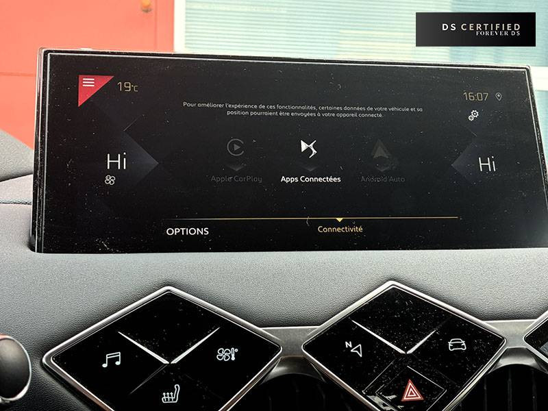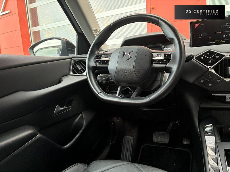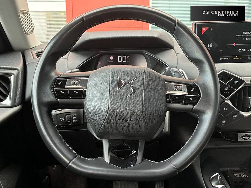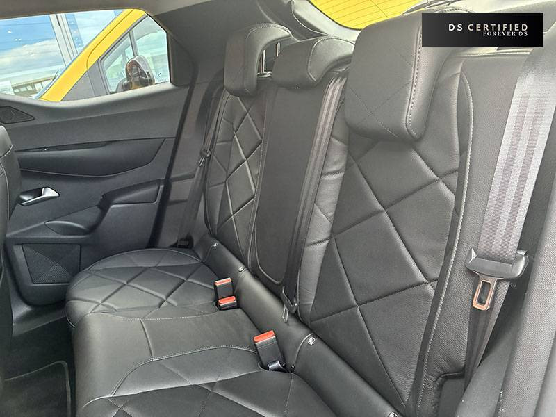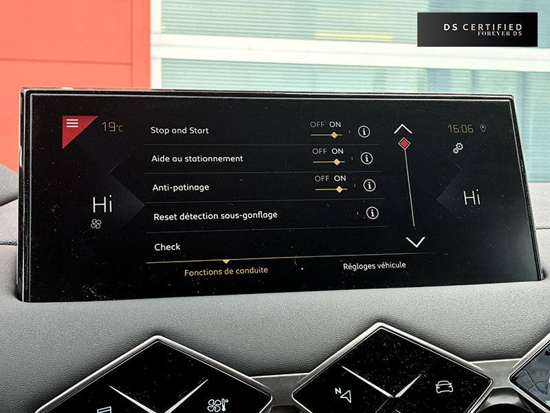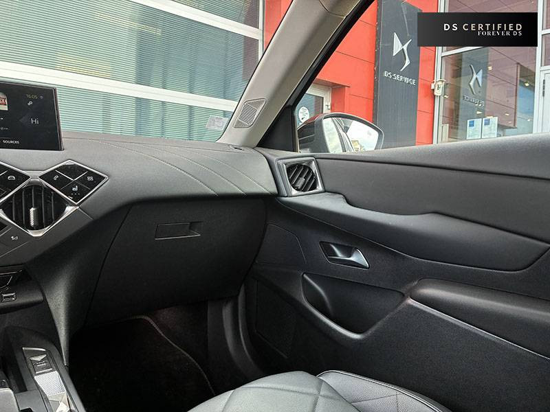 ABS, AFU, ESP, REF / ADML PROXIMITY Accès et démarrage Mains-Libres ave déverrouillage et déploiement automatique des poignées de portes affleurantes à l'approche du véhicule / Aide au stationnement AV et AR avec Caméra de recul / Airbags frontaux aux places AV avec désactivation par clé de l'airbag passager / Airbags latéraux de type "thorax" aux places AV et AR / Alerte de survitesse / Allumage automatique des feux de détresse en cas de forte décélération / Antenne radio invisible / Aumônières de dos sur les sièges AV / Banquette AR 2/3 - 1/3 avec 3 appuie-tête / Canule d'échappement chromée / Centre de roue Noir / Clignotants impulsionnels 3 coups / Combiné numérique / Contrôle de traction intelligent / Contrôle dynamique de stabilité (ESP) avec antipatinage des roues (ASR) / Crochet d'arrimage dans le coffre / Démarrage Mains-Libres avec bouton de démarrage à pulsation / Détection de sous-gonflage / DS MATRIX LED VISION / DS Wings chromé / Eclairage d'accompagnement / Eclairage d'accueil automatique / Eclairage de boîte à gants, d'accoudoir central AV et de coffre à LED / Eclaireur de coffre / Essuie-vitre AR avec intermittence indexée à la marche AR / Essuie-vitre AV à déclenchement et cadencement automatiques / Facade centrale a commandes sensitives / Feux STOP à LED (3e feu) / Filtre à charbon actif / Fixations ISOFIX à la place passager AV et aux places latérales AR / Freinage d'urgence automatique avec Alerte Active de Franchissement Involontaire de Ligne et Surveillance d'Angle Mort / Freinage d'urgence automatique jusqu'à 85 km/h / Frein de stationnement électrique / Grille de calandre Noir Mat / Grille de calandre Noir Mat avec pointes Chromées / Guide utilisateur numérique / Indicateur de rapports engagés / Inspiration DS BASTILLE avec sièges Cuir et pavillon clair / Inspiration DS RIVOLI / Lève-vitres AV/AR électriques, séquentiels et antipincement / Mirror Screen / Navigation avec Mirror Screen et radio numérique / Pare-brise teinté et acoustique / Pare-soleil avec miroir de courtoisie et éclairage à LED / Pieds de rétroviseurs extérieurs couleur carrosserie / Plafonnier tactile à LED, liseuses AR à LED, éclairage de cave à pieds à LED / Poignées de maintien aux places AR / Poignées de maintien aux places AV / Poignées de portes affleurantes / Poignées de portes affleurantes ouverture à l'approche / Poignées d'ouverture de portes intérieures Chromées / Porte-gobelets à l' AV / Portières avec lécheurs de vitres invisibles / Prise USB Data à l'AV / Reconnaissance vocale / Réhausse manuelle de siège conducteur / Rehausse manuelle du siège passager / Rétroviseur intérieur électrochrome sans cadre / Seuils de portes AV en métal chromé / Sièges AV à haute densité / Sièges AV réglables en longueur / SOS & Assistance / Surtapis épais AV et AR / Surveillance d'Angle Mort / Système audio sur tablette tactile 10,3" HD à 8 HP avec prise USB et Bluetooth / Système sonore polyphonique à 8 HP / Témoin et alerte sonore de non-bouclage des ceintures de sécurité AV/AR / Verrouillage automatique des portes en roulant / Verrou sur porte conducteur / Volant gainé en Cuir pleine fleur / Zone De Danger