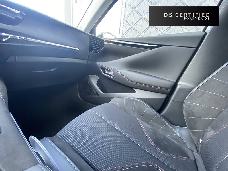 ABS avec répartiteur électronique de freinage (REF) et Aide au Freinage d'Urgence (AFU) + Aide au démarrage en pente / Accès et démarrage mains libres Proximity / Accoudoir central AR avec trappe à ski et 2 porte-gobelets / Adaptive Cruise Control Stop & Go / Aide au stationnement AV et AR et Caméra de recul / Airbags frontaux (passager déconnectable), latéraux AV, rideaux aux places AV/AR et central entre les places AV / Alerte Attention Conducteur / Antenne "aileron de requin" / Avertisseur de risque de collision / Banquette AR 2/3 - 1/3 avec 3 appuie-tête / Banquette AR avec trappe à skis / Black Pack / Cabochons d'écrous de roue noir brillant / Capot actif / Combiné numérique 7" / Console centrale avec rangement fermé / Contrôle dynamique de stabilité (ESP) avec antipatinage des roues (ASR) + Contrôle de stabilité de l'attelage / Détection de sous-gonflage / Diffuseur AR noir brillant avec décors d'échappement chromé / DS AIR (Aérateurs centraux invisibles avec sabre chrome) / DS E-TOGGLE (Sélecteur de vitesses) / DS EXTENDED HEAD UP DISPLAY Affichage tete haute étendu / DS IRIS SYSTEM / DS SMART TOUCH / DS Wings noir brillant / Eclairage d'ambiance à LED / Eclairage de boîte à gants, d'accoudoir central AV et de coffre à LED / Eclairage de cave à pieds à LED / Ecran tactile capacitif 10" HD / Enjoliveurs supérieurs des vitres latérales noir brillant / Essuie-vitre AV à déclenchement et cadencement automatiques + Buses de lavage / Feux AR Full LED effet 3D avec traitement écailles / Fixations ISOFIX à la place passager AV et aux places latérales AR / Freinage d'urgence automatique piloté par caméra et radar / Freinage multi-collision / Frein de stationnement électrique automatique / Grille de calandre noir brillant / Intérieur Alcantara Noir / Jantes alliage 19" MINNEAPOLIS / Jonc de volet noir brillant / Kit de dépannage provisoire de pneumatiques / Lécheurs de vitres latérales et enjoliveur de custode noir brillant / Lève-vitres AV/AR électriques, séquentiels et antipincement / Mirror Screen sans fil via Wifi Compatible Apple CarPlay et Android Auto / Monogramme AR noir brillant / Monogramme AV noir mat / Monogramme DS chromé sur l'enjoliveur de custode latéral noir brillant / Monogramme extérieur sur le capot noir brillant / Pack Sièges mécaniques avec réglages lombaires conducteur et passager / Pare-brise teinté acoustique / Pare-soleil avec miroirs de courtoisie occultables éclairés à LED / Pédalier en aluminium / Plafonnier I-Dome / Poignées extérieures affleurantes chromées / Prédisposition pour roue de secours galette / Prises 12 V 1 prise AV et 1 prise dans le coffre / Prises USB 1 prise USB-C sous l'accoudoir central AV, 1 prise USB-C dans la console et 2 prises USB-C pour les passagers AR / Radio numérique terrestre (DAB) Inclut le Bluetooth / Rétroviseur intérieur électrochrome sans cadre / Rétroviseurs extérieurs électriques, dégivrants, rabattables électriquement Avec éclairage d'accueil / Seuil de coffre aluminium / Seuil de portes AV spécifiques / SOS & Assistance Service inclus pendant 10 ans / Surtapis AV/AR / Teinte Caisse nacrée / Vérins d'ouverture et de maintien du capot moteur