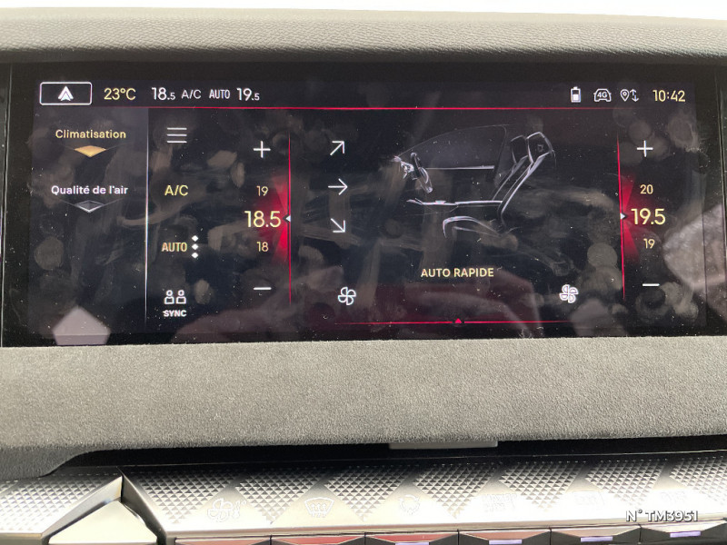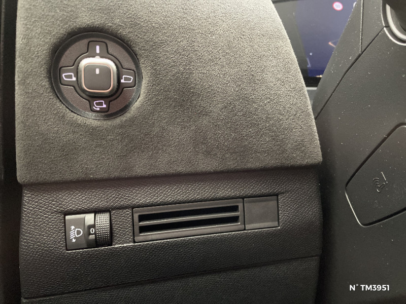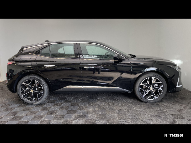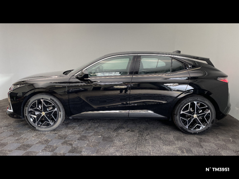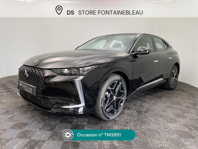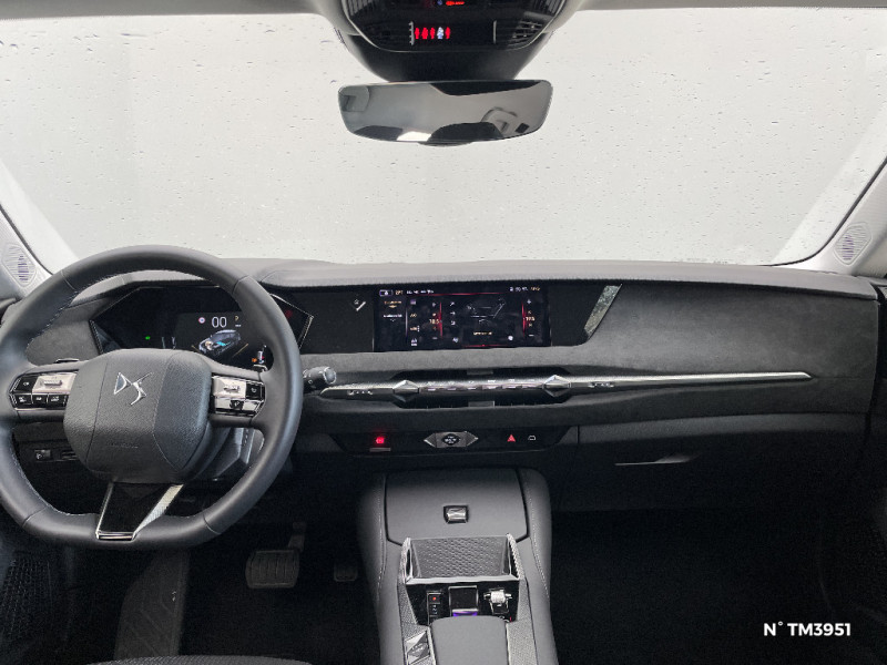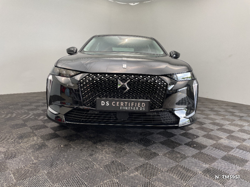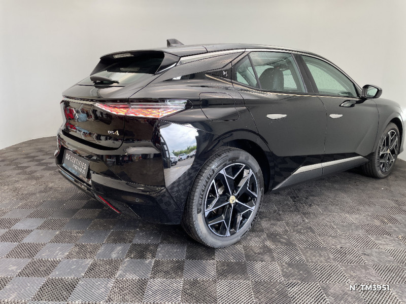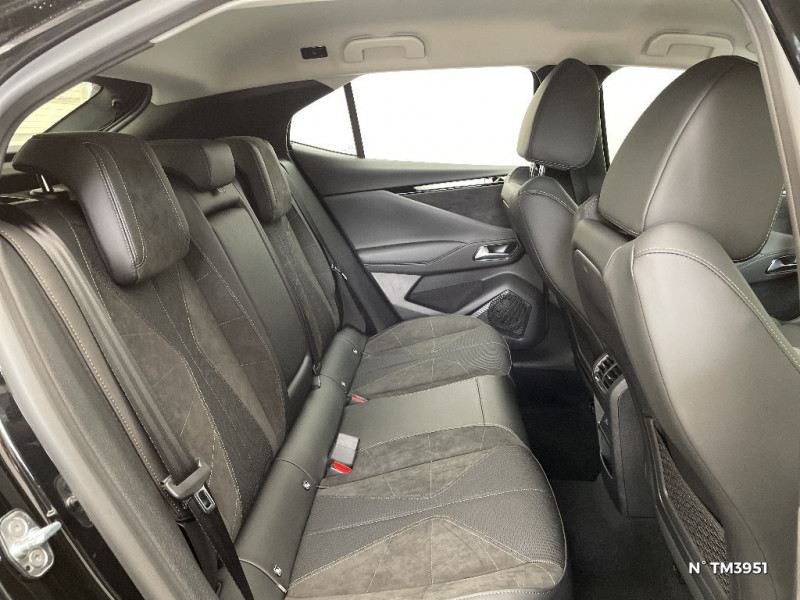 Airbags frontaux (passager déconnectable), latéraux AV, rideaux aux places AV/AR et central entre les places AV / Alerte attention conducteur / Alerte de franchissement involontaire de ligne Désactivable via l'écran tactile / Anneaux d'arrimage dans le coffre (x4) / Antenne "aileron de requin" Antenne noir brillant / Avertisseur de risque de collision / Badge de capot DS / Banquette AR avec trappe à skis / Banquette AR 2/3 - 1/3 avec 3 appuie-tête / Câble de recharge mode 2 standard 1,8 kW (10 A) / Cabochons d'écrous de roue noir brillant / Rétroviseurs extérieurs électriques, dégivrants, rabattables électriquement Avec éclairage d'accueil / Sécurité Enfants Sécurité mécanique / Sièges AV avec mousse haute densité / SOS & Assistance / Teinte Caisse nacrée Noir Perla Nera / Vérins d'ouverture et de maintien du capot moteur / Vitres latérales AV feuilletées acoustiques / Capot actif / Centre de roue Doré / Chargeur embarqué monophasé de 3,7 kW / Chargeur sans fil pour smartphone Norme QI, compatibilité smartphone à vérifier / Chiffre "4" doré / Clean Cabin avec Air Quality System / Climatisation automatique bizone 3 modes de diffusion Soft / Normal / Fast. Mode Monozone. Fonction Quick Launch via bouton dédié : froid ou chaud rapide selon la température extérieure. Aérateurs aux places AR / Combiné numérique 7" / Console centrale avec rangement fermé Avec dépose-téléphone et 2 porte-gobelets / Contrôle dynamique de stabilité (ESP) avec antipatinage des roues (ASR) + Contrôle de stabilité de l'attelage / Détection de sous-gonflage / Diffuseur AR noir brillant / Double filet décoratif doré / DS AIR (Aérateurs centraux invisibles avec sabre chrome) / DS e-toggle (Sélecteur de vitesses) / DS Wings noir brillant / Eclairage d'ambiance à LED Personnalisable avec 8 couleurs sur les panneaux de portes AV, la planche de bord et le repose paume / ABS avec répartiteur électronique de freinage (REF) et Aide au Freinage d'Urgence (AFU) Avec aide au démarrage en pente / Eclairage de boîte à gants, d'accoudoir central AV et de coffre à LED / Eclairage de cave à pieds à LED / Ecran tactile capacitif 10" HD / Enjoliveurs de bas de porte noirs avec insert chromé / Enjoliveurs supérieurs des vitres latérales chromés / Essuie-vitre AR / Essuie-vitre AV à déclenchement et cadencement automatiques + Buses de lavage / Frein de stationnement électrique automatique / Freinage d'urgence automatique piloté par caméra et radar / Freinage multi-collision / Grille de calandre noir brillant avec pampilles chromées / Intérieur Alcantara Noir / Jonc de volet chromé / Kit de dépannage provisoire de pneumatiques / Lécheurs de vitres latérales et enjoliveur de custode noir brillant / Lève-vitres AV et AR électriques, séquentiels et antipincement / Mirror Screen sans fil via Wifi Compatible Apple CarPlay et Android Auto / Monogramme DS chromé sur l'enjoliveur de custode latéral / Monogrammes AV/AR chromés / Pack Connect PLUS pour 3 ans / Pack sièges électriques Le réglage lombaires pneumatique. Le siège conducteur électrique à 10 voies avec mémoire de position, nez de coussin réglable mécaniquement et fonction accueil. Le siège passager électrique à 6 voies / Pare-brise teinté acoustique / Pare-soleil avec miroirs de courtoisie occultables éclairés à LED / Plafonnier I-Dome tactile Liseuses iDome à commandes tactiles à l'AR / Poignées extérieures affleurantes chromées / Préconditionnement thermique de l'habitacle programmable par smartphone / Prises USB 1 prise USB-C sous l'accoudoir central AV, 1 prise USB-C dans la console et 2 prises USB-C pour les passagers AR / Prises 12 V 1 prise AV et 1 prise dans le coffre / Rétroviseur intérieur électrochrome sans cadre / Feux AR Full LED effet 3D avec traitement écailles / Fixations ISOFIX aux places latérales AR Inclut un point d'ancrage TOP TETHER / Accès et Démarrage mains libres Proximity Déverrouillage et déploiement automatique des poignées de portes affleurantes à l'approche du véhicule / Accoudoir central AR avec trappe à ski et 2 porte-gobelets / Accoudoir central AV Avec grand rangement réfrigéré et éclairé / Adaptive Cruise Control Stop & Go / Aide au stationnement AV et AR et Caméra de recul