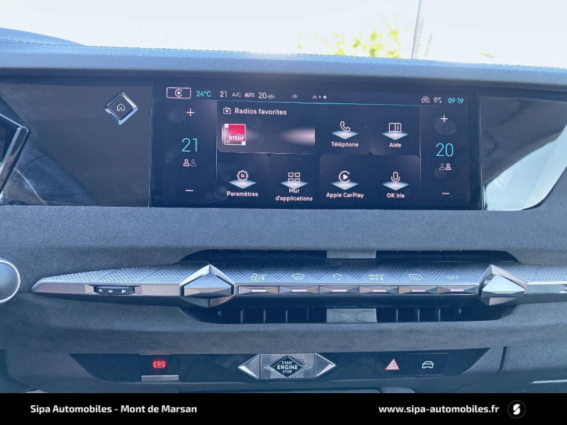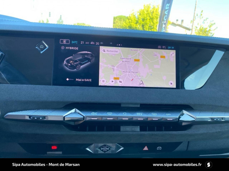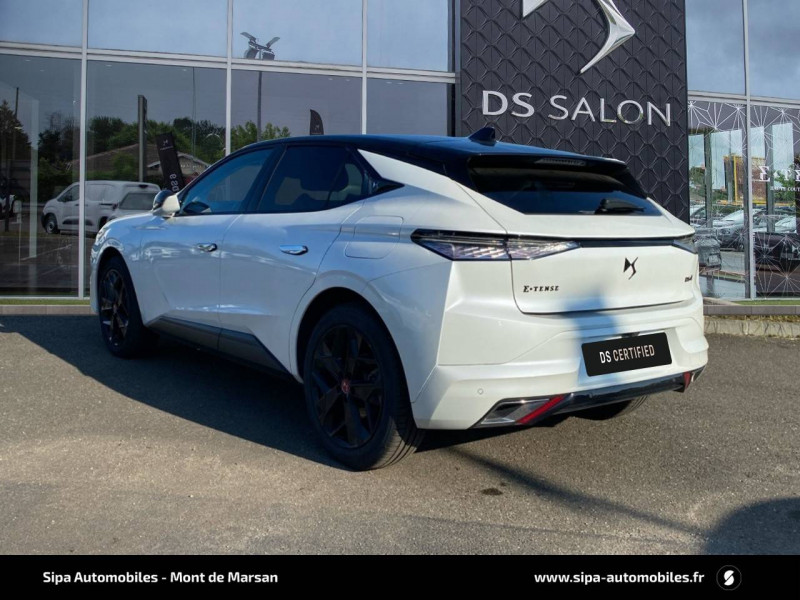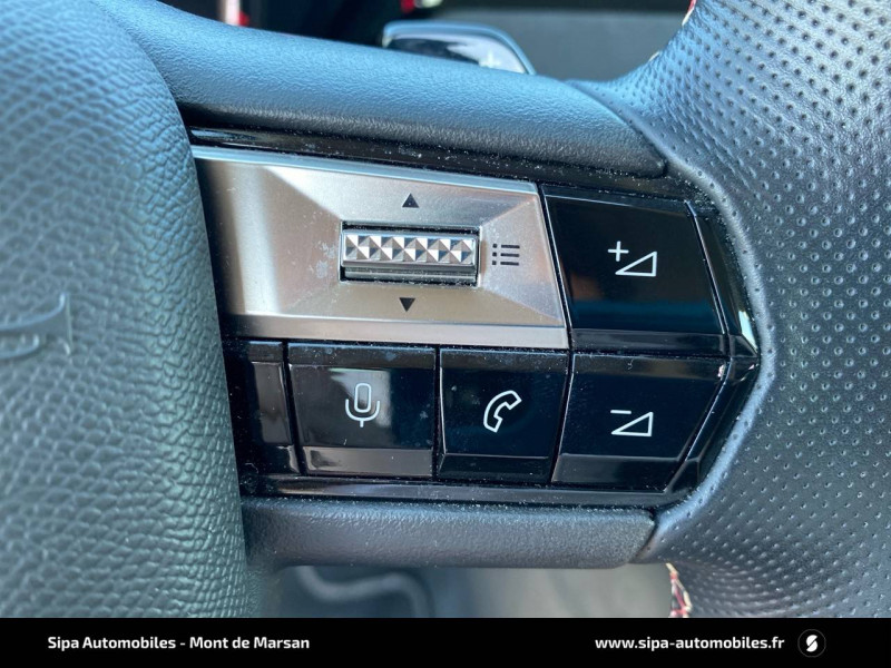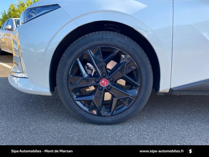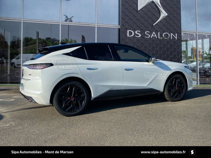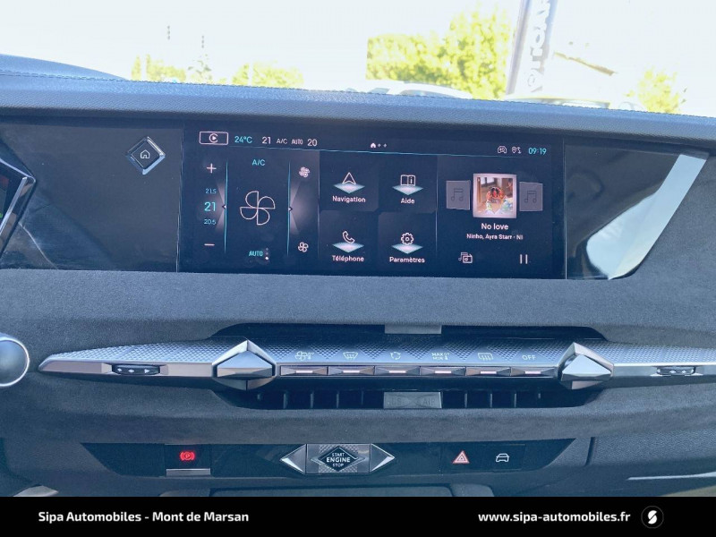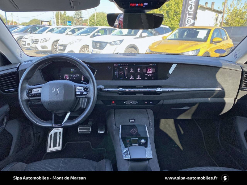 ABS avec répartiteur électronique de freinage (REF) et Aide au Freinage d'Urgence (AFU) + Aide au démarrage en pente / Accoudoir central AR avec trappe à ski et 2 porte-gobelets / Aide au stationnement AV/AR avec Caméra de recul / Airbags frontaux (passager déconnectable), latéraux AV, rideaux aux places AV/AR et central entre les places AV / Alerte Attention Conducteur / Antenne "aileron de requin" / Avertisseur de risque de collision / Banquette AR 2/3 - 1/3 avec 3 appuie-tête / Banquette AR avec trappe à skis / Black Pack / Câble de recharge mode 2 standard 1,8 kW (10 A) / Cabochons d'écrous de roue noir brillant / Capot actif / Chargeur embarqué monophasé de 7,4 kW / Combiné numérique 7" / Console centrale avec rangement fermé / Contrôle dynamique de stabilité (ESP) avec antipatinage des roues (ASR) + Contrôle de stabilité de l'attelage / Détection de sous-gonflage / Diffuseur AR noir brillant avec décors d'échappement chromé / DS AIR (Aérateurs centraux invisibles avec sabre chrome) / DS e-toggle (Sélecteur de vitesses) / DS Wings noir brillant / Eclairage d'ambiance à LED / Eclairage de boîte à gants, d'accoudoir central AV et de coffre à LED / Eclairage de cave à pieds à LED / Ecran tactile capacitif 10" HD / Enjoliveurs supérieurs des vitres latérales noir brillant / Essuie-vitre AV à déclenchement et cadencement automatiques + Buses de lavage / Feux AR Full LED effet 3D avec traitement écailles / Fixations ISOFIX à la place passager AV et aux places latérales AR / Freinage d'urgence automatique piloté par caméra et radar / Freinage multi-collision / Frein de stationnement électrique automatique / Intérieur Tissu Tressé Basalte avec Alcantara / Jantes alliage 19" MINNEAPOLIS / Jonc de volet noir brillant / Kit de dépannage provisoire de pneumatiques / Lécheurs de vitres latérales et enjoliveur de custode noir brillant / Lève-vitres AV/AR électriques, séquentiels et antipincement / Mirror Screen sans fil via Wifi Compatible Apple CarPlay et Android Auto / Monogramme AR noir brillant / Monogramme AV noir mat / Monogramme DS chromé sur l'enjoliveur de custode latéral noir brillant / Monogramme extérieur sur le capot noir brillant / Pare-brise teinté acoustique / Pare-soleil avec miroirs de courtoisie occultables éclairés à LED / Poignées extérieures affleurantes chromées / Préconditionnement thermique de l'habitacle programmable par smartphone Via MyDS App / Prises 12 V 1 prise AV et 1 prise dans le coffre / Prises USB 1 prise USB-C sous l'accoudoir central AV, 1 prise USB-C dans la console et 2 prises USB-C pour les passagers AR / Radio numérique terrestre (DAB) Inclut le Bluetooth / Rétroviseur intérieur électrochrome sans cadre / Rétroviseurs extérieurs électriques, dégivrants, rabattables électriquement Avec éclairage d'accueil / SOS & Assistance Service inclus pendant 10 ans / Teinte Caisse nacrée / Vérins d'ouverture et de maintien du capot moteur