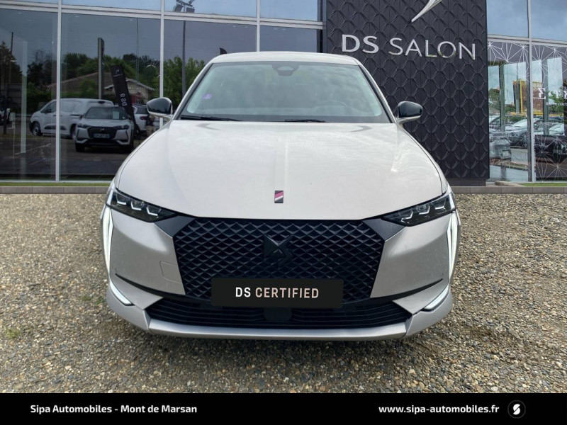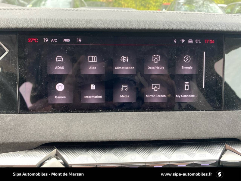 ABS avec répartiteur électronique de freinage (REF) et Aide au Freinage d'Urgence (AFU) + Aide au démarrage en pente / Accoudoir central AR avec trappe à ski et 2 porte-gobelets / Aide au stationnement AV/AR avec Caméra de recul / Airbags frontaux (passager déconnectable), latéraux AV, rideaux aux places AV/AR et central entre les places AV / Alerte Attention Conducteur / Antenne "aileron de requin" / Avertisseur de risque de collision / Banquette AR 2/3 - 1/3 avec 3 appuie-tête / Banquette AR avec trappe à skis / Black Pack / Câble de recharge mode 2 standard 1,8 kW (10 A) / Cabochons d'écrous de roue noir brillant / Capot actif / Chargeur embarqué monophasé de 7,4 kW / Combiné numérique 7" / Console centrale avec rangement fermé / Contrôle dynamique de stabilité (ESP) avec antipatinage des roues (ASR) + Contrôle de stabilité de l'attelage / Détection de sous-gonflage / Diffuseur AR noir brillant avec décors d'échappement chromé / DS AIR (Aérateurs centraux invisibles avec sabre chrome) / DS e-toggle (Sélecteur de vitesses) / DS Wings noir brillant / Eclairage d'ambiance à LED / Eclairage de boîte à gants, d'accoudoir central AV et de coffre à LED / Eclairage de cave à pieds à LED / Ecran tactile capacitif 10" HD / Enjoliveurs supérieurs des vitres latérales noir brillant / Essuie-vitre AV à déclenchement et cadencement automatiques + Buses de lavage / Feux AR Full LED effet 3D avec traitement écailles / Fixations ISOFIX à la place passager AV et aux places latérales AR / Freinage d'urgence automatique piloté par caméra et radar / Freinage multi-collision / Frein de stationnement électrique automatique / Intérieur Tissu Tressé Basalte avec Alcantara / Jantes alliage 19" MINNEAPOLIS / Jonc de volet noir brillant / Kit de dépannage provisoire de pneumatiques / Lécheurs de vitres latérales et enjoliveur de custode noir brillant / Lève-vitres AV/AR électriques, séquentiels et antipincement / Mirror Screen sans fil via Wifi Compatible Apple CarPlay et Android Auto / Monogramme AR noir brillant / Monogramme AV noir mat / Monogramme DS chromé sur l'enjoliveur de custode latéral noir brillant / Monogramme extérieur sur le capot noir brillant / Pare-brise teinté acoustique / Pare-soleil avec miroirs de courtoisie occultables éclairés à LED / Poignées extérieures affleurantes chromées / Préconditionnement thermique de l'habitacle programmable par smartphone Via MyDS App / Prises 12 V 1 prise AV et 1 prise dans le coffre / Prises USB 1 prise USB-C sous l'accoudoir central AV, 1 prise USB-C dans la console et 2 prises USB-C pour les passagers AR / Radio numérique terrestre (DAB) Inclut le Bluetooth / Rétroviseur intérieur électrochrome sans cadre / Rétroviseurs extérieurs électriques, dégivrants, rabattables électriquement Avec éclairage d'accueil / SOS & Assistance Service inclus pendant 10 ans / Teinte Caisse nacrée / Vérins d'ouverture et de maintien du capot moteur