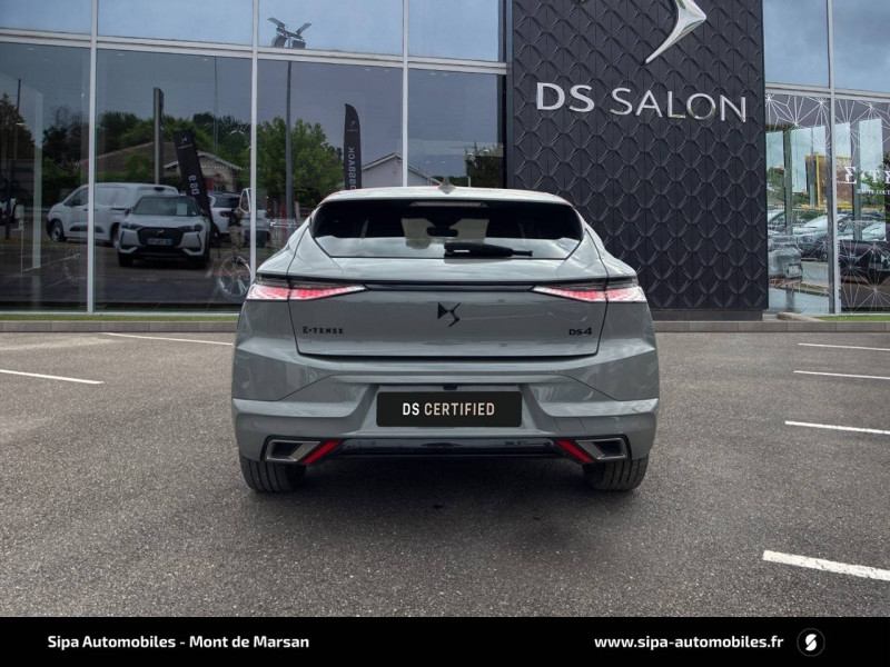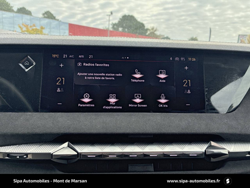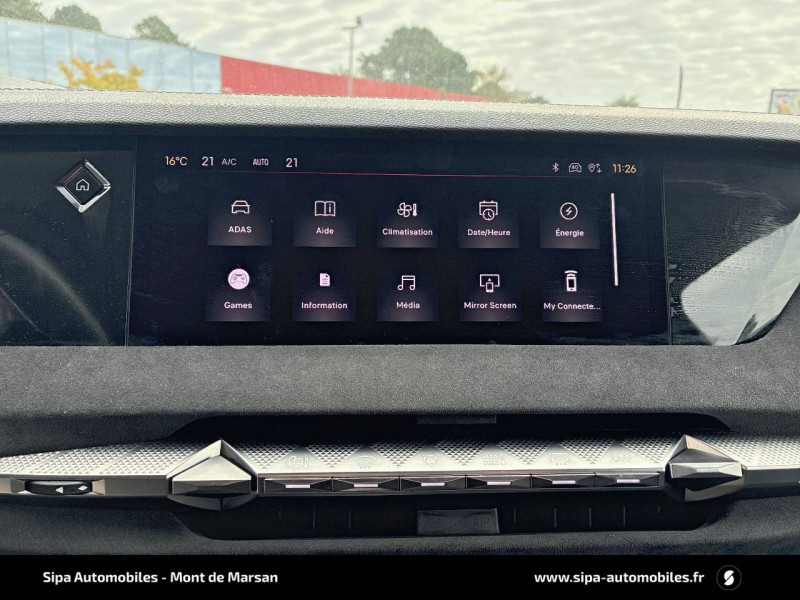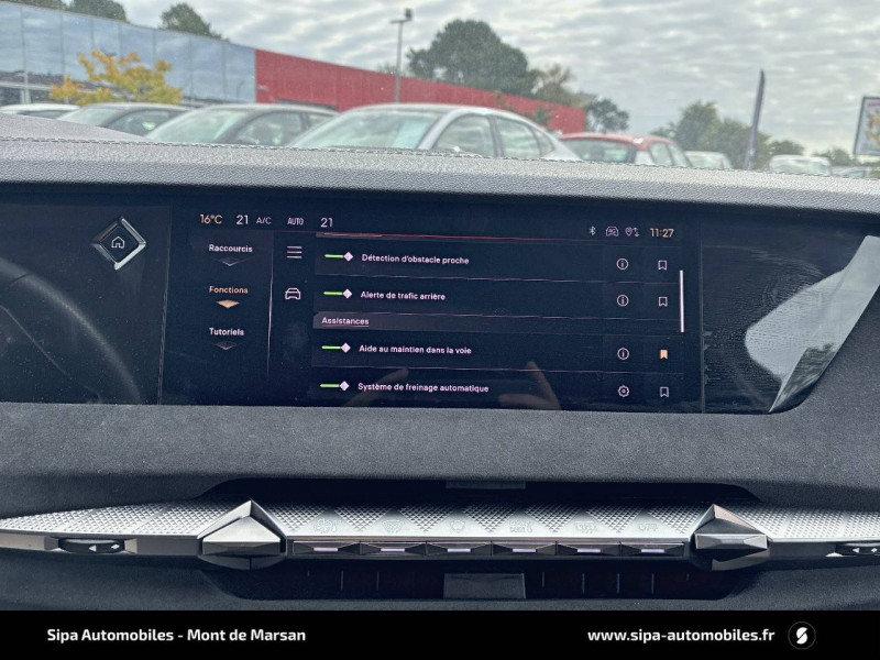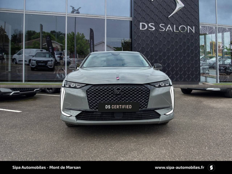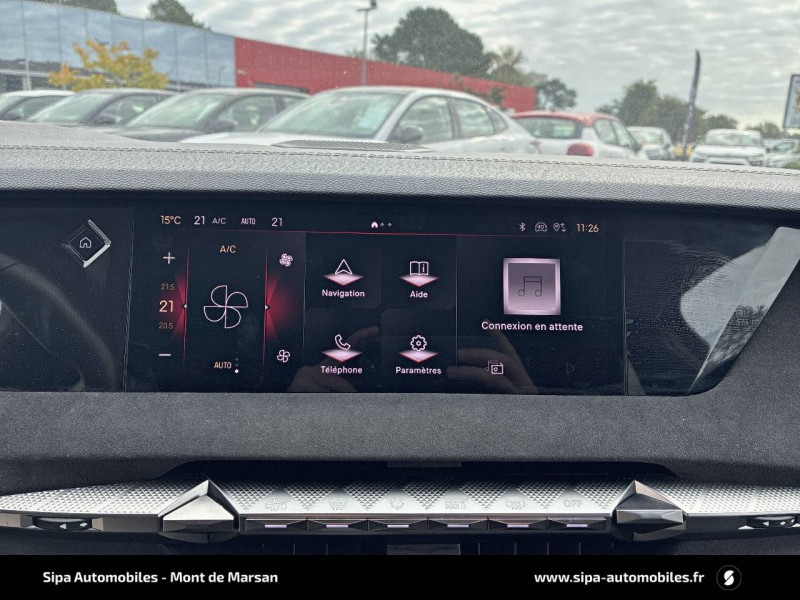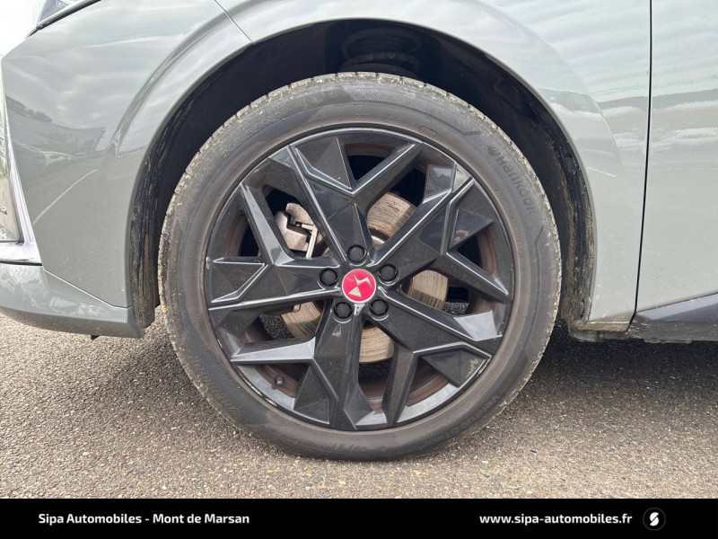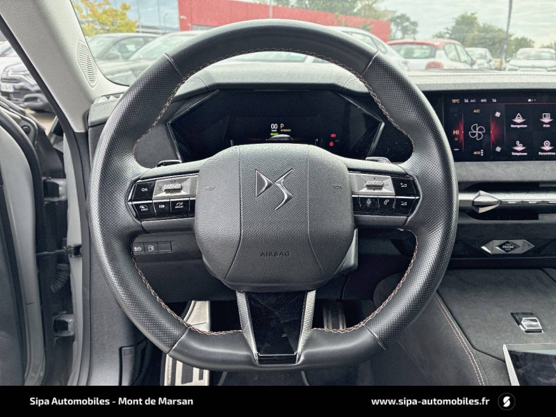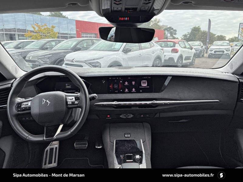 ABS avec répartiteur électronique de freinage (REF) et Aide au Freinage d'Urgence (AFU) + Aide au démarrage en pente / Accès et démarrage mains libres Proximity / Accoudoir central AR avec trappe à ski et 2 porte-gobelets / Adaptive Cruise Control Stop&Go / Aide au stationnement AV/AR avec Caméra de recul / Airbags frontaux (passager déconnectable), latéraux AV, rideaux aux places AV/AR et central entre les places AV / Alerte Attention Conducteur / Antenne "aileron de requin" / Avertisseur de risque de collision / Banquette AR 2/3 - 1/3 avec 3 appuie-tête / Banquette AR avec trappe à skis / Black Pack / Câble de recharge mode 2 standard 1,8 kW (10 A) / Cabochons d'écrous de roue noir brillant / Capot actif / Chargeur embarqué monophasé de 7,4 kW / Combiné numérique 7" / Console centrale avec rangement fermé / Contrôle dynamique de stabilité (ESP) avec antipatinage des roues (ASR) + Contrôle de stabilité de l'attelage / Détection de sous-gonflage / Diffuseur AR noir brillant avec décors d'échappement chromé / DS AIR (Aérateurs centraux invisibles avec sabre chrome) / DS e-toggle (Sélecteur de vitesses) / DS EXTENDED HEAD UP DISPLAY / DS IRIS SYSTEM / DS MATRIX LED VISION / DS SMART TOUCH / DS Wings noir brillant / Eclairage d'ambiance à LED / Eclairage de boîte à gants, d'accoudoir central AV et de coffre à LED / Eclairage de cave à pieds à LED / Ecran tactile capacitif 10" HD / Enjoliveurs supérieurs des vitres latérales noir brillant / Essuie-vitre AV à déclenchement et cadencement automatiques + Buses de lavage / Feux AR Full LED effet 3D avec traitement écailles / Fixations ISOFIX à la place passager AV et aux places latérales AR / Freinage d'urgence automatique piloté par caméra et radar / Freinage multi-collision / Frein de stationnement électrique automatique / Intérieur Tissu Tressé Basalte avec Alcantara / Jantes alliage 19" MINNEAPOLIS / Jonc de volet noir brillant / Kit de dépannage provisoire de pneumatiques / Lécheurs de vitres latérales et enjoliveur de custode noir brillant / Lève-vitres AV/AR électriques, séquentiels et antipincement / Mirror Screen sans fil via Wifi Compatible Apple CarPlay et Android Auto / Monogramme AR noir brillant / Monogramme AV noir mat / Monogramme DS chromé sur l'enjoliveur de custode latéral noir brillant / Monogramme extérieur sur le capot noir brillant / Pare-brise teinté acoustique / Pare-soleil avec miroirs de courtoisie occultables éclairés à LED / Pédalier en aluminium / Poignées extérieures affleurantes chromées / Préconditionnement thermique de l'habitacle programmable par smartphone Via MyDS App / Prises 12 V 1 prise AV et 1 prise dans le coffre / Prises USB 1 prise USB-C sous l'accoudoir central AV, 1 prise USB-C dans la console et 2 prises USB-C pour les passagers AR / Radio numérique terrestre (DAB) Inclut le Bluetooth / Rétroviseur intérieur électrochrome sans cadre / Rétroviseurs extérieurs électriques, dégivrants, rabattables électriquement Avec éclairage d'accueil / Seuil de coffre aluminium / Seuil de portes AV / SOS & Assistance Service inclus pendant 10 ans / Surtapis AV/AR / Teinte Caisse nacrée / Vérins d'ouverture et de maintien du capot moteur