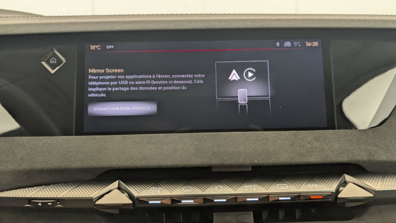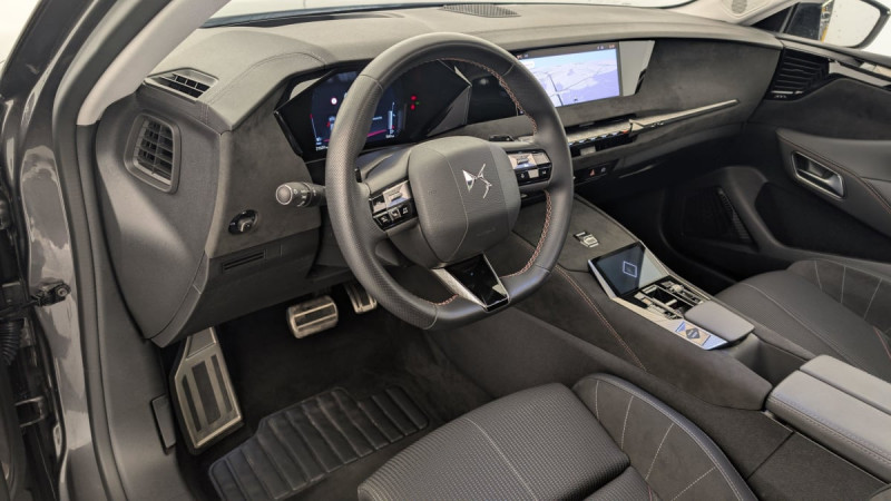 Kit de dépannage provisoire de pneumatiques / Frein de stationnement électrique automatique / Lève-vitres AV/AR électriques, séquentiels et antipincement / Rétroviseur intérieur électrochrome sans cadre / Alerte Attention Conducteur / Fixations ISOFIX à la place passager AV et aux places latérales AR / DS MATRIX LED VISION / Détection de sous-gonflage / Eclairage de boîte à gants, d'accoudoir central AV et de coffre à LED / Banquette AR 2/3 - 1/3 avec 3 appuie-tête / Aide au stationnement AV/AR avec Caméra de recul / DS EXTENDED HEAD UP DISPLAY / DS IRIS SYSTEM / Avertisseur de risque de collision / Combiné numérique 7" / Jantes alliage 19" MINNEAPOLIS / Freinage d'urgence automatique piloté par caméra et radar / ABS avec répartiteur électronique de freinage (REF) et Aide au Freinage d'Urgence (AFU) + Aide au démarrage en pente / Pare-brise teinté acoustique / Eclairage de cave à pieds à LED / Eclairage d'ambiance à LED / Mirror Screen sans fil via Wifi Compatible Apple CarPlay et Android Auto / Essuie-vitre AV à déclenchement et cadencement automatiques + Buses de lavage / Accès et démarrage mains libres Proximity / Adaptive Cruise Control Stop&Go / Airbags frontaux (passager déconnectable), latéraux AV, rideaux aux places AV/AR et central entre les places AV / Contrôle dynamique de stabilité (ESP) avec antipatinage des roues (ASR) + Contrôle de stabilité de l'attelage / Feux AR Full LED effet 3D avec traitement écailles / Pack Style : Pédalier en aluminium Vitres AR et lunette AR surteintées / Pare-soleil avec miroirs de courtoisie occultables éclairés à LED / Radio numérique terrestre (DAB) Inclut le Bluetooth / Rétroviseurs extérieurs électriques, dégivrants, rabattables électriquement Avec éclairage d'accueil / Ecran tactile capacitif 10" HD / Intérieur Tissu Tressé Basalte avec Alcantara : Planche de bord en alcantara Panneaux de portes en alcantara Console centrale en alcantara Sellerie en Tissu Tressé Basalte avec Alcantara et toile DS Décors de panneaux de porte Chrome guilloché Volant en cuir fleur Mistral avec surpiqûres Ciel de pavillon Salin /