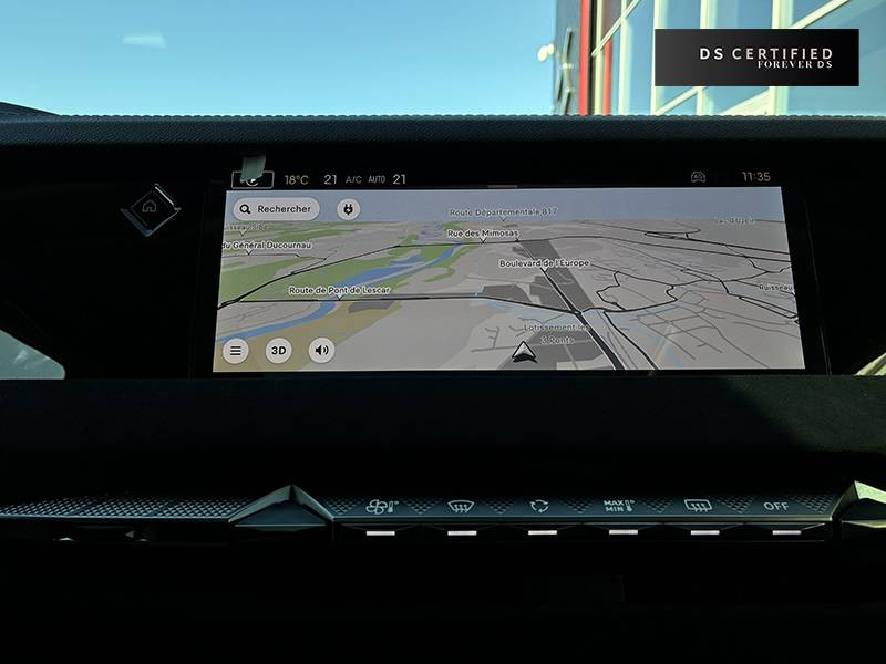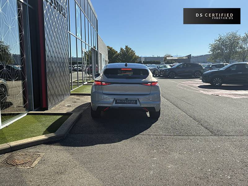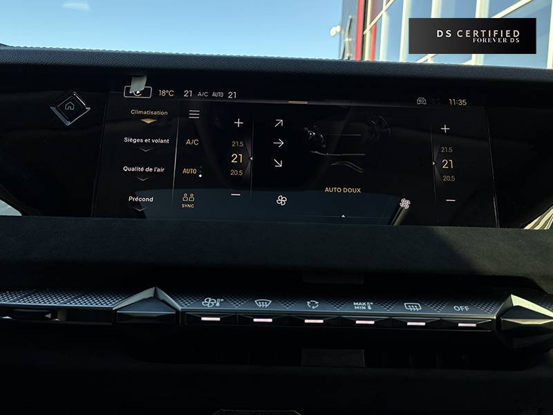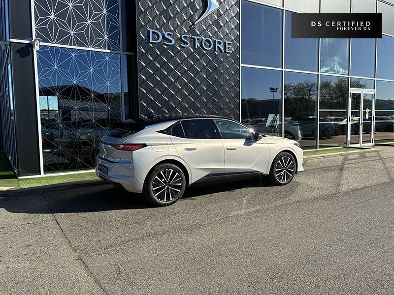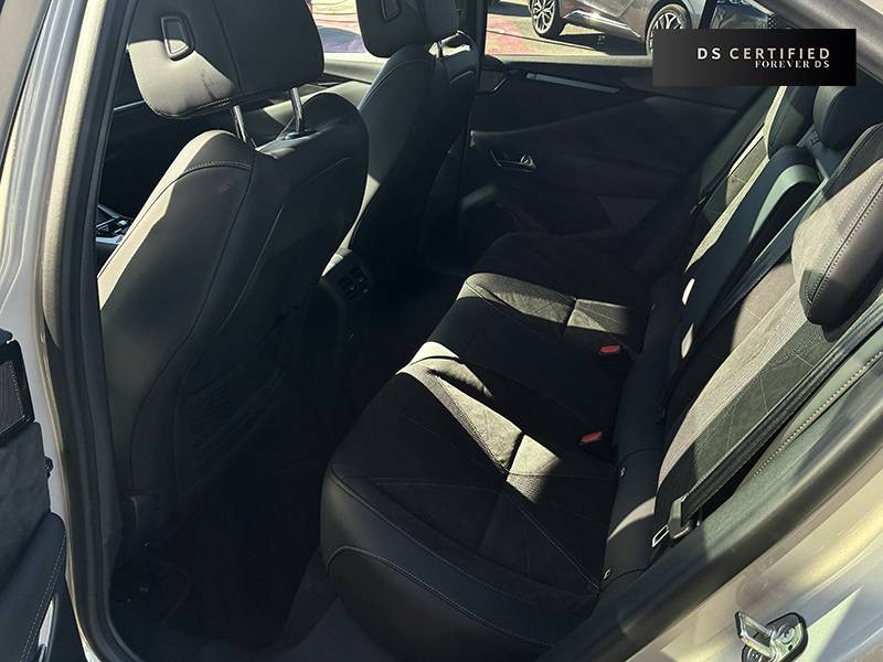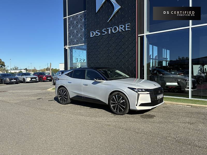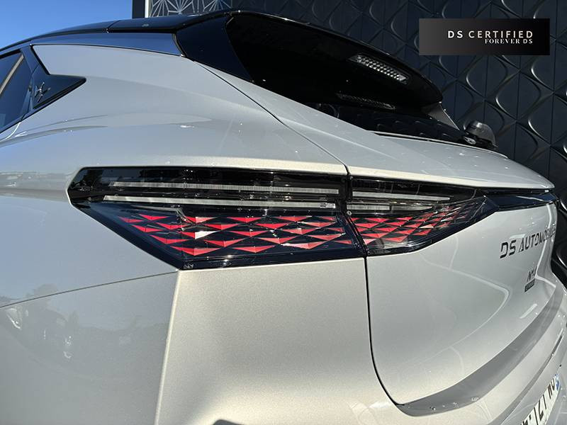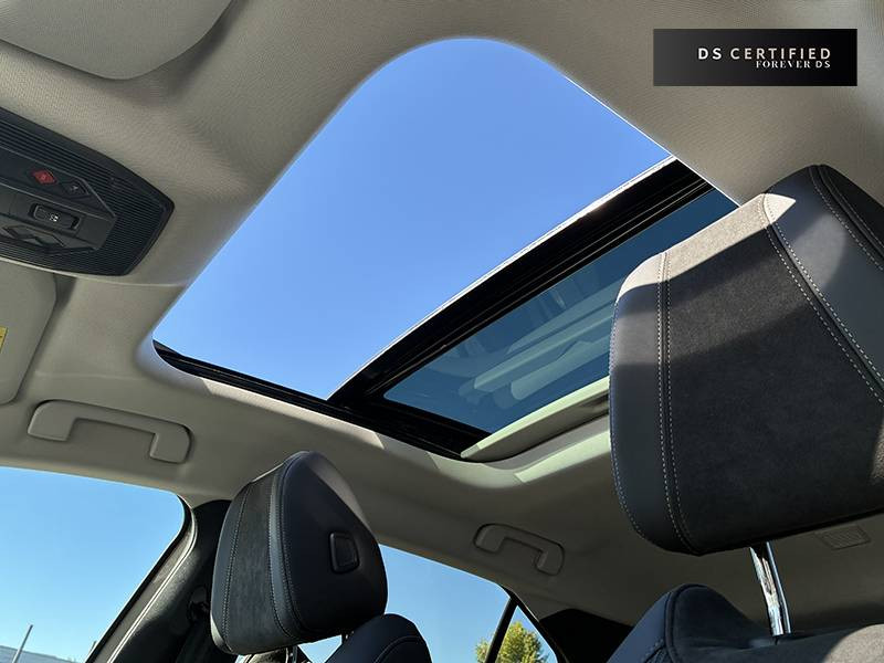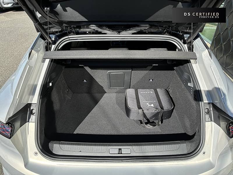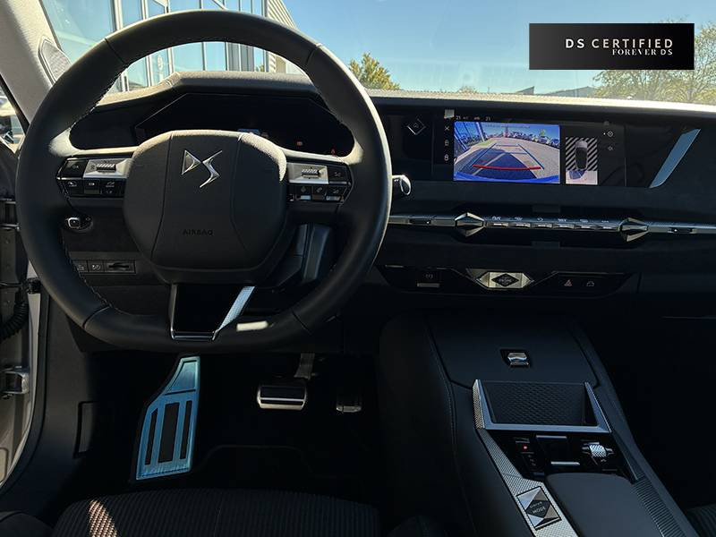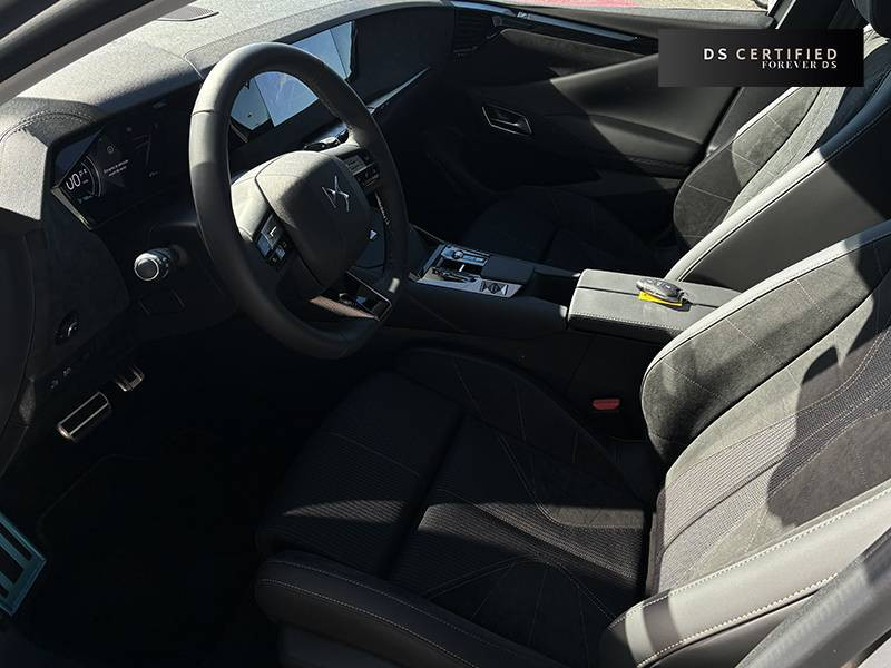 ABS avec répartiteur électronique de freinage (REF) et Aide au Freinage d'Urgence (AFU) Avec aide au démarrage en pente / Accès et Démarrage mains libres Proximity Déverrouillage et déploiement automatique des poignées de portes affleurantes à l'approche du véhicule / Accoudoir central AR avec trappe à ski et 2 porte-gobelets / Accoudoir central AV Avec grand rangement réfrigéré et éclairé / Adaptive Cruise Control Stop & Go / Aide au stationnement AV et AR et Caméra de recul / Airbags frontaux (passager déconnectable), latéraux AV, rideaux aux places AV/AR et central entre les places AV / Alerte de franchissement involontaire de ligne Désactivable via l'écran tactile / Anneaux d'arrimage dans le coffre (x4) / Antenne "aileron de requin" Antenne noir brillant / Avertisseur de risque de collision / Badge de capot ETOILE / Banquette AR 2/3 - 1/3 avec 3 appuie-tête / Banquette AR avec trappe à skis / Boîte à gants floquée du logo "Etoile" / Boîte de vitesse automatique 1 vitesse / Câble de recharge mode 3 (32 A) / Cabochons d'écrous de roue noir brillant / Capot actif / Centre de roue Noir / Chargeur embarqué triphasé de 11 kW / Chargeur sans fil pour smartphone Norme QI, compatibilité smartphone à vérifier / Clean Cabin avec Air Quality System / Climatisation automatique bizone 3 modes de diffusion Soft / Normal / Fast. Mode Monozone. Fonction Quick Launch via bouton dédié : froid ou chaud rapide selon la température extérieure. Aérateurs aux places AR / Combiné numérique 10" / Console centrale avec rangement fermé Avec dépose-téléphone et 2 porte-gobelets / Contrôle de la traction (TCS) / Contrôle dynamique de stabilité (ESP) avec antipatinage des roues (ASR) + Contrôle de stabilité de l'attelage / Détection de sous-gonflage / DS AIR (Aérateurs centraux invisibles avec sabre chrome) / DS E-TOGGLE Sélecteur de vitesses / DS IRIS SYSTEM Navigation connectée, intégrant un assistant personnel et reconnaissance vocale, avec ChatGPT. Information trafic en temps réel, prix des carburants, parkings et Zones de Danger. 3 ans de services connectés inclus / DS MATRIX LED VISION Intègre les technologies Matrix Beam et l'éclairage dynamique en courbe. Grâce aux cinq modes préétablis (ville, campagne, autoroute, météo difficile et brouillard), roulez en pleins phares sans éblouir les autres automobilistes / DS Wings noir brillant / Eclairage d'ambiance à LED Personnalisable avec 8 couleurs sur les panneaux de portes AV, la planche de bord et le repose paume / Eclairage de boîte à gants, d'accoudoir central AV et de coffre à LED / Eclairage de cave à pieds à LED / Ecran tactile capacitif 10" HD Inclut le Bluetooth / Enjoliveurs de bas de porte noirs avec insert chromé / Essuie-vitre AR / Essuie-vitre AV à déclenchement et cadencement automatiques + Buses de lavage / Feux AR Full LED effet 3D avec traitement écailles Indicateur de changement de direction défilant inclus avec les DS MATRIX LED VISION, / Freinage d'urgence automatique piloté par caméra et radar / Freinage multi-collision / Frein de stationnement électrique automatique / Grille de calandre noir brillant avec pampilles chromées / Intérieur Alcantara Noir / Jonc de volet chromé / Kit anti-crevaison / Lecheurs de vitres latérales Noir brillant avec coulisses chromés / Lève-vitres AV et AR électriques, séquentiels et antipincement / Mirror Screen sans fil via Wifi Fonctionne avec Apple CarPlay et Android Auto, nécessite un smartphone compatible / Monogramme DS chromé sur l'enjoliveur de custode latéral / Pack Connect PLUS pour 3 ans services supplémentaires pour une expérience de conduite connectée optimale / Pack sièges électriques - Le nez de coussin réglable côté conducteur et passager - Le réglage lombaires pneumatique - Le siège conducteur électrique à 8 voies, réglage longitudinal manuel - Le siège passager électrique à 6 voies / Pare-brise teinté acoustique / Pare-chocs avec sabots AV et AR en aluminium / Pare-soleil avec miroirs de courtoisie occultables éclairés à LED / Pédalier en aluminium / Plafonnier I-Dome tactile Liseuses iDome à commandes tactiles à l'AR / Poignées extérieures affleurantes chromées / Préconditionnement thermique de l'habitacle programmable par smartphone / Prédisposition pour roue de secours galette / Prises 12 V 1 prise AV et 1 prise dans le coffre / Prises USB 1 prise USB-C sous l'accoudoir central AV, 1 prise USB-C dans la console et 2 prises USB-C pour les passagers AR / Régulateur de vitesse adaptatif et Pack Détection trafic AR Avec l'Adaptive Cruise Control Stop & Go. Le Pack Détection Trafic AR comprend l'Alerte de Trafic AR ainsi que la Surveillance d'Angle Mort Longue Distance / Rétroviseur intérieur électrochrome sans cadre / Rétroviseurs extérieurs électriques, dégivrants, rabattables électriquement Avec éclairage d'accueil / Sécurité Enfants Sécurité mécanique / Seuil de portes AV / Sièges AV avec mousse haute densité / SOS & Assistance / Surtapis AV/AR / Surveillance d'angles morts longue distance / Vérins d'ouverture et de maintien du capot moteur / Vitres AR et lunette AR surteintées Inclut la lunette AR avec sérigraphie "Reflective Design / Vitres latérales AV et AR feuilletées acoustiques