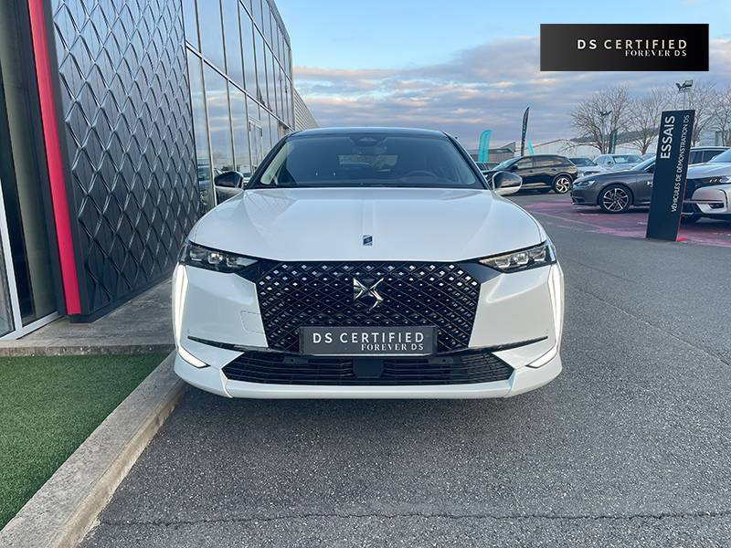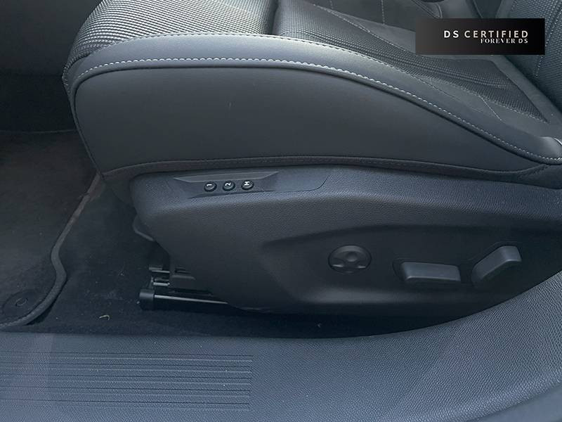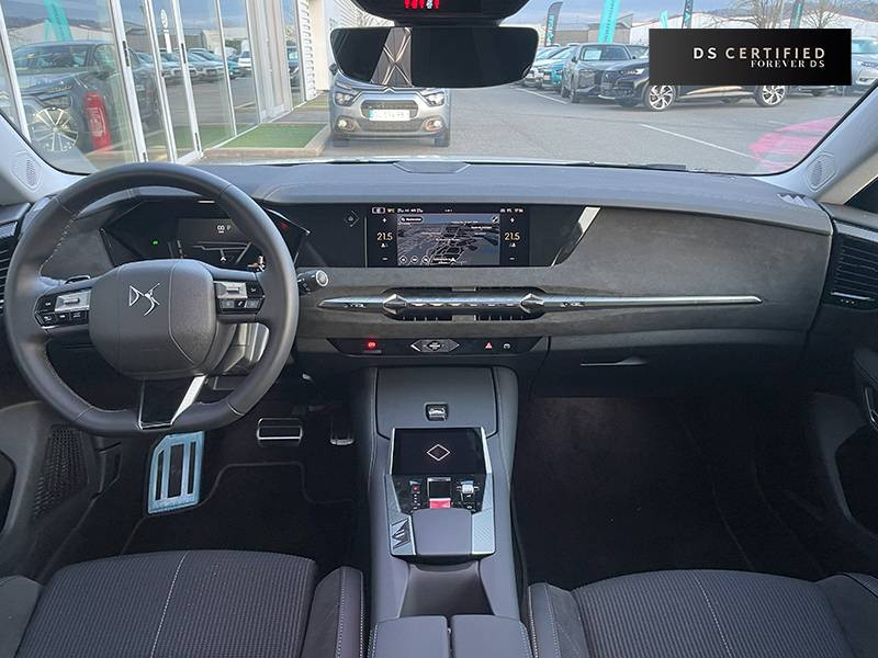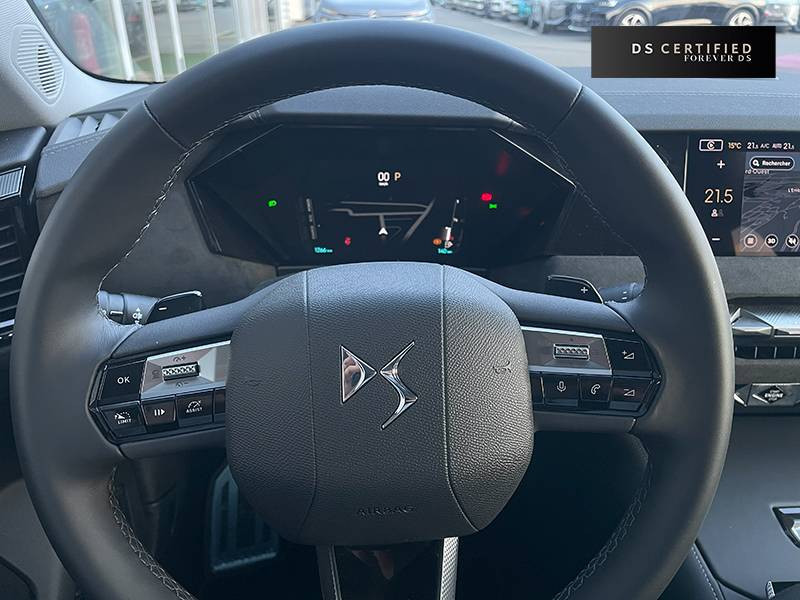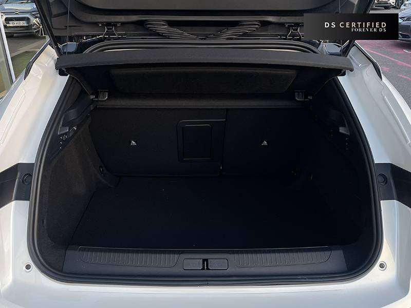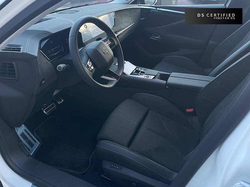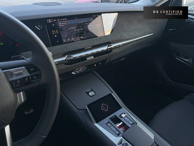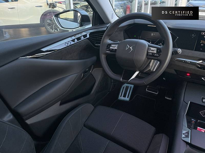 ABS avec répartiteur électronique de freinage (REF) et Aide au Freinage d'Urgence (AFU) Avec aide au démarrage en pente / Accès et Démarrage mains libres Proximity Déverrouillage et déploiement automatique des poignées de portes affleurantes à l'approche du véhicule / Accoudoir central AR avec trappe à ski et 2 porte-gobelets / Accoudoir central AV Avec grand rangement réfrigéré et éclairé / Adaptive Cruise Control Stop & Go / Aide au stationnement AV et AR et Caméra de recul / Airbags frontaux (passager déconnectable), latéraux AV, rideaux aux places AV/AR et central entre les places AV / Alerte attention conducteur / Alerte de franchissement involontaire de ligne Désactivable via l'écran tactile / Anneaux d'arrimage dans le coffre (x4) / Antenne "aileron de requin" Antenne noir brillant / Avertisseur de risque de collision / Badge de capot DS / Banquette AR 2/3 - 1/3 avec 3 appuie-tête / Banquette AR avec trappe à skis / Câble de recharge mode 2 standard 1,8 kW (10 A) / Cabochons d'écrous de roue noir brillant / Capot actif / Centre de roue Doré / Chargeur embarqué monophasé de 3,7 kW / Chargeur sans fil pour smartphone Norme QI, compatibilité smartphone à vérifier / Chiffre "4" doré / Clean Cabin avec Air Quality System / Climatisation automatique bizone 3 modes de diffusion Soft / Normal / Fast. Mode Monozone. Fonction Quick Launch via bouton dédié : froid ou chaud rapide selon la température extérieure. Aérateurs aux places AR / Combiné numérique 7" / Console centrale avec rangement fermé Avec dépose-téléphone et 2 porte-gobelets / Contrôle dynamique de stabilité (ESP) avec antipatinage des roues (ASR) + Contrôle de stabilité de l'attelage / Détection de sous-gonflage / Diffuseur AR noir brillant / Double filet décoratif doré / DS AIR (Aérateurs centraux invisibles avec sabre chrome) / DS e-toggle (Sélecteur de vitesses) / DS Wings noir brillant / Eclairage d'ambiance à LED Personnalisable avec 8 couleurs sur les panneaux de portes AV, la planche de bord et le repose paume / Eclairage de boîte à gants, d'accoudoir central AV et de coffre à LED / Eclairage de cave à pieds à LED / Ecran tactile capacitif 10" HD / Enjoliveurs de bas de porte noirs avec insert chromé / Enjoliveurs supérieurs des vitres latérales chromés / Essuie-vitre AR / Essuie-vitre AV à déclenchement et cadencement automatiques + Buses de lavage / Feux AR Full LED effet 3D avec traitement écailles / Fixations ISOFIX aux places latérales AR Inclut un point d'ancrage TOP TETHER / Freinage d'urgence automatique piloté par caméra et radar / Freinage multi-collision / Frein de stationnement électrique automatique / Grille de calandre noir brillant avec pampilles chromées / Intérieur Alcantara Noir / Jonc de volet chromé / Kit de dépannage provisoire de pneumatiques / Lécheurs de vitres latérales et enjoliveur de custode noir brillant / Lève-vitres AV et AR électriques, séquentiels et antipincement / Mirror Screen sans fil via Wifi Compatible Apple CarPlay et Android Auto / Monogramme DS chromé sur l'enjoliveur de custode latéral / Monogrammes AV/AR chromés / Pack Connect PLUS pour 3 ans / Pack sièges électriques Le réglage lombaires pneumatique. Le siège conducteur électrique à 10 voies avec mémoire de position, nez de coussin réglable mécaniquement et fonction accueil. Le siège passager électrique à 6 voies / Pare-brise teinté acoustique / Pare-soleil avec miroirs de courtoisie occultables éclairés à LED / Plafonnier I-Dome tactile Liseuses iDome à commandes tactiles à l'AR / Poignées extérieures affleurantes chromées / Préconditionnement thermique de l'habitacle programmable par smartphone / Prises 12 V 1 prise AV et 1 prise dans le coffre / Prises USB 1 prise USB-C sous l'accoudoir central AV, 1 prise USB-C dans la console et 2 prises USB-C pour les passagers AR / Rétroviseur intérieur électrochrome sans cadre / Rétroviseurs extérieurs électriques, dégivrants, rabattables électriquement Avec éclairage d'accueil / Sécurité Enfants Sécurité mécanique / Sièges AV avec mousse haute densité / SOS & Assistance / Teinte Caisse nacrée Noir Perla Nera / Vérins d'ouverture et de maintien du capot moteur / Vitres latérales AV feuilletées acoustiques