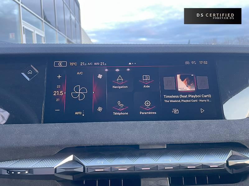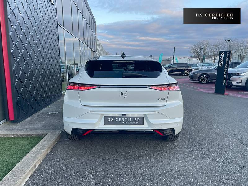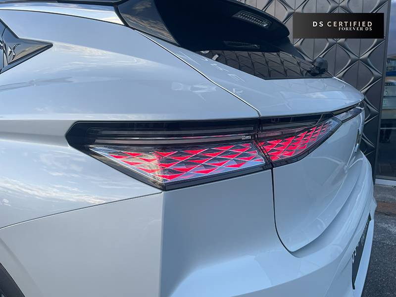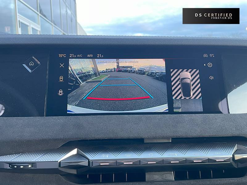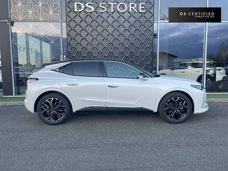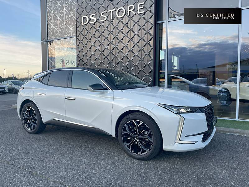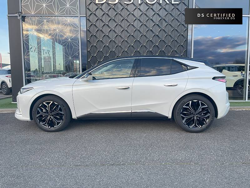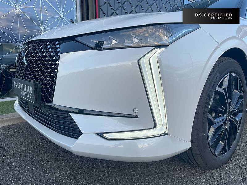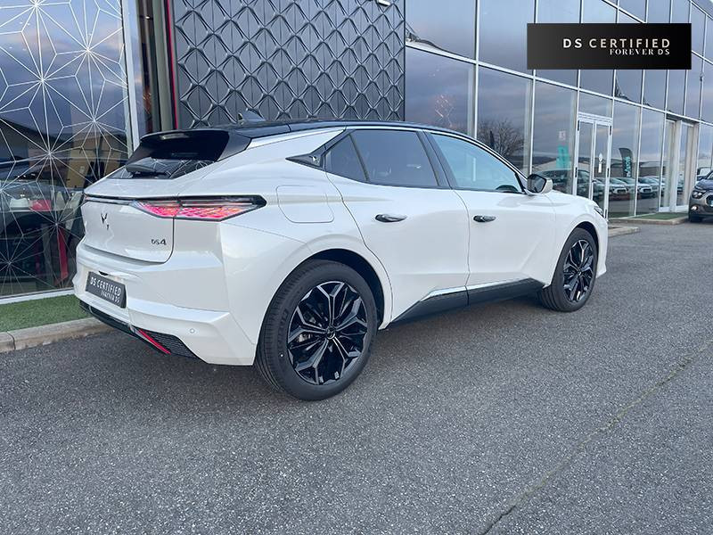 ABS avec répartiteur électronique de freinage (REF) et Aide au Freinage d'Urgence (AFU) Avec aide au démarrage en pente / Accès et Démarrage mains libres Proximity Déverrouillage et déploiement automatique des poignées de portes affleurantes à l'approche du véhicule / Accoudoir central AR avec trappe à ski et 2 porte-gobelets / Accoudoir central AV Avec grand rangement réfrigéré et éclairé / Adaptive Cruise Control Stop & Go / Aide au stationnement AV et AR et Caméra de recul / Airbags frontaux (passager déconnectable), latéraux AV, rideaux aux places AV/AR et central entre les places AV / Alerte attention conducteur / Alerte de franchissement involontaire de ligne Désactivable via l'écran tactile / Anneaux d'arrimage dans le coffre (x4) / Antenne "aileron de requin" Antenne noir brillant / Avertisseur de risque de collision / Badge de capot DS / Banquette AR 2/3 - 1/3 avec 3 appuie-tête / Banquette AR avec trappe à skis / Câble de recharge mode 2 standard 1,8 kW (10 A) / Cabochons d'écrous de roue noir brillant / Capot actif / Centre de roue Doré / Chargeur embarqué monophasé de 3,7 kW / Chargeur sans fil pour smartphone Norme QI, compatibilité smartphone à vérifier / Chiffre "4" doré / Clean Cabin avec Air Quality System / Climatisation automatique bizone 3 modes de diffusion Soft / Normal / Fast. Mode Monozone. Fonction Quick Launch via bouton dédié : froid ou chaud rapide selon la température extérieure. Aérateurs aux places AR / Combiné numérique 7" / Console centrale avec rangement fermé Avec dépose-téléphone et 2 porte-gobelets / Contrôle dynamique de stabilité (ESP) avec antipatinage des roues (ASR) + Contrôle de stabilité de l'attelage / Détection de sous-gonflage / Diffuseur AR noir brillant / Double filet décoratif doré / DS AIR (Aérateurs centraux invisibles avec sabre chrome) / DS e-toggle (Sélecteur de vitesses) / DS Wings noir brillant / Eclairage d'ambiance à LED Personnalisable avec 8 couleurs sur les panneaux de portes AV, la planche de bord et le repose paume / Eclairage de boîte à gants, d'accoudoir central AV et de coffre à LED / Eclairage de cave à pieds à LED / Ecran tactile capacitif 10" HD / Enjoliveurs de bas de porte noirs avec insert chromé / Enjoliveurs supérieurs des vitres latérales chromés / Essuie-vitre AR / Essuie-vitre AV à déclenchement et cadencement automatiques + Buses de lavage / Feux AR Full LED effet 3D avec traitement écailles / Fixations ISOFIX aux places latérales AR Inclut un point d'ancrage TOP TETHER / Freinage d'urgence automatique piloté par caméra et radar / Freinage multi-collision / Frein de stationnement électrique automatique / Grille de calandre noir brillant avec pampilles chromées / Intérieur Alcantara Noir / Jonc de volet chromé / Kit de dépannage provisoire de pneumatiques / Lécheurs de vitres latérales et enjoliveur de custode noir brillant / Lève-vitres AV et AR électriques, séquentiels et antipincement / Mirror Screen sans fil via Wifi Compatible Apple CarPlay et Android Auto / Monogramme DS chromé sur l'enjoliveur de custode latéral / Monogrammes AV/AR chromés / Pack Connect PLUS pour 3 ans / Pack sièges électriques Le réglage lombaires pneumatique. Le siège conducteur électrique à 10 voies avec mémoire de position, nez de coussin réglable mécaniquement et fonction accueil. Le siège passager électrique à 6 voies / Pare-brise teinté acoustique / Pare-soleil avec miroirs de courtoisie occultables éclairés à LED / Plafonnier I-Dome tactile Liseuses iDome à commandes tactiles à l'AR / Poignées extérieures affleurantes chromées / Préconditionnement thermique de l'habitacle programmable par smartphone / Prises 12 V 1 prise AV et 1 prise dans le coffre / Prises USB 1 prise USB-C sous l'accoudoir central AV, 1 prise USB-C dans la console et 2 prises USB-C pour les passagers AR / Rétroviseur intérieur électrochrome sans cadre / Rétroviseurs extérieurs électriques, dégivrants, rabattables électriquement Avec éclairage d'accueil / Sécurité Enfants Sécurité mécanique / Sièges AV avec mousse haute densité / SOS & Assistance / Teinte Caisse nacrée Noir Perla Nera / Vérins d'ouverture et de maintien du capot moteur / Vitres latérales AV feuilletées acoustiques