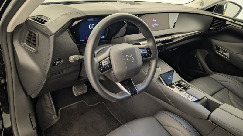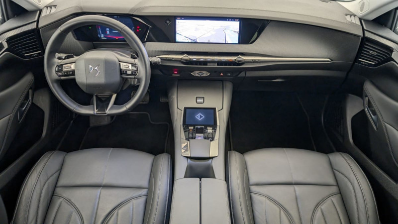 Kit de dépannage provisoire de pneumatiques / Frein de stationnement électrique automatique / Lève-vitres AV/AR électriques, séquentiels et antipincement / Rétroviseur intérieur électrochrome sans cadre / Alerte Attention Conducteur / Fixations ISOFIX à la place passager AV et aux places latérales AR / DS MATRIX LED VISION / Détection de sous-gonflage / Eclairage de boîte à gants, d'accoudoir central AV et de coffre à LED / Banquette AR 2/3 - 1/3 avec 3 appuie-tête / DS IRIS SYSTEM / Avertisseur de risque de collision / Combiné numérique 7" / DS e-toggle (Sélecteur de vitesses) / Freinage d'urgence automatique piloté par caméra et radar / ABS avec répartiteur électronique de freinage (REF) et Aide au Freinage d'Urgence (AFU) + Aide au démarrage en pente / Pare-brise teinté acoustique / Eclairage de cave à pieds à LED / Eclairage d'ambiance à LED / Mirror Screen sans fil via Wifi Compatible Apple CarPlay et Android Auto / Essuie-vitre AV à déclenchement et cadencement automatiques + Buses de lavage / Accès et démarrage mains libres Proximity / Aide au stationnement AV et AR et Caméra de recul / Accoudoir central AR avec trappe à ski et 2 porte-gobelets / Airbags frontaux (passager déconnectable), latéraux AV, rideaux aux places AV/AR et central entre les places AV / Feux AR Full LED effet 3D avec traitement écailles / Radio numérique terrestre (DAB) Inclut le Bluetooth / Rétroviseurs extérieurs électriques, dégivrants, rabattables électriquement Avec éclairage d'accueil / Ecran tactile capacitif 10" HD / DS Drive Assist et Pack Détection Trafic AR : Surveillance d'angles morts longue distance Alerte de Trafic AR / DS EXTENDED HEAD UP DISPLAY Affichage tete haute étendu / Intérieur Cuir grainé Noir Basalte et Toile DS : Ciel de pavillon clair Décors de panneaux de porte Chrome guilloché Volant en cuir fleur Mistral Console centrale en Toile DS Mistral Planche de bord en toile DS Noir Basalte façon écaille Panneaux de portes en toile DS Noir Basalte façon écaille Sellerie en Cuir grainé Noir Basalte et Toile DS / Pack Sièges mécaniques avec réglages lombaires conducteur et passager /