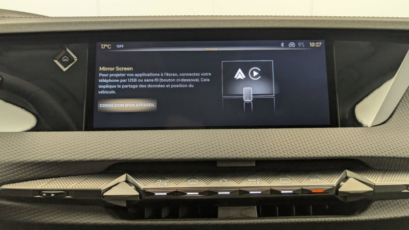 Kit de dépannage provisoire de pneumatiques / Frein de stationnement électrique automatique / Lève-vitres AV/AR électriques, séquentiels et antipincement / Freinage multi-collision / Rétroviseur intérieur électrochrome sans cadre / Alerte Attention Conducteur / Fixations ISOFIX à la place passager AV et aux places latérales AR / Vérins d'ouverture et de maintien du capot moteur / DS MATRIX LED VISION / Détection de sous-gonflage / Eclairage de boîte à gants, d'accoudoir central AV et de coffre à LED / Banquette AR 2/3 - 1/3 avec 3 appuie-tête / SOS / Banquette AR avec trappe à skis / DS IRIS SYSTEM / Avertisseur de risque de collision / Combiné numérique 7" / DS e-toggle (Sélecteur de vitesses) / Enjoliveurs supérieurs des vitres latérales chromés / Freinage d'urgence automatique piloté par caméra et radar / ABS avec répartiteur électronique de freinage (REF) et Aide au Freinage d'Urgence (AFU) + Aide au démarrage en pente / Grille de calandre noir brillant avec pampilles chromées / Eclairage de cave à pieds à LED / Eclairage d'ambiance à LED / Mirror Screen sans fil via Wifi Compatible Apple CarPlay et Android Auto / Essuie-vitre AV à déclenchement et cadencement automatiques / Accès et démarrage mains libres Proximity / Aide au stationnement AV et AR et Caméra de recul / Accoudoir central AR avec trappe à ski et 2 porte-gobelets / Airbags frontaux (passager déconnectable), latéraux AV, rideaux aux places AV/AR et central entre les places AV / Antenne "aileron de requin" / Contrôle dynamique de stabilité (ESP) avec antipatinage des roues (ASR) + Contrôle de stabilité de l'attelage / Diffuseur AR noir brillant avec décors d'échappement chromé / Feux AR Full LED effet 3D avec traitement écailles / Jonc de volet chromé / Pare-soleil avec miroirs de courtoisie occultables éclairés à LED / Prises 12 V 1 prise AV et 1 prise dans le coffre / Prises USB 1 prise USB-C sous l'accoudoir central AV, 1 prise USB-C dans la console et 2 prises USB-C pour les passagers AR / Radio numérique terrestre (DAB) Inclut le Bluetooth / Rétroviseurs extérieurs électriques, dégivrants, rabattables électriquement Avec éclairage d'accueil / Poignées extérieures affleurantes chromées / Ecran tactile capacitif 10" HD / Clean Cabin avec Air Quality System / DS Drive Assist et Pack Détection Trafic AR : Surveillance d'angles morts longue distance Alerte de Trafic AR / DS EXTENDED HEAD UP DISPLAY Affichage tete haute étendu / Intérieur Cuir grainé Noir Basalte et Toile DS : Ciel de pavillon clair Décors de panneaux de porte Chrome guilloché Volant en cuir fleur Mistral Console centrale en Toile DS Mistral Planche de bord en toile DS Noir Basalte façon écaille Panneaux de portes en toile DS Noir Basalte façon écaille Sellerie en Cuir grainé Noir Basalte et Toile DS / Plafonnier I-Dome /