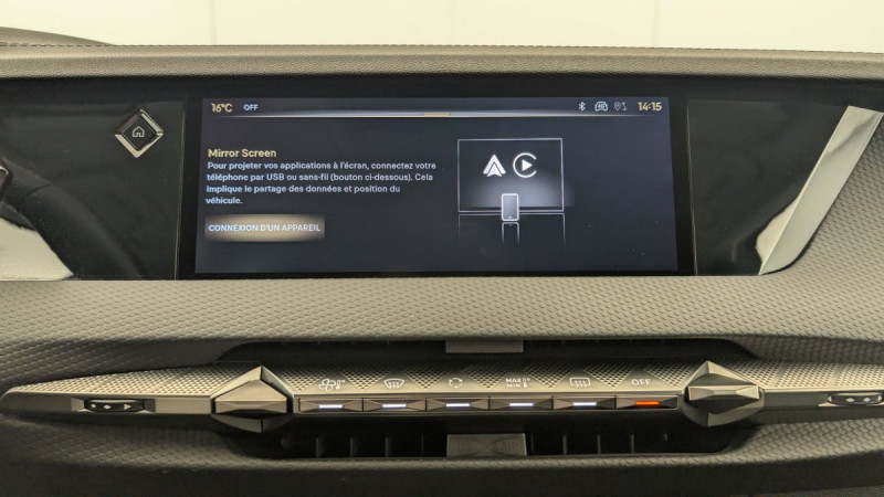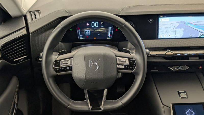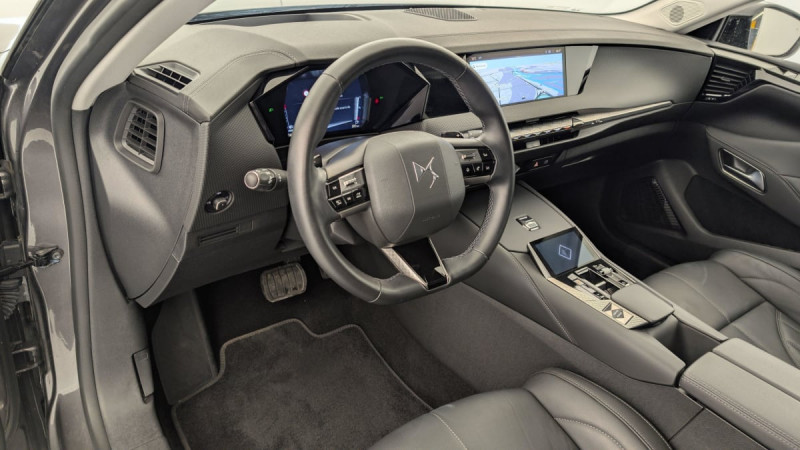 Kit de dépannage provisoire de pneumatiques / Frein de stationnement électrique automatique / Lève-vitres AV/AR électriques, séquentiels et antipincement / Rétroviseur intérieur électrochrome sans cadre / Alerte Attention Conducteur / Fixations ISOFIX à la place passager AV et aux places latérales AR / DS MATRIX LED VISION / Détection de sous-gonflage / Eclairage de boîte à gants, d'accoudoir central AV et de coffre à LED / Banquette AR 2/3 - 1/3 avec 3 appuie-tête / DS IRIS SYSTEM / Avertisseur de risque de collision / Combiné numérique 7" / DS e-toggle (Sélecteur de vitesses) / Freinage d'urgence automatique piloté par caméra et radar / ABS avec répartiteur électronique de freinage (REF) et Aide au Freinage d'Urgence (AFU) + Aide au démarrage en pente / Pare-brise teinté acoustique / Eclairage de cave à pieds à LED / Eclairage d'ambiance à LED / Mirror Screen sans fil via Wifi Compatible Apple CarPlay et Android Auto / Essuie-vitre AV à déclenchement et cadencement automatiques + Buses de lavage / Accès et démarrage mains libres Proximity / Aide au stationnement AV et AR et Caméra de recul / Accoudoir central AR avec trappe à ski et 2 porte-gobelets / Airbags frontaux (passager déconnectable), latéraux AV, rideaux aux places AV/AR et central entre les places AV / Feux AR Full LED effet 3D avec traitement écailles / Radio numérique terrestre (DAB) Inclut le Bluetooth / Rétroviseurs extérieurs électriques, dégivrants, rabattables électriquement Avec éclairage d'accueil / Ecran tactile capacitif 10" HD / DS Drive Assist et Pack Détection Trafic AR : Surveillance d'angles morts longue distance Alerte de Trafic AR / DS EXTENDED HEAD UP DISPLAY Affichage tete haute étendu / Intérieur Cuir grainé Noir Basalte et Toile DS : Ciel de pavillon clair Décors de panneaux de porte Chrome guilloché Volant en cuir fleur Mistral Console centrale en Toile DS Mistral Planche de bord en toile DS Noir Basalte façon écaille Panneaux de portes en toile DS Noir Basalte façon écaille Sellerie en Cuir grainé Noir Basalte et Toile DS / Pack Sièges mécaniques avec réglages lombaires conducteur et passager /