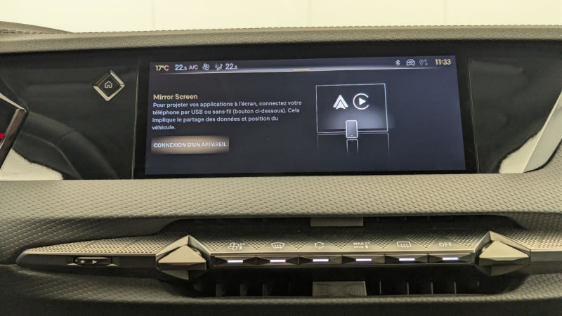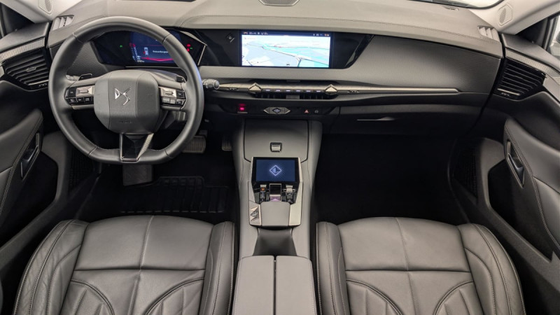 Kit de dépannage provisoire de pneumatiques / Frein de stationnement électrique automatique / Lève-vitres AV/AR électriques, séquentiels et antipincement / Rétroviseur intérieur électrochrome sans cadre / Fixations ISOFIX à la place passager AV et aux places latérales AR / DS MATRIX LED VISION / Détection de sous-gonflage / Eclairage de boîte à gants, d'accoudoir central AV et de coffre à LED / Banquette AR 2/3 - 1/3 avec 3 appuie-tête / SOS / DS IRIS SYSTEM / Combiné numérique 7" / DS e-toggle (Sélecteur de vitesses) / Freinage d'urgence automatique piloté par caméra et radar / ABS avec répartiteur électronique de freinage (REF) et Aide au Freinage d'Urgence (AFU) + Aide au démarrage en pente / Pare-brise teinté acoustique / Eclairage de cave à pieds à LED / Eclairage d'ambiance à LED / Mirror Screen sans fil via Wifi Compatible Apple CarPlay et Android Auto / Essuie-vitre AV à déclenchement et cadencement automatiques + Buses de lavage / Accès et démarrage mains libres Proximity / Aide au stationnement AV et AR et Caméra de recul / Airbags frontaux (passager déconnectable), latéraux AV, rideaux aux places AV/AR et central entre les places AV / Contrôle dynamique de stabilité (ESP) avec antipatinage des roues (ASR) + Contrôle de stabilité de l'attelage / Feux AR Full LED effet 3D avec traitement écailles / Pare-soleil avec miroirs de courtoisie occultables éclairés à LED / Radio numérique terrestre (DAB) Inclut le Bluetooth / Rétroviseurs extérieurs électriques, dégivrants, rabattables électriquement Avec éclairage d'accueil / Ecran tactile capacitif 10" HD / Clean Cabin avec Air Quality System / DS Drive Assist et Pack Détection Trafic AR : Adaptive Cruise Control Stop & Go Surveillance d'angles morts longue distance Alerte de Trafic AR Lane Positioning Assist afin de gérer la conduite de manière semi-autonome / DS EXTENDED HEAD UP DISPLAY Affichage tete haute étendu / Intérieur Cuir grainé Noir Basalte et Toile DS : Ciel de pavillon clair Décors de panneaux de porte Chrome guilloché Volant en cuir fleur Mistral Console centrale en Toile DS Mistral Planche de bord en toile DS Noir Basalte façon écaille Panneaux de portes en toile DS Noir Basalte façon écaille Sellerie en Cuir grainé Noir Basalte et Toile DS Parties centrales des sièges AV, partie centrale des sièges latéraux AR et partie AV des appuie-tête en cuir. Bourrelets latéraux des sièges AV, accoudoir central et siège central AR, et parties latérales et AR des appuis tête en Toile DS. / Pack Sièges mécaniques avec réglages lombaires conducteur et passager /
