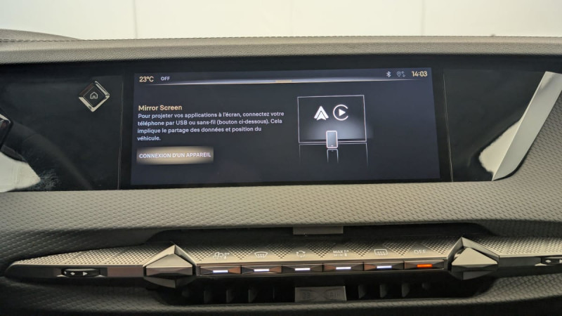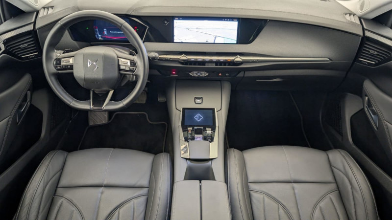 Kit de dépannage provisoire de pneumatiques / Frein de stationnement électrique automatique / Lève-vitres AV/AR électriques, séquentiels et antipincement / Rétroviseur intérieur électrochrome sans cadre / Alerte Attention Conducteur / Fixations ISOFIX à la place passager AV et aux places latérales AR / DS MATRIX LED VISION / Détection de sous-gonflage / Eclairage de boîte à gants, d'accoudoir central AV et de coffre à LED / Banquette AR 2/3 - 1/3 avec 3 appuie-tête / DS IRIS SYSTEM / Surveillance d'angles morts longue distance / Combiné numérique 7" / DS e-toggle (Sélecteur de vitesses) / Freinage d'urgence automatique piloté par caméra et radar / ABS avec répartiteur électronique de freinage (REF) et Aide au Freinage d'Urgence (AFU) + Aide au démarrage en pente / Pare-brise teinté acoustique / Eclairage de cave à pieds / Mirror Screen sans fil via Wifi Compatible Apple CarPlay et Android Auto / Essuie-vitre AV à déclenchement et cadencement automatiques + Buses de lavage / Accès et démarrage mains libres Proximity / Aide au stationnement AV et AR et Caméra de recul / Airbags frontaux (passager déconnectable), latéraux AV, rideaux aux places AV/AR et central entre les places AV / Antenne "aileron de requin" / Console centrale avec rangement fermé / Contrôle dynamique de stabilité (ESP) avec antipatinage des roues (ASR) + Contrôle de stabilité de l'attelage / Feux AR Full LED effet 3D avec traitement écailles / Pare-soleil avec miroirs de courtoisie occultables éclairés à LED / Radio numérique terrestre (DAB) Inclut le Bluetooth / Rétroviseurs extérieurs électriques, dégivrants, rabattables électriquement Avec éclairage d'accueil / Ecran tactile capacitif 10" HD / DS Drive Assist et Pack Détection Trafic AR : Adaptive Cruise Control Stop & Go Surveillance d'angles morts longue distance Alerte de Trafic AR Lane Positioning Assist afin de gérer la conduite de manière semi-autonome / DS EXTENDED HEAD UP DISPLAY Affichage tete haute étendu / Intérieur Cuir grainé Noir Basalte et Toile DS : Ciel de pavillon clair Décors de panneaux de porte Chrome guilloché Volant en cuir fleur Mistral Console centrale en Toile DS Mistral Planche de bord en toile DS Noir Basalte façon écaille Panneaux de portes en toile DS Noir Basalte façon écaille Sellerie en Cuir grainé Noir Basalte et Toile DS Parties centrales des sièges AV, partie centrale des sièges latéraux AR et partie AV des appuie-tête en cuir. Bourrelets latéraux des sièges AV, accoudoir central et siège central AR, et parties latérales et AR des appuis tête en Toile DS. / Pack Sièges mécaniques avec réglages lombaires conducteur et passager /