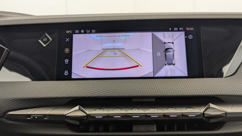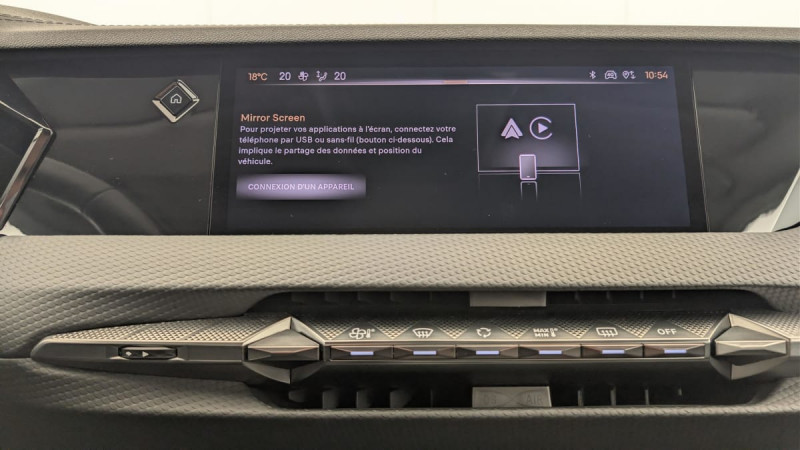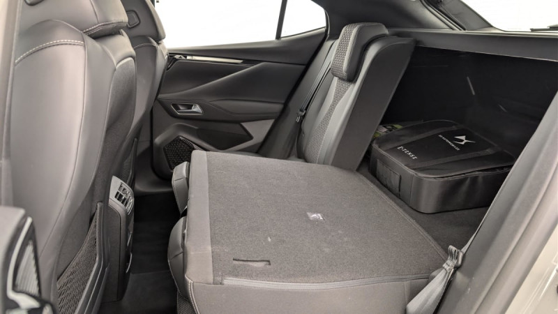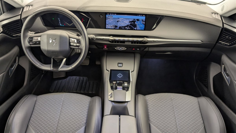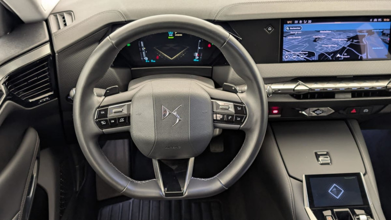 Frein de stationnement électrique automatique / Allumage automatique des feux de détresse en cas de forte décélération / Contrôle de traction intelligent / Pack Auto Confort : Climatisation automatique bi-zone Essuie-vitre AV à déclenchement et cadencement automatiques Allumage automatique des projecteurs / Eclairage d'accueil automatique / Lève-vitres AV/AR électriques, séquentiels et antipincement / Rétroviseur intérieur électrochrome sans cadre / Climatisation avec aérateurs aux places AR / Fixations ISOFIX à la place passager AV et aux places latérales AR / Pare-brise teinté et acoustique / Verrouillage automatique des portes en roulant / DS ACTIVE SCAN SUSPENSION Système de suspension pilotée par caméra / Airbags frontaux aux places AV avec désactivation par clé de l'airbag passager / Contrôle dynamique de stabilité (ESP) avec antipatinage des roues (ASR) / ADML PROXIMITY Accès et démarrage Mains-Libres ave déverrouillage et déploiement automatique des poignées de portes affleurantes à l'approche du véhicule / Détection de sous-gonflage / Eclairage d'accompagnement / Airbags latéraux de type "thorax" aux places AV / Banquette AR 2/3 - 1/3 avec 3 appuie-tête / Chargeur embarqué de 7,4 kW / ABS avec répartiteur électronique de freinage (REF) et Aide au Freinage d'Urgence (AFU) / Feux AR 3D (traitement écailles) Avec indicateur de changement de direction défilant / Kit de dépannage provisoire / Câble de recharge mode 2 standard 1,8 kW (8 A) / Câble de recharge mode 3 monophasé 7,4kW / Barres de toit Noires brillantes / Eclairage PolyAmbient / DS EXTENDED HEAD UP DISPLAY / DS IRIS SYSTEM / DS SMART TOUCH / SOS / Airbag central entre les places AV / Console centrale avec 2 porte-gobelets / Combiné numérique 7" / Système audio Analogique à 6 HP avec Bluetooth / Intérieur toile DS Noir : Plip avec insert Trame DS Sièges AV à haute densité Volant Cuir gainé avec insert Noir Brillant Guillochage "Clous de Paris" Platine Décor Noir Basalte façon écaille Sellerie en Tissu Diamond Tungstène avec toile DS Noir Basalte / DS e-toggle (Sélecteur de vitesses) / Système Infotainment écran 10" tactile avec Mirror Screen sans fil / Pare Soleil en tissu avec éclairage à LED / Sièges AV avec réglage lombaires /