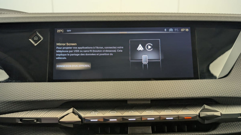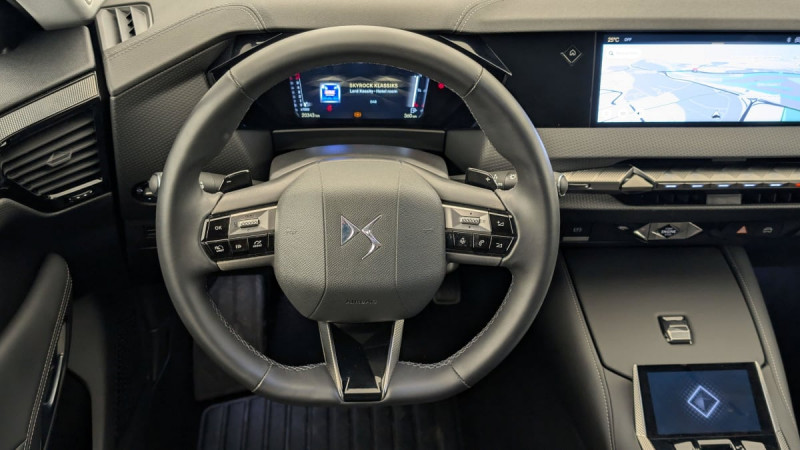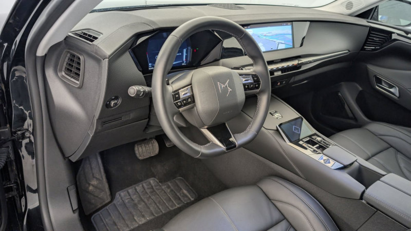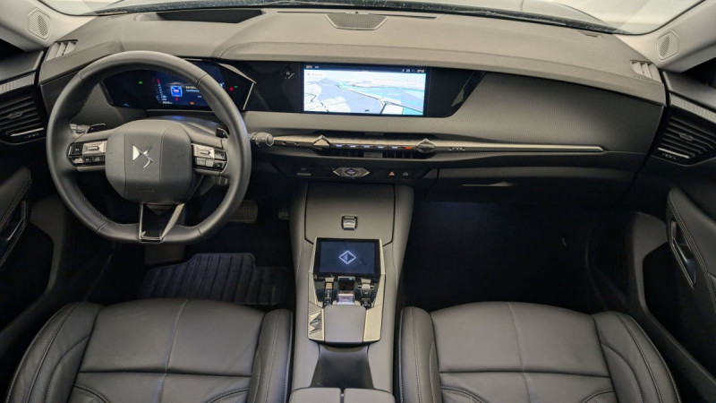Kit de dépannage provisoire de pneumatiques / Frein de stationnement électrique automatique / Lève-vitres AV/AR électriques, séquentiels et antipincement / Rétroviseur intérieur électrochrome sans cadre / Alerte Attention Conducteur / Fixations ISOFIX à la place passager AV et aux places latérales AR / DS MATRIX LED VISION / Détection de sous-gonflage / Eclairage de boîte à gants, d'accoudoir central AV et de coffre à LED / Banquette AR 2/3 - 1/3 avec 3 appuie-tête / DS IRIS SYSTEM / Avertisseur de risque de collision / Combiné numérique 7" / DS e-toggle (Sélecteur de vitesses) / Freinage d'urgence automatique piloté par caméra et radar / ABS avec répartiteur électronique de freinage (REF) et Aide au Freinage d'Urgence (AFU) + Aide au démarrage en pente / Pare-brise teinté acoustique / Eclairage de cave à pieds à LED / Eclairage d'ambiance à LED / Mirror Screen sans fil via Wifi Compatible Apple CarPlay et Android Auto / Essuie-vitre AV à déclenchement et cadencement automatiques + Buses de lavage / Accès et démarrage mains libres Proximity / Aide au stationnement AV et AR et Caméra de recul / Accoudoir central AR avec trappe à ski et 2 porte-gobelets / Airbags frontaux (passager déconnectable), latéraux AV, rideaux aux places AV/AR et central entre les places AV / Feux AR Full LED effet 3D avec traitement écailles / Radio numérique terrestre (DAB) Inclut le Bluetooth / Rétroviseurs extérieurs électriques, dégivrants, rabattables électriquement Avec éclairage d'accueil / Ecran tactile capacitif 10" HD / DS Drive Assist et Pack Détection Trafic AR : Surveillance d'angles morts longue distance Alerte de Trafic AR / DS EXTENDED HEAD UP DISPLAY Affichage tete haute étendu / Intérieur Cuir grainé Noir Basalte et Toile DS : Ciel de pavillon clair Décors de panneaux de porte Chrome guilloché Volant en cuir fleur Mistral Console centrale en Toile DS Mistral Planche de bord en toile DS Noir Basalte façon écaille Panneaux de portes en toile DS Noir Basalte façon écaille Sellerie en Cuir grainé Noir Basalte et Toile DS / Pack Sièges mécaniques avec réglages lombaires conducteur et passager /
