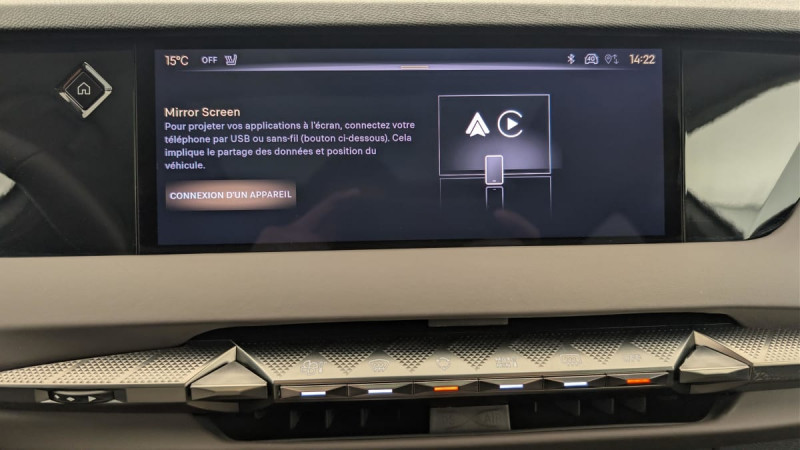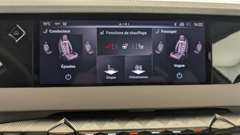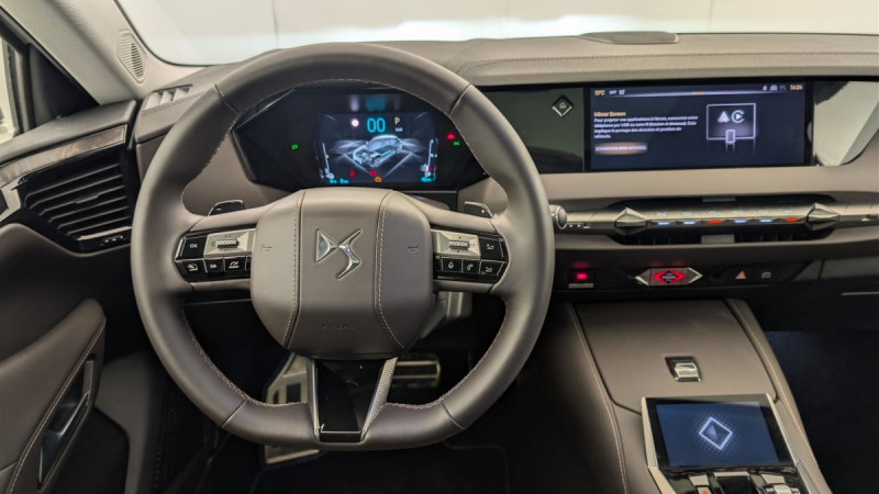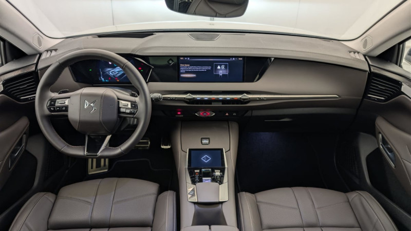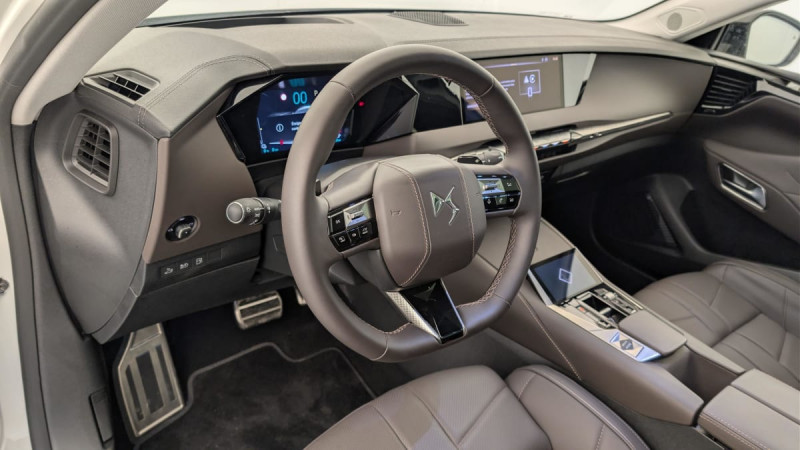 Kit de dépannage provisoire de pneumatiques / Pédalier en aluminium / Frein de stationnement électrique automatique / Lève-vitres AV/AR électriques, séquentiels et antipincement / Freinage multi-collision / Rétroviseur intérieur électrochrome sans cadre / Alerte Attention Conducteur / Fixations ISOFIX à la place passager AV et aux places latérales AR / Hayon motorisé avec Accès Bras Chargés / Vérins d'ouverture et de maintien du capot moteur / DS MATRIX LED VISION / Détection de sous-gonflage / Eclairage de boîte à gants, d'accoudoir central AV et de coffre à LED / Banquette AR 2/3 - 1/3 avec 3 appuie-tête / SOS & Assistance / Banquette AR avec trappe à skis / Pack Sièges Electriques avec sièges AV chauffants, massants et ventilés : Sièges AV chauffants Sièges AV avec réglages lombaires électriques Sièges AV massants et ventilés Siège conducteur avec nez de coussin réglable Siège conducteur électrique à 10 voies à mémorisation de position Siège passager AV électrique à 6 voies Appuie-têtes à 4 voies Volant chauffant / DS IRIS SYSTEM / Avertisseur de risque de collision / Combiné numérique 7" / DS e-toggle (Sélecteur de vitesses) / Freinage d'urgence automatique piloté par caméra et radar / ABS avec répartiteur électronique de freinage (REF) et Aide au Freinage d'Urgence (AFU) + Aide au démarrage en pente / Pare-brise teinté acoustique / Aide au stationnement AV/AR et 360 Vision / Vitres latérales feuilletées acoustiques / Grille de calandre noir brillant avec pampilles chromées / Eclairage de cave à pieds à LED / Eclairage d'ambiance à LED / Mirror Screen sans fil via Wifi Compatible Apple CarPlay et Android Auto / Essuie-vitre AV à déclenchement et cadencement automatiques + Buses de lavage / Accès et démarrage mains libres Proximity / Accoudoir central AR avec trappe à ski et 2 porte-gobelets / Airbags frontaux (passager déconnectable), latéraux AV, rideaux aux places AV/AR et central entre les places AV / Antenne "aileron de requin" / Console centrale avec rangement fermé / Contrôle dynamique de stabilité (ESP) avec antipatinage des roues (ASR) + Contrôle de stabilité de l'attelage / Câble de recharge mode 2 standard 1,8 kW (10 A) / DS AIR (Aérateurs centraux invisibles avec sabre chrome) / DS SMART TOUCH / Diffuseur AR noir brillant avec décors d'échappement chromé / Feux AR Full LED effet 3D avec traitement écailles / Pare-soleil avec miroirs de courtoisie occultables éclairés à LED / Prises 12 V 1 prise AV et 1 prise dans le coffre / Prises USB 1 prise USB-C sous l'accoudoir central AV, 1 prise USB-C dans la console et 2 prises USB-C pour les passagers AR / Radio numérique terrestre (DAB) Inclut le Bluetooth / Rétroviseurs extérieurs électriques, dégivrants, rabattables électriquement Avec éclairage d'accueil / Rétroviseurs extérieurs électrochromes Avec indexation à la marche AR et projection de logo au sol / Toit ouvrant électrique Entrebaillant, ouvrant, occulteur manuel / Poignées extérieures affleurantes chromées / Ecran tactile capacitif 10" HD / Intérieur Cuir Nappa Brun Criollo confection Bracelet : Planche de bord en cuir nappa Brun Criollo Volant Cuir gainé avec Brun Criollo avec coussin d'airbag Cuir gainé Brun Criollo Console centrale en cuir nappa Brun Criollo Ciel de pavillon clair Sellerie en Cuir Nappa Brun Criollo confection Bracelet Volant en cuir fleur Brun Criollo avec coussin d'airbag en cuir fleur Panneaux de porte en cuir nappa Brun Criollo Décors de panneaux de porte Frêne Brun / Clean Cabin avec Air Quality System / Chargeur sans fil pour smartphone / Alarme périmétrique, volumétrique et fonction anti-soulèvement, avec Supercondamnation / DS Drive Assist et Pack Détection Trafic AR : Surveillance d'angles morts longue distance Alerte de Trafic AR / DS EXTENDED HEAD UP DISPLAY Affichage tete haute étendu / Chargeur embarqué monophasé de 3,3 kW / DS ACTIVE SCAN SUSPENSION / Plafonnier I-Dome /