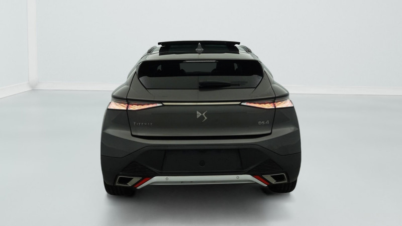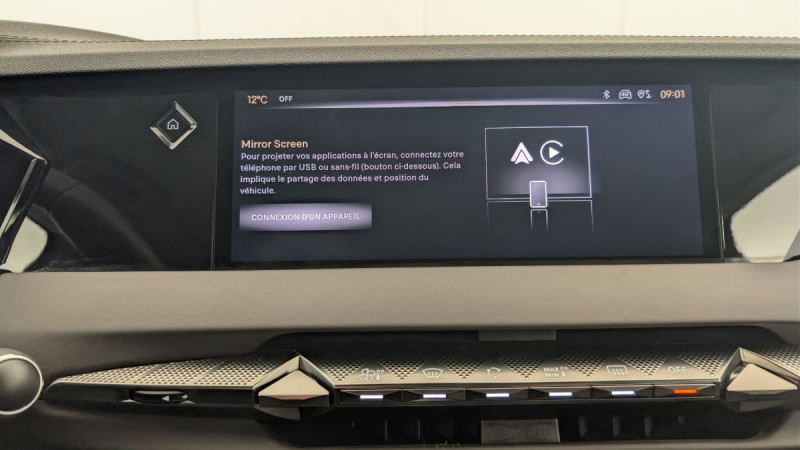 Frein de stationnement électrique automatique / Allumage automatique des feux de détresse en cas de forte décélération / Contrôle de traction intelligent / Pack Auto Confort : Climatisation automatique bi-zone Essuie-vitre AV à déclenchement et cadencement automatiques Allumage automatique des projecteurs / Eclairage d'accueil automatique / Lève-vitres AV/AR électriques, séquentiels et antipincement / Pack Sécurité Etendue : Alerte Active de Franchissement Involontaire de Ligne (AAFIL) Alerte Attention Conducteur par caméra Reconnaissance étendue des panneaux de circulation Freinage d'urgence automatique piloté par caméra et radar avec Pack Sécurité Etendue, DS DRIVE ASSIST et Pack Détection Trafic Arrière / Rétroviseur intérieur électrochrome sans cadre / Pédalier et le repose-pied aluminium / Climatisation avec aérateurs aux places AR / Fixations ISOFIX à la place passager AV et aux places latérales AR / Pare-brise teinté et acoustique / Verrouillage automatique des portes en roulant / DS ACTIVE SCAN SUSPENSION Système de suspension pilotée par caméra / Airbags frontaux aux places AV avec désactivation par clé de l'airbag passager / Contrôle dynamique de stabilité (ESP) avec antipatinage des roues (ASR) / ADML PROXIMITY Accès et démarrage Mains-Libres ave déverrouillage et déploiement automatique des poignées de portes affleurantes à l'approche du véhicule / DS MATRIX LED VISION / Détection de sous-gonflage / Commutation automatique des feux de route / Eclairage d'accompagnement / Fonction freinage régénératif / Airbags latéraux de type "thorax" aux places AV / Banquette AR 2/3 - 1/3 avec 3 appuie-tête / Chargeur embarqué de 7,4 kW / ABS avec répartiteur électronique de freinage (REF) et Aide au Freinage d'Urgence (AFU) / Kit de dépannage provisoire / Câble de recharge mode 2 standard 1,8 kW (8 A) / Câble de recharge mode 3 monophasé 7,4kW / Barres de toit Noires brillantes / Vitres AR surteintées avec Reflective Design / Eclairage PolyAmbient / Clean Cabin avec Air Quality System / DS EXTENDED HEAD UP DISPLAY / DS IRIS SYSTEM / DS SMART TOUCH / SOS / Airbag central entre les places AV / Feux AR 3D (traitement écailles) avec indicateur défilant à LED / Aérateurs latéraux AV déportés sur les portes / Combiné numérique 7" / Système audio Analogique à 6 HP avec Bluetooth / Antenne radio "Aileron de requin" / Freinage d'urgence automatique piloté par caméra et radar avec Pack Sécurité Etendue, DS DRIVE ASSIST et Pack Détection Trafic Arrière / DS e-toggle (Sélecteur de vitesses) / Système Infotainment écran 10" tactile avec Mirror Screen sans fil / Fonction de conduite préférée / Pack Détection Trafic AR : Surveillance d'angles morts longue distance Alerte de Trafic AR / Pack DS DRIVE ASSIST : Adaptive Cruise Control Stop & Go Lane Positioning Assist / Appuie-tête à réglages intégrés à 4 voies /