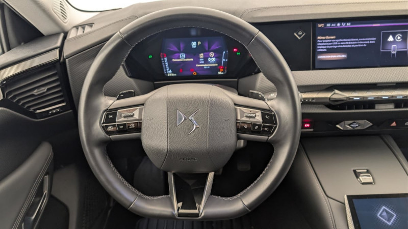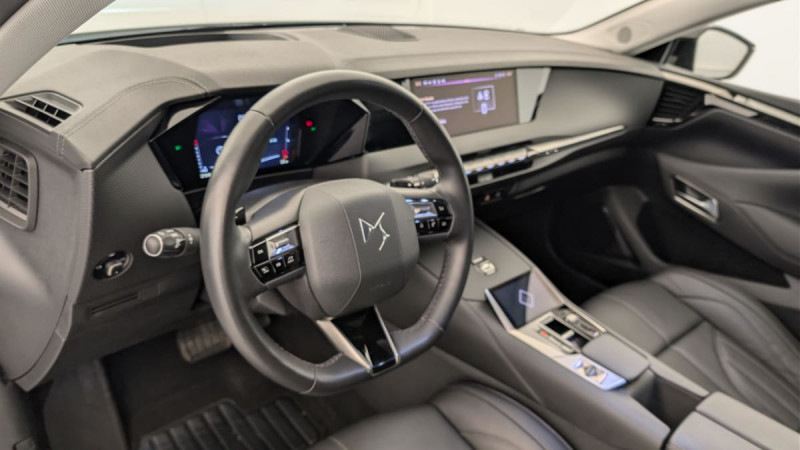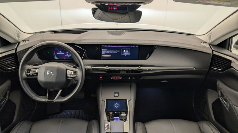 Kit de dépannage provisoire de pneumatiques / Frein de stationnement électrique automatique / Lève-vitres AV/AR électriques, séquentiels et antipincement / Rétroviseur intérieur électrochrome sans cadre / Alerte Attention Conducteur / Fixations ISOFIX à la place passager AV et aux places latérales AR / DS MATRIX LED VISION / Détection de sous-gonflage / Eclairage de boîte à gants, d'accoudoir central AV et de coffre à LED / Banquette AR 2/3 - 1/3 avec 3 appuie-tête / DS IRIS SYSTEM / Avertisseur de risque de collision / Combiné numérique 7" / DS e-toggle (Sélecteur de vitesses) / Freinage d'urgence automatique piloté par caméra et radar / ABS avec répartiteur électronique de freinage (REF) et Aide au Freinage d'Urgence (AFU) + Aide au démarrage en pente / Pare-brise teinté acoustique / Eclairage de cave à pieds à LED / Eclairage d'ambiance à LED / Mirror Screen sans fil via Wifi Compatible Apple CarPlay et Android Auto / Essuie-vitre AV à déclenchement et cadencement automatiques + Buses de lavage / Accès et démarrage mains libres Proximity / Aide au stationnement AV et AR et Caméra de recul / Accoudoir central AR avec trappe à ski et 2 porte-gobelets / Airbags frontaux (passager déconnectable), latéraux AV, rideaux aux places AV/AR et central entre les places AV / Feux AR Full LED effet 3D avec traitement écailles / Radio numérique terrestre (DAB) Inclut le Bluetooth / Rétroviseurs extérieurs électriques, dégivrants, rabattables électriquement Avec éclairage d'accueil / Ecran tactile capacitif 10" HD / DS Drive Assist et Pack Détection Trafic AR : Surveillance d'angles morts longue distance Alerte de Trafic AR / DS EXTENDED HEAD UP DISPLAY Affichage tete haute étendu / Intérieur Cuir grainé Noir Basalte et Toile DS : Ciel de pavillon clair Décors de panneaux de porte Chrome guilloché Volant en cuir fleur Mistral Console centrale en Toile DS Mistral Planche de bord en toile DS Noir Basalte façon écaille Panneaux de portes en toile DS Noir Basalte façon écaille Sellerie en Cuir grainé Noir Basalte et Toile DS / Pack Sièges mécaniques avec réglages lombaires conducteur et passager /