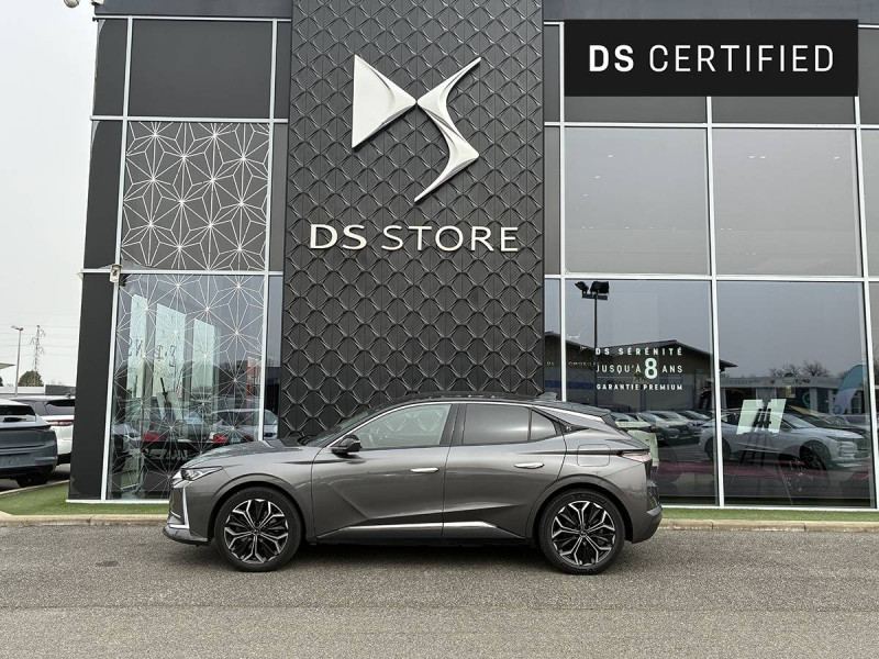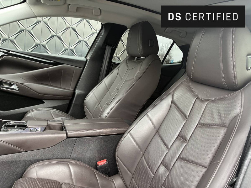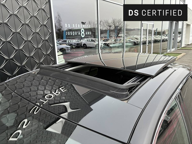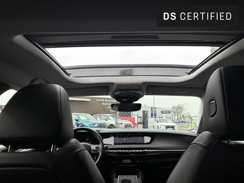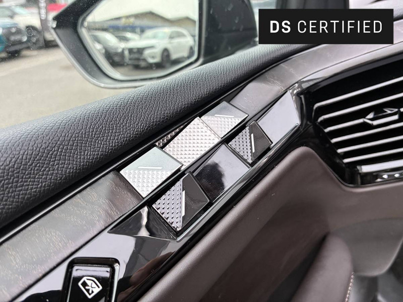 ABS avec répartiteur électronique de freinage (REF) et Aide au Freinage d'Urgence (AFU) / Accès et Démarrage mains libres Proximity (ADML Proximity) Déverrouillage et déploiement automatique des poignées de portes affleurantes à l'approche du véhicule / Adaptive Cruise Control Stop & Go / Aérateurs latéraux AV déportés sur les portes / Aide au stationnement AV/AR avec Caméra de recul / Airbag central entre les places AV / Airbags frontaux aux places AV avec désactivation par clé de l'airbag passager / Airbags latéraux de type "thorax" aux places AV / Alerte Attention Conducteur / Allumage automatique des feux de détresse en cas de forte décélération / Antenne radio "Aileron de requin" / Appuie-tête AV à réglages intégrés à 4 voies / Avertisseur bi-ton / Avertisseur de risque de collision / Banquette AR 2/3 - 1/3 avec 3 appuie-tête / Banquette AR avec trappe à skis / Bas de portières avec insert Chromé / Câble de recharge mode 2 standard 1,8 kW (8 A) / Câble de recharge mode 3 monophasé 7,4kW / Cabochons d'écrous de roue noir brillant / Calandre surmontée de l'emblème E-TENSE / Chargeur embarqué de 7,4 kW / Clean Cabin avec Air Quality System / Clignotants impulsionnels 3 coups / Combiné numérique 7" / Commutation automatique des feux de route / Console centrale avec 2 porte-gobelets / Console centrale avec compartiment rangement fermé / Contrôle de traction intelligent / Contrôle dynamique de stabilité (ESP) avec antipatinage des roues (ASR) / Coques de rétroviseurs extérieurs Noir Perla Nera / Crochet d'arrimage dans le coffre au dessus du plancher de coffre x4 / Démarrage Mains-Libres avec décor Trame DS sur la clé / Détection de sous-gonflage / Double canule d'échappement chromée / DS ACTIVE SCAN SUSPENSION Système de suspension pilotée par caméra / DS AIR (Aérateurs invisibles) / DS e-toggle (Sélecteur de vitesses) / DS EXTENDED HEAD UP DISPLAY / DS IRIS SYSTEM / DS MATRIX LED VISION / DS SMART TOUCH / DS Wings chromées / Eclairage d'accompagnement / Eclairage d'accueil automatique / Eclairage PolyAmbient / Enjoliveurs supérieurs des vitres latérales chromés / Essuie-vitre AV à déclenchement et cadencement automatiques / Feux AR 3D (traitement écailles) avec indicateur défilant à LED / Filet de rangement au dos des sièges AV / Filtre habitacle à haute efficacité (anti-particules fines) / Fixations ISOFIX à la place passager AV et aux places latérales AR / Fonction de conduite préférée / Fonction freinage régénératif / Freinage d'urgence automatique piloté par caméra et radar avec Pack Sécurité Etendue, DS DRIVE ASSIST et Pack Détection Trafic Arrière / Freinage multi-collision / Frein de stationnement électrique automatique / Grille de calandre AV Noir Brillant avec Diamants Chromés / Guide utilisateur numérique / Indicateur de rapports engagés / Intérieur Cuir Noir Basalte / Jonc sur volet entre feux Chromé / Kit de dépannage provisoire / Lane Positioning Assist / Lécheurs de vitres Noir Brillant / Lève-vitres AV/AR électriques, séquentiels et antipincement / Menu spécifique E-TENSE dans l´écran tactile 10,3" pour optimiser les performances énergétiques / Ouverture et fermeture des vitres à distance / Pack Détection Trafic AR / Pack DS DRIVE ASSIST / Pack Sécurité Etendue / Pack style Rivoli / Pare-choc AR avec finition Noire Brillante / Pare-choc AV couleur carrosserie / Pare Soleil rembourrés en tissu avec éclairage à LED / Pédalier et le repose-pied aluminium / Pieds de rétroviseurs extérieurs couleur carrosserie / Planche de coffre avec zone de rangement intégrée pour le câble de recharge / Poignées de portes affleurantes / Préconditionnement thermique du véhicule / Prise 12 V dans le coffre / Prises USB x2 aux places AR / Prise USB Data à l'AV / Reconnaissance vocale / Rétroviseur intérieur électrochrome sans cadre / Sacoche de rangement de câble de recharge mode 3 monophasé 7,4 kW avec paire de gants / Sangle de coffre / Seuil de coffre chromé / Seuils de portes en métal avec Trame DS / Sièges AV à haute densité / Signature E-TENSE sur le hayon / SOS & Assistance / Surtapis AV/AR / Système audio Analogique à 6 HP avec Bluetooth / Système Infotainment écran 10" tactile avec Mirror Screen sans fil / Témoin et alerte sonore de non-bouclage des ceintures de sécurité AV/AR / Trappe de recharge côté gauche / Vérins d'ouverture et de maintien du capot moteur / Verrouillage automatique des portes en roulant / Vitres AR surteintées avec Reflective Design / Volant Cuir gainé avec insert Noir Brillant / Zone De Danger (pendant 3 ans)