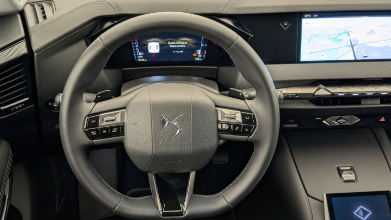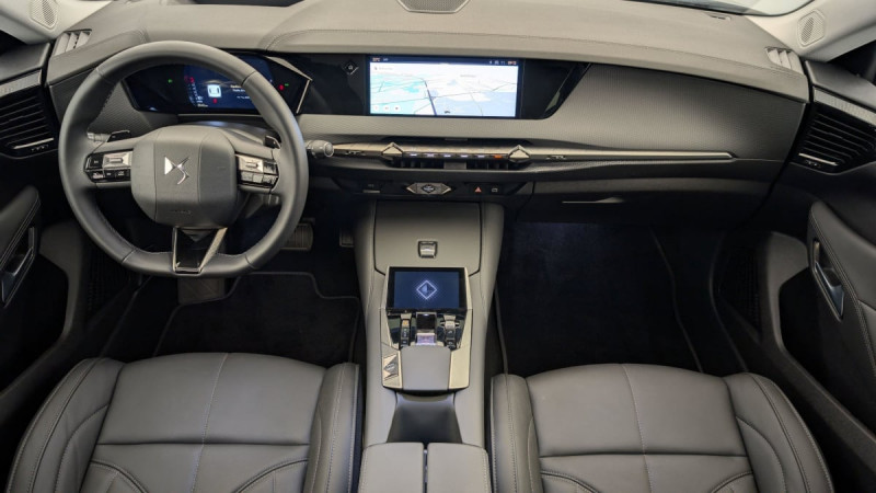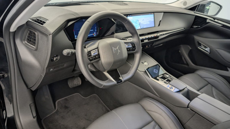 Kit de dépannage provisoire de pneumatiques / Frein de stationnement électrique automatique / Lève-vitres AV/AR électriques, séquentiels et antipincement / Freinage multi-collision / Rétroviseur intérieur électrochrome sans cadre / Alerte Attention Conducteur / Fixations ISOFIX à la place passager AV et aux places latérales AR / DS MATRIX LED VISION / Détection de sous-gonflage / Eclairage de boîte à gants, d'accoudoir central AV et de coffre à LED / Banquette AR 2/3 - 1/3 avec 3 appuie-tête / Teinte Caisse nacrée Noir Perla Nera / SOS / Banquette AR avec trappe à skis / Avertisseur de risque de collision / Surveillance d'angles morts longue distance / Combiné numérique 7" / DS e-toggle (Sélecteur de vitesses) / Enjoliveurs supérieurs des vitres latérales chromés / Freinage d'urgence automatique piloté par caméra et radar / ABS avec répartiteur électronique de freinage (REF) et Aide au Freinage d'Urgence (AFU) + Aide au démarrage en pente / Pare-brise teinté acoustique / Eclairage de cave à pieds à LED / Eclairage d'ambiance à LED / Mirror Screen sans fil via Wifi Compatible Apple CarPlay et Android Auto / Préconditionnement thermique de l'habitacle programmable par smartphone Via MyDS App / Essuie-vitre AV à déclenchement et cadencement automatiques + Buses de lavage / Accès et démarrage mains libres Proximity / Aide au stationnement AV et AR et Caméra de recul / Airbags frontaux (passager déconnectable), latéraux AV, rideaux aux places AV/AR et central entre les places AV / Antenne "aileron de requin" / Console centrale avec rangement fermé / Contrôle dynamique de stabilité (ESP) avec antipatinage des roues (ASR) + Contrôle de stabilité de l'attelage / Feux AR Full LED effet 3D avec traitement écailles / Pare-soleil avec miroirs de courtoisie occultables éclairés à LED / Prises USB 1 prise USB-C sous l'accoudoir central AV, 1 prise USB-C dans la console et 2 prises USB-C pour les passagers AR / Prédisposition pour roue de secours galette / Radio numérique terrestre (DAB) Inclut le Bluetooth / Rétroviseurs extérieurs électriques, dégivrants, rabattables électriquement avec éclairage d'accueil / Seuil de coffre aluminium / Capot actif / Monogramme extérieur sur le capot chromé / Poignées extérieures affleurantes chromées / Ecran tactile capacitif 10" HD / Clean Cabin avec Air Quality System / DS Drive Assist et Pack Détection Trafic AR : Adaptive Cruise Control Stop & Go Surveillance d'angles morts longue distance Alerte de Trafic AR Lane Positioning Assist afin de gérer la conduite de manière semi-autonome / DS EXTENDED HEAD UP DISPLAY Affichage tete haute étendu / Intérieur Cuir grainé Noir Basalte et Toile DS : Ciel de pavillon clair Décors de panneaux de porte Chrome guilloché Volant en cuir fleur Mistral Console centrale en Toile DS Mistral Planche de bord en toile DS Noir Basalte façon écaille Panneaux de portes en toile DS Noir Basalte façon écaille Sellerie en Cuir grainé Noir Basalte et Toile DS Parties centrales des sièges AV, partie centrale des sièges latéraux AR et partie AV des appuie-tête en cuir. Bourrelets latéraux des sièges AV, accoudoir central et siège central AR, et parties latérales et AR des appuis tête en Toile DS. / Plafonnier I-Dome / Pack Sièges mécaniques avec réglages lombaires conducteur et passager /