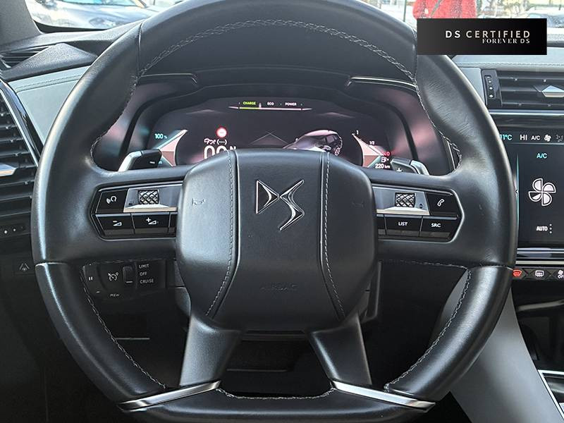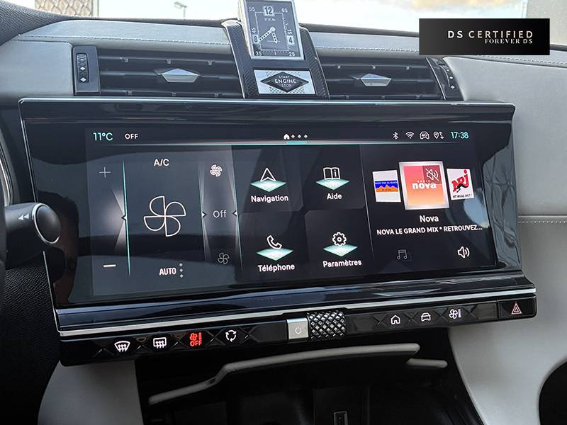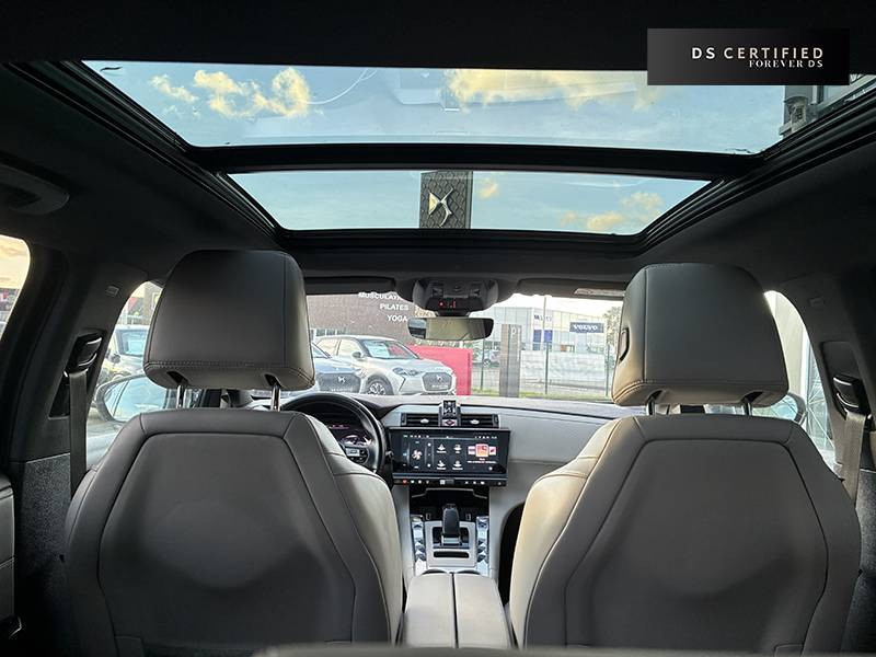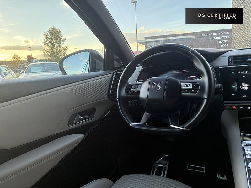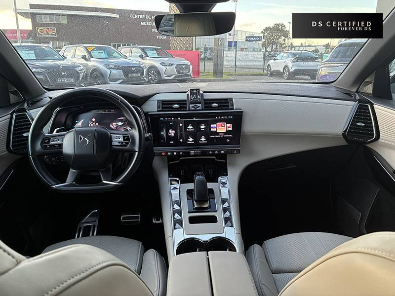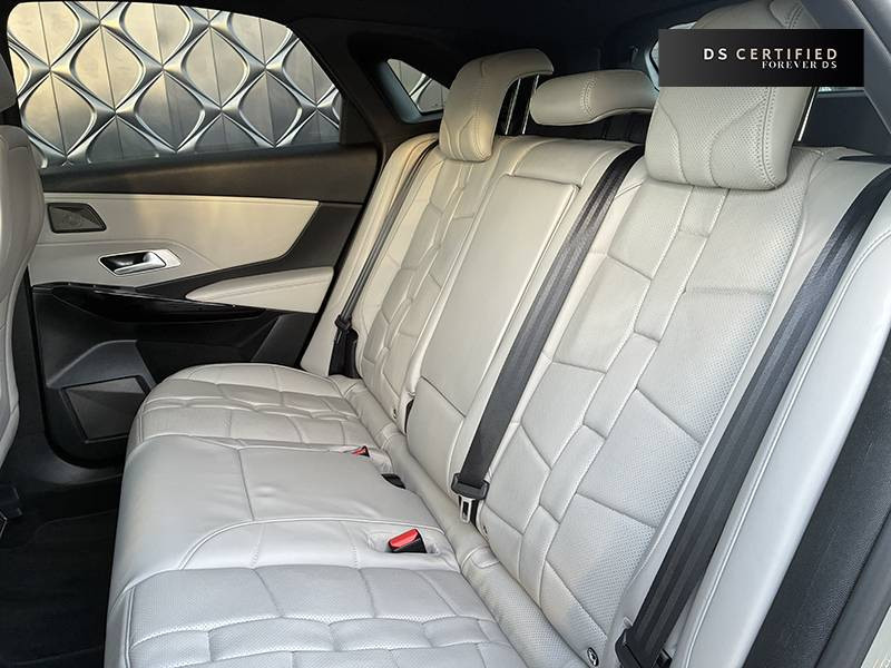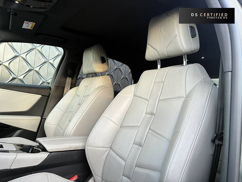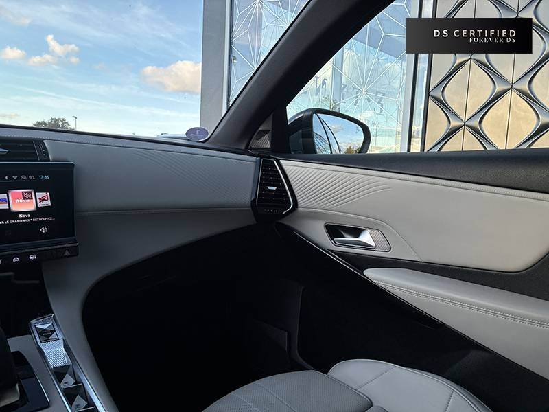 ABS avec répartiteur électronique de freinage (REF) et Aide au Freinage d'Urgence (AFU) + Aide au démarrage en pente / Accès et démarrage mains libres / Accoudoir central en Toile DS avec rangement / Aide au stationnement AV/AR et Caméra de recul / Airbags frontaux (passager déconnectable), latéraux AV, rideaux AV/AR / Alerte Attention Conducteur / Allumage automatique des feux Avec commutation automatique des feux de route / Badge DS chromé sur le capot / Banquette AR électrique / Câble de recharge mode 2 standard 1,8 kW (8 A) / Centre de roue Noir brillant / Chargeur embarqué monophasé de 7,4 kW / Chargeur sans fil pour smartphone + 2 prises USB type C / Climatisation automatique bizone étendue avec tableau de commandes aux places AR et filtre anti-allergènes / Combiné numérique 12.3" HD / Contrôle dynamique de stabilité (ESP) avec antipatinage des roues (ASR) / Détection de sous-gonflage / Double antennes / Double canule d'échappement chromée / DS Active Scan Suspension / DS Drive Assist / DS IRIS SYSTEM Système d'infotainment personnalisable de dernière génération / DS PIXEL LED VISION 3.0 / DS Wings chromées / Eclairage d'accueil et d'accompagnement / Eclairage de cave à pieds à LED / Eclairage PolyAmbient / Ecran tactile capacitif 12,3'' HD / Entourage des vitres latérales chromé / Essuie-vitre AV à déclenchement et cadencement automatiques + Buses de lavage / Feux AR 3D (traitement écailles) Avec indicateur de changement de direction défilant / Fixations ISOFIX à la place passager AV et aux places latérales AR Inclut TOP TEATHER / Freinage d'urgence automatique piloté par caméra et radar / Frein de stationnement électrique automatique / Grille de calandre noir brillant avec pampilles chromées / Hayon motorisé avec accès bras chargés / Jantes alliage 19'' EDINBURGH, pneus 235/50 R19 V / Jonc supérieur de volet Noir brillant avec lettrage 'DS AUTOMOBILES' chromé / Jonc sur jupe AR chromé / Kit de dépannage / Lève-vitres AV/AR électriques, séquentiels et avec fonction antipincement / Mirror Screen sans fil via Wifi Compatible Apple CarPlay et Android Auto / Monogrammes AR chromé / Montre rotative B.R.M. R180 / Navigation 3D Connectée Information trafic en temps réel, prix des carburants,parkings et Zones de Danger.3 ans inclus / Pare-brise chauffant / Pare-brise teinté acoustique / Pédalier et le repose-pied aluminium / Poignées extérieures couleur caisse avec insert chromé / Préconditionnement thermique de l'habitacle programmable par smartphone Via MyDS App / Prédisposition Plancher modulable à 2 positions / Prises 12 V 1 prise dans le rangement AV de la console centrale et 1 prise dans le coffre / Prises USB 2 prises USB type C dans le rangement de la console centrale et 2 prises USB type A pour les passagers AR / Rétroviseur intérieur électrochrome sans cadre / Rétroviseurs extérieurs avec embase couleur caisse et coque noir brillant / Rétroviseurs extérieurs électriques dégivrants, rabattables électriquement Fonction électrochrome côté conducteur, Projection au sol du logo DS, Indexéà la marche AR côté passager / Sabot AV chromé / Seuil de coffre chromé / Seuils de portes Trame DS / Sièges AV chauffants, massants et ventilés / Sièges AV électriques Réglage électrique du siège, réglage lombaire pneumatique, réglage mécanique du nez de coussin / SOS & Assistance Service inclus pendant 10 ans / Surtapis AV/AR / Surveillance d'angles morts / Toit ouvrant panoramique électrique Entrebaillant, Ouvrant, Occulteur motorisé / Vérins d'ouverture et de maintien du capot moteur / Vitres latérales feuilletées acoustiques