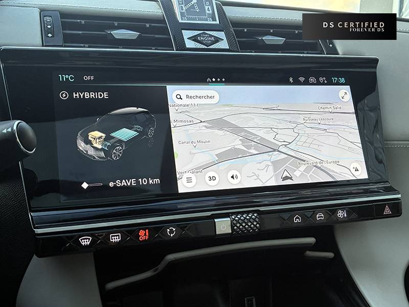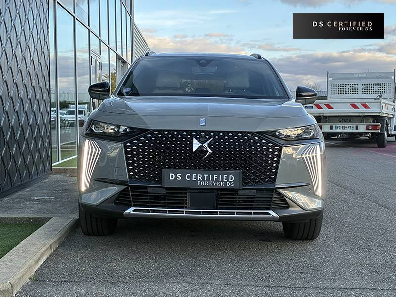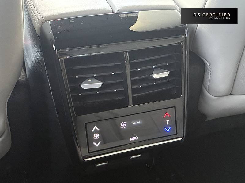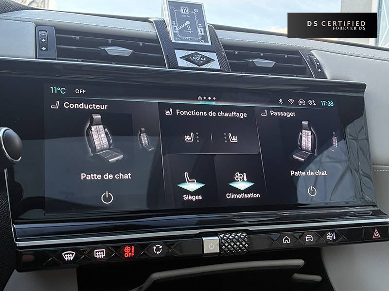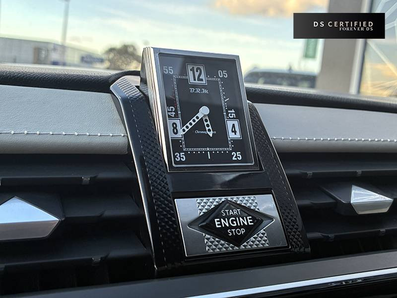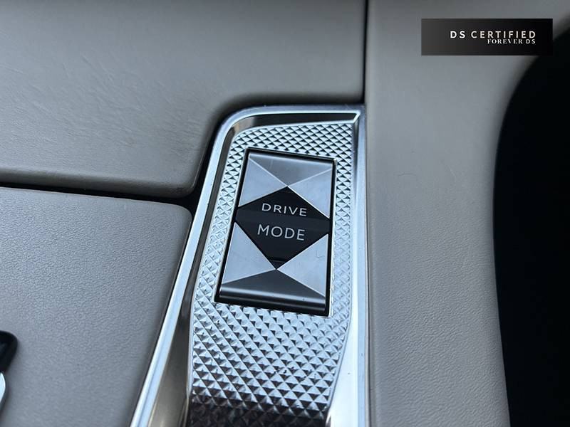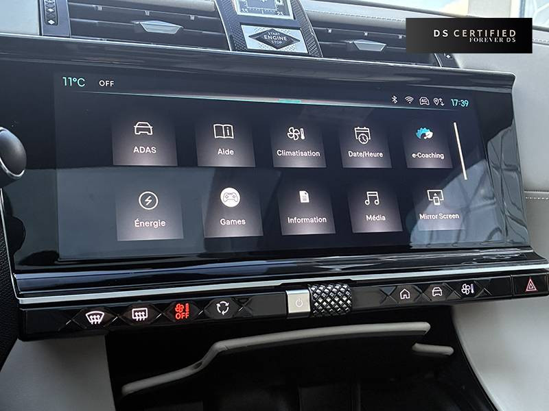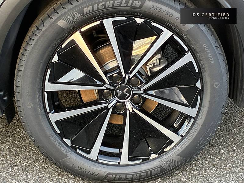 ABS avec répartiteur électronique de freinage (REF) et Aide au Freinage d'Urgence (AFU) + Aide au démarrage en pente / Accès et démarrage mains libres / Accoudoir central en Toile DS avec rangement / Aide au stationnement AV/AR et Caméra de recul / Airbags frontaux (passager déconnectable), latéraux AV, rideaux AV/AR / Alerte Attention Conducteur / Allumage automatique des feux Avec commutation automatique des feux de route / Badge DS chromé sur le capot / Banquette AR électrique / Câble de recharge mode 2 standard 1,8 kW (8 A) / Centre de roue Noir brillant / Chargeur embarqué monophasé de 7,4 kW / Chargeur sans fil pour smartphone + 2 prises USB type C / Climatisation automatique bizone étendue avec tableau de commandes aux places AR et filtre anti-allergènes / Combiné numérique 12.3" HD / Contrôle dynamique de stabilité (ESP) avec antipatinage des roues (ASR) / Détection de sous-gonflage / Double antennes / Double canule d'échappement chromée / DS Active Scan Suspension / DS Drive Assist / DS IRIS SYSTEM Système d'infotainment personnalisable de dernière génération / DS PIXEL LED VISION 3.0 / DS Wings chromées / Eclairage d'accueil et d'accompagnement / Eclairage de cave à pieds à LED / Eclairage PolyAmbient / Ecran tactile capacitif 12,3'' HD / Entourage des vitres latérales chromé / Essuie-vitre AV à déclenchement et cadencement automatiques + Buses de lavage / Feux AR 3D (traitement écailles) Avec indicateur de changement de direction défilant / Fixations ISOFIX à la place passager AV et aux places latérales AR Inclut TOP TEATHER / Freinage d'urgence automatique piloté par caméra et radar / Frein de stationnement électrique automatique / Grille de calandre noir brillant avec pampilles chromées / Hayon motorisé avec accès bras chargés / Jantes alliage 19'' EDINBURGH, pneus 235/50 R19 V / Jonc supérieur de volet Noir brillant avec lettrage 'DS AUTOMOBILES' chromé / Jonc sur jupe AR chromé / Kit de dépannage / Lève-vitres AV/AR électriques, séquentiels et avec fonction antipincement / Mirror Screen sans fil via Wifi Compatible Apple CarPlay et Android Auto / Monogrammes AR chromé / Montre rotative B.R.M. R180 / Navigation 3D Connectée Information trafic en temps réel, prix des carburants,parkings et Zones de Danger.3 ans inclus / Pare-brise chauffant / Pare-brise teinté acoustique / Pédalier et le repose-pied aluminium / Poignées extérieures couleur caisse avec insert chromé / Préconditionnement thermique de l'habitacle programmable par smartphone Via MyDS App / Prédisposition Plancher modulable à 2 positions / Prises 12 V 1 prise dans le rangement AV de la console centrale et 1 prise dans le coffre / Prises USB 2 prises USB type C dans le rangement de la console centrale et 2 prises USB type A pour les passagers AR / Rétroviseur intérieur électrochrome sans cadre / Rétroviseurs extérieurs avec embase couleur caisse et coque noir brillant / Rétroviseurs extérieurs électriques dégivrants, rabattables électriquement Fonction électrochrome côté conducteur, Projection au sol du logo DS, Indexéà la marche AR côté passager / Sabot AV chromé / Seuil de coffre chromé / Seuils de portes Trame DS / Sièges AV chauffants, massants et ventilés / Sièges AV électriques Réglage électrique du siège, réglage lombaire pneumatique, réglage mécanique du nez de coussin / SOS & Assistance Service inclus pendant 10 ans / Surtapis AV/AR / Surveillance d'angles morts / Toit ouvrant panoramique électrique Entrebaillant, Ouvrant, Occulteur motorisé / Vérins d'ouverture et de maintien du capot moteur / Vitres latérales feuilletées acoustiques