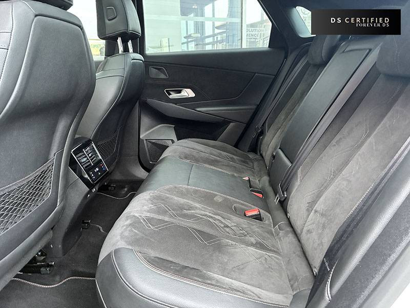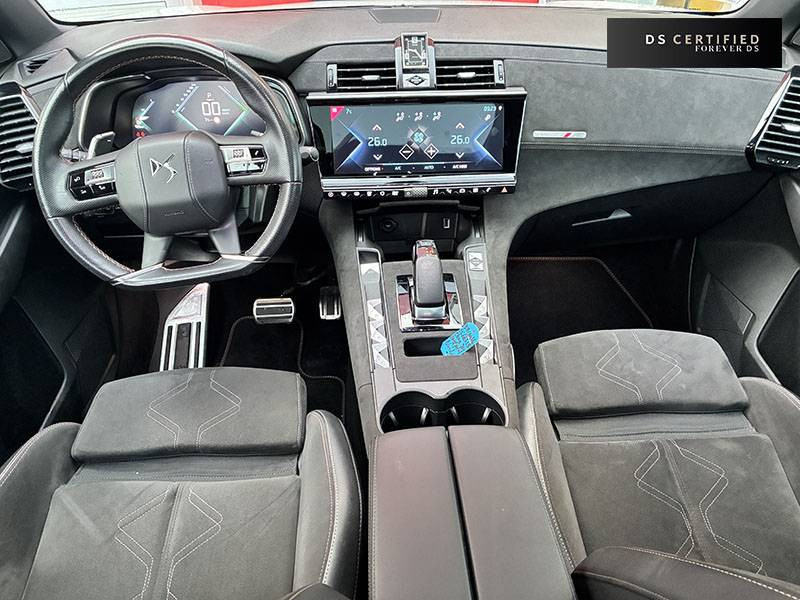 ABS, AFU, ESP, REF / Accès et démarrage mains libres / Aide au stationnement AV et AR avec Caméra de recul / Airbags frontaux aux places AV avec désactivation par clé de l'airbag passager / Airbags latéraux de type "thorax" aux places AV / Alerte Attention Conducteur / Allumage automatique des feux de détresse en cas de forte décélération / Antenne radio intégrée dans la lunette AR / Aumônières de dos sur les sièges AV / Avertisseur bi-ton / Badge de planche de bord "DS PERFORMANCE Line" / Badges latéraux sur portes AV PERFORMANCE Line / Banquette AR 2/3 - 1/3 avec 3 appuie-tête / Banquette AR 2/3 - 1/3 permettant un plancher plat / Banquette AR inclinable électriquement / Barres de toit noires brillantes / Câble de recharge mode 2 standard 1,8 kW (8 A) / Calandre surmontée de l'emblème E-TENSE / Chargeur pour une recharge plus rapide de la batterie / Chargeur sans fil / Clignotants impulsionnels 3 coups / Climatisation avec aérateurs aux places AR / Combiné numérique 12" / Commutation automatique des feux de route / Contrôle de traction intelligent / Contrôle dynamique de stabilité (ESP) avec antipatinage des roues (ASR) / Coques de rétroviseurs extérieurs Noir Perla Nera / Crochet d'arrimage dans le coffre au dessus du plancher de coffre x4 / Démarrage Mains-Libres avec décor Carmin sur la clé / Détection de sous-gonflage / Double canule d'échappement chromée / DS ACTIVE LED VISION / DS CONNECT NAV avec radio numérique / Eclairage à LED / Eclairage d'accompagnement automatique / Eclairage d'accueil à l'ouverture du véhicule / Eclairage d'accueil automatique / Eclairage d'ambiance intégral à LED / Ecran tactile 12" avec menu spécifique E-TENSE / Entourage des vitres latérales chromé / Essuie-vitre AV à déclenchement et cadencement automatiques / Filtre à odeurs avec charbon actif / Filtre à pollen / Fixations ISOFIX à la place passager AV et aux places latérales AR / Frein de stationnement électrique automatique / Grille de calandre noir brillant / Guide utilisateur numérique / Hayon motorisé / Indicateur de changement de rapport / Indicateur de rapports engagés / Intérieur Alcantara Noir / Jonc sur volet Noir paillete texture et bouclier AR chromé / Kit de dépannage provisoire de pneumatiques / Lève-vitres AV et AR électriques avec fonction antipincement / Mirror Screen / Montre B.R.M. R180 / Navigation / Ouverture et fermeture des vitres à distance / Pack Modularité / Pack Sécurité / Panneaux de portes en alcantara / Pare-brise teinté et acoustique / Pare-soleil rembourrés avec éclairage à LED / Pédalier et le repose-pied aluminium / Pieds de rétroviseurs extérieurs couleur carrosserie / Planche de bord en alcantara / Planche de coffre avec zone de rangement intégrée pour le câble de recharge / Poignées de portes couleur carrosserie / Prises USB x2 aux places AR / Prise USB Data à l'AV / Reconnaissance vocale / Rehausse de siège conducteur et passager active / Rétroviseur intérieur électrochrome sans cadre / Rétroviseurs extérieurs rabattables électriquement et indexés à la marche AR avec projection au sol du logo DS / Sabot AV finition Gris Aluminium / Sangle de coffre / Seuil de coffre chromé / Seuils de portes AV DS PERFORMANCE Line / Siège conducteur électrique avec mémorisation de position de conduite / Sièges AV avec réglages lombaires électriques / Signature E-TENSE 4x4 sur le hayon / SOS & Assistance / Surtapis AV/AR / Surtapis AV/AR siglé DS PERFORMANCE LINE / Système audio Analogique à 8 HP avec prise USB et Bluetooth / Système sonore polyphonique / Témoin et alerte sonore de non-bouclage des ceintures de sécurité AV/AR / Trappe de recharge côté gauche / Vérins d'ouverture et de maintien du capot moteur / Verrouillage automatique des portes en roulant / Vitres latérales AV et AR surteintées et feuilletées / Volant Cuir gainé main avec commandes intégrées / Zone De Danger