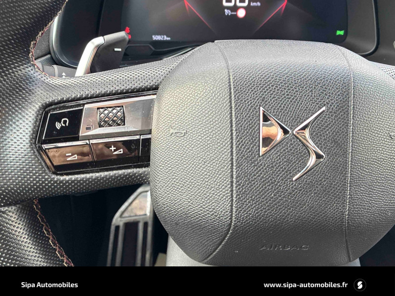 Aide au stationnement AV et AR avec Caméra de recul / DS CONNECT NAV / Eclairage à LED / Frein de stationnement électrique / Pare-soleil rembourrés avec éclairage à LED / Pédalier et le repose-pied aluminium / Rétroviseurs extérieurs électriques dégivrants avec sonde de température et répétiteurs de clignotants à LED / Verrouillage automatique des portes en roulant / Volant Cuir gainé main avec commandes intégrées / ABS, AFU, ESP, REF / Accès et démarrage mains libres / Airbags frontaux, latéraux et rideaux aux places AV et rideaux aux places AR / Alerte Attention Conducteur / Antenne radio intégrée dans la lunette AR / Aumônières de dos sur les sièges AV / Avertisseur bi-ton / Banquette AR 2/3 - 1/3 permettant un plancher plat / Chargeur sans fil / Combiné numérique 12" / Contrôle de traction intelligent / Contrôle dynamique de stabilité (ESP) avec antipatinage des roues (ASR) / Coques de rétroviseurs extérieurs Noir Perla Nera / Crochet d'arrimage dans le coffre au dessus du plancher de coffre x4 / DS Connect Box / DS Sensorial Drive / Démarrage Mains-Libres avec décor Carmin sur la clé / Détection de sous-gonflage / Eclairage d'accueil à l?ouverture du véhicule / Entourage des vitres latérales chromé / Filtre à odeurs avec charbon actif / Filtre à pollen / Fixations ISOFIX à la place passager AV et aux places latérales AR / Guide utilisateur numérique / Indicateur de changement de rapport / Kit de dépannage provisoire de pneumatiques / Lève-vitres AV et AR électriques avec fonction antipincement / Mirror Screen / Montre B.R.M. R180 / Ouverture et fermeture des vitres à distance / Pare-brise teinté et acoustique / Pieds de rétroviseurs extérieurs couleur carrosserie / Planche de bord en alcantara / Poignées de portes couleur carrosserie / Prises USB x2 aux places AR / Reconnaissance vocale / Rehausse de siège conducteur et passager active / Réglages lombaires électriques côté conducteur / Rétroviseur intérieur électrochrome sans cadre / Rétroviseurs extérieurs rabattables électriquement et indexés à la marche AR avec projection au sol du logo DS / Sangle de coffre / Surtapis AV/AR siglé DS PERFORMANCE LINE / Système audio Analogique à 8 HP avec prise USB et Bluetooth / Système sonore polyphonique / Témoin et alerte sonore de non-bouclage des ceintures de sécurité AV/AR / Vérins d'ouverture et de maintien du capot moteur